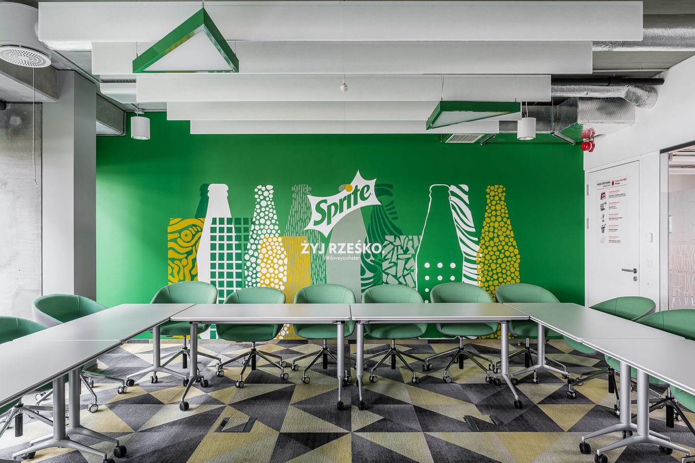For the room inspired by Sprite, we selected light EcoBaffle panels. The open grid ceiling system is broken by contrasting green lamps. This solution adds lightness to the entire room and works perfectly where ventilation or air conditioning systems need to be considered. Green EcoWall walls with a strong, graphic brand motif directly reference the refreshing character of the beverage. It is an ideal space for creative meetings, brainstorming sessions, and conversations that have the same 'breath' as the Sprite brand communication.