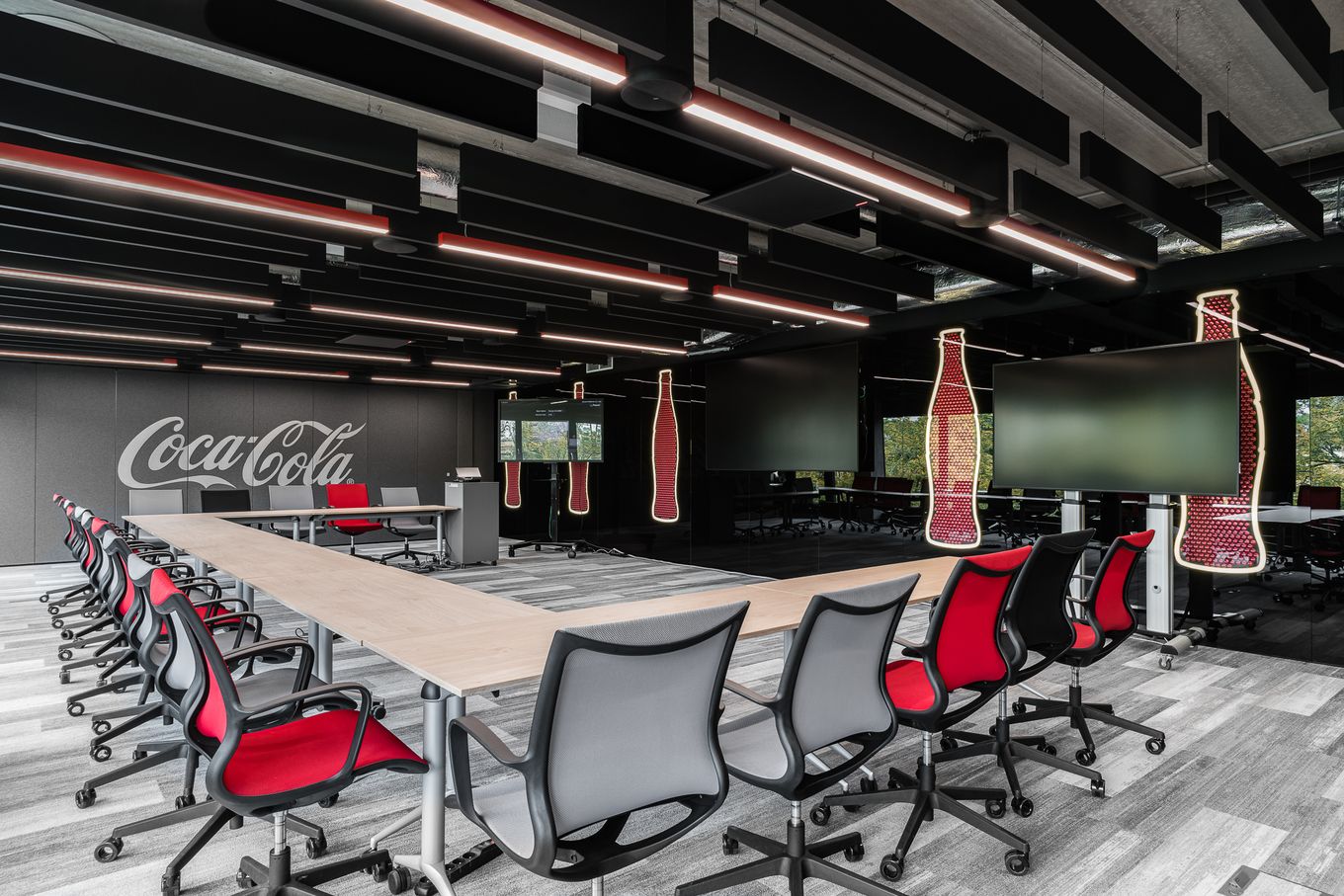 Walls finished using EcoWall in graphite color provide a neutral background for the iconic Coca-Cola logo and the red accents of the furniture.