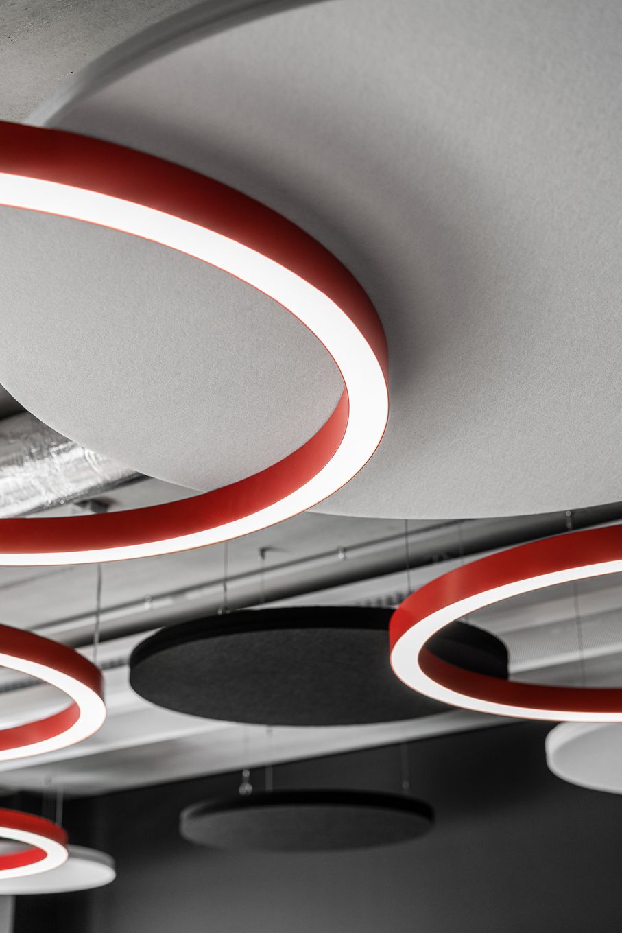 EcoBaffleBox in deep black, slender elements combined with linear lighting visually organize the ceiling space and give the interior a bit of an industrial character.