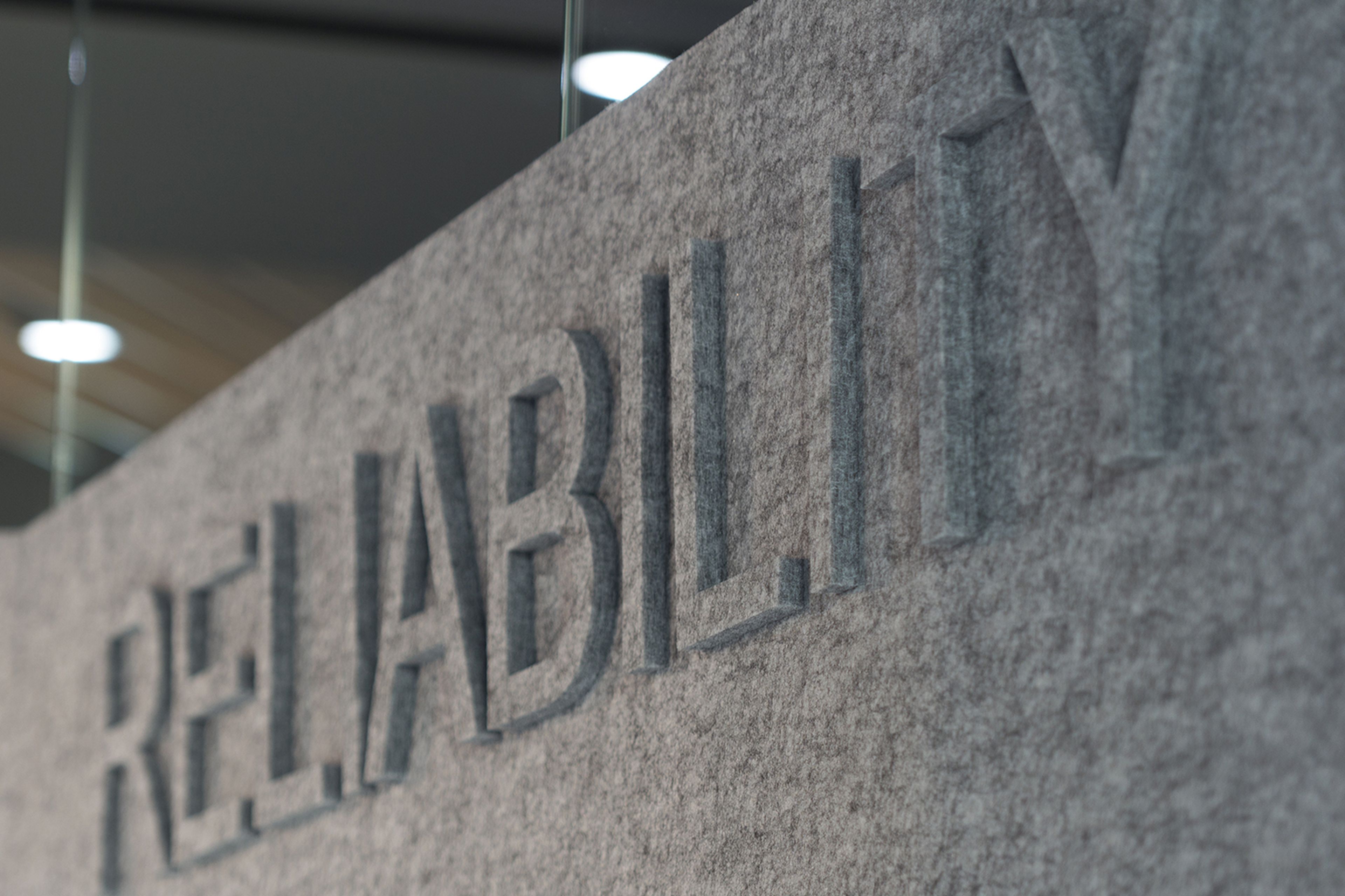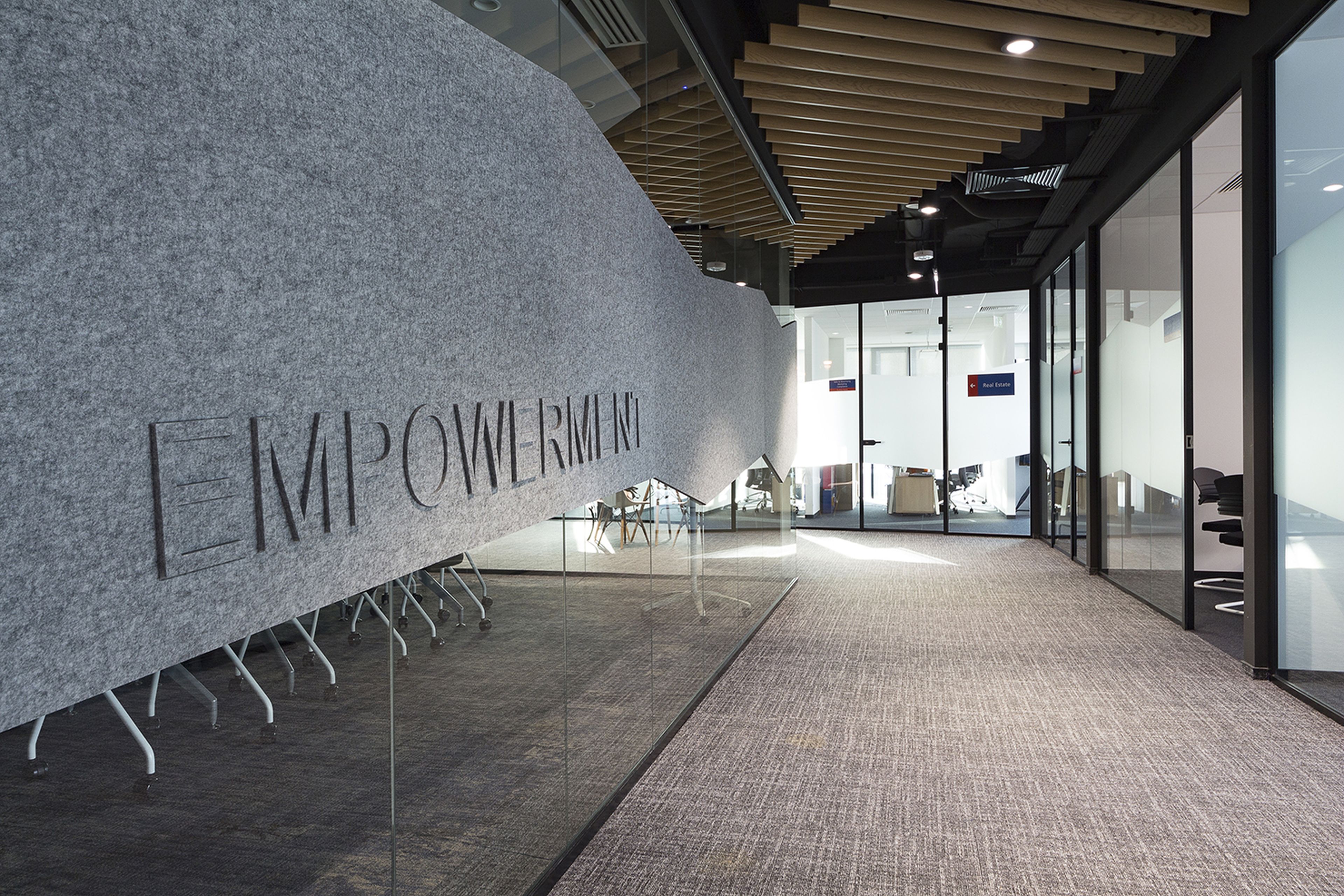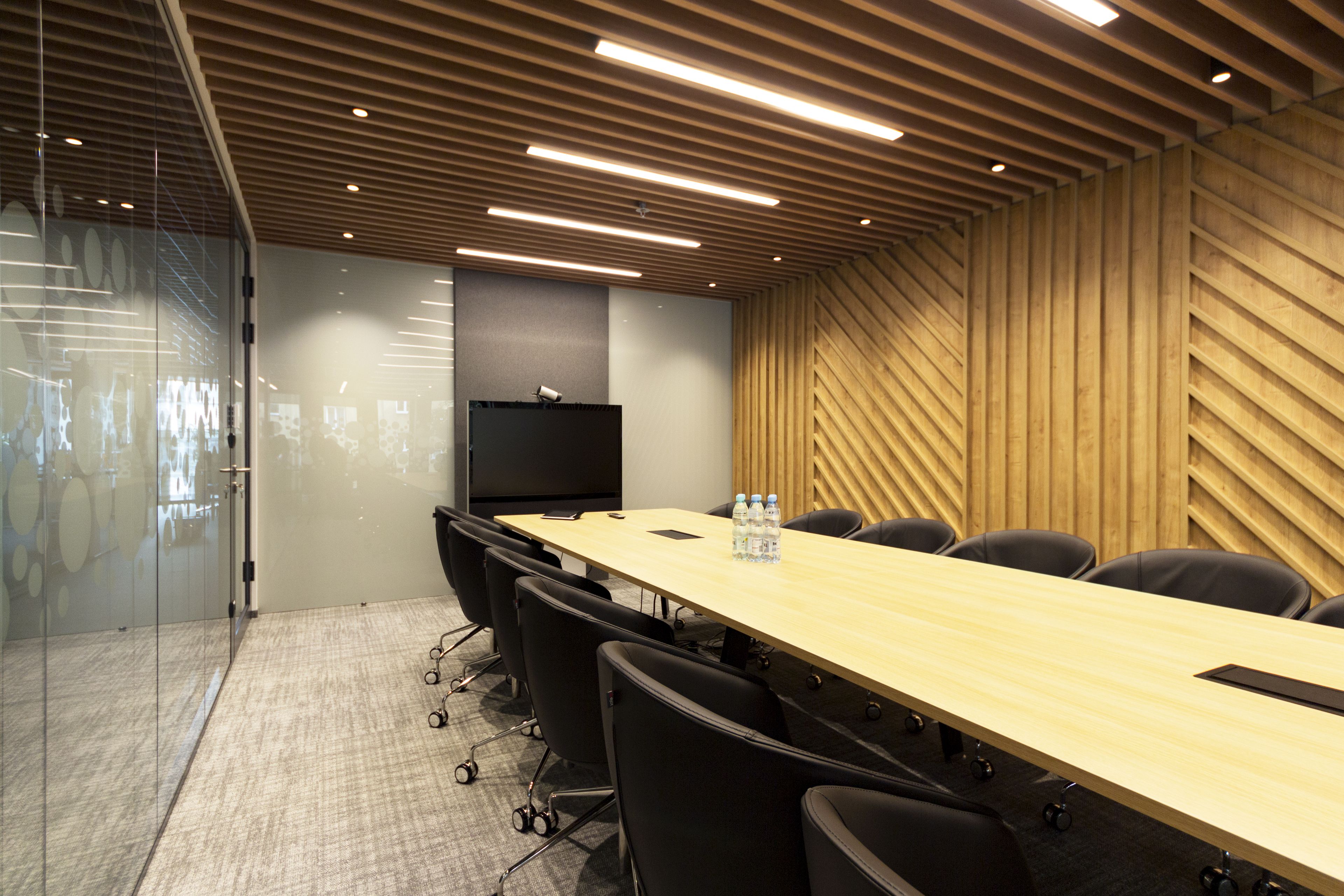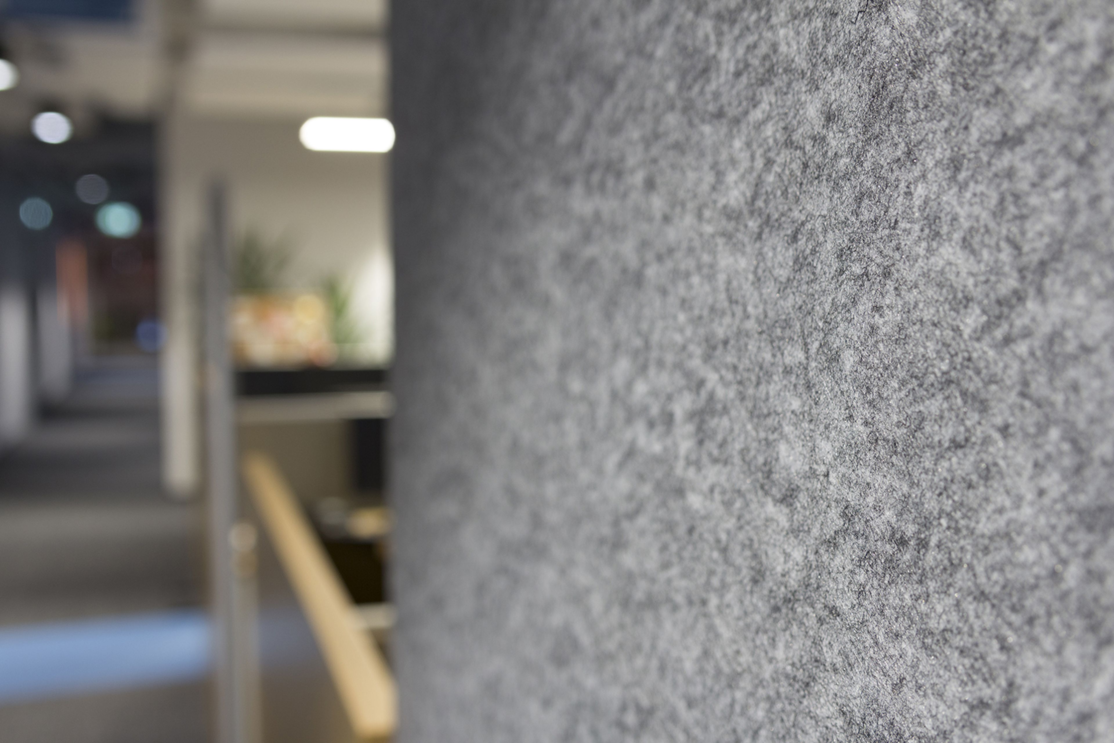 The conference rooms were fitted with EcoWall Custom panels with individually designed shapes and cut-out inscriptions. The gray panels with a spatial structure are a strong graphic accent and also dampen sounds reflecting off the glass walls, which significantly improves acoustic comfort in communication corridors.