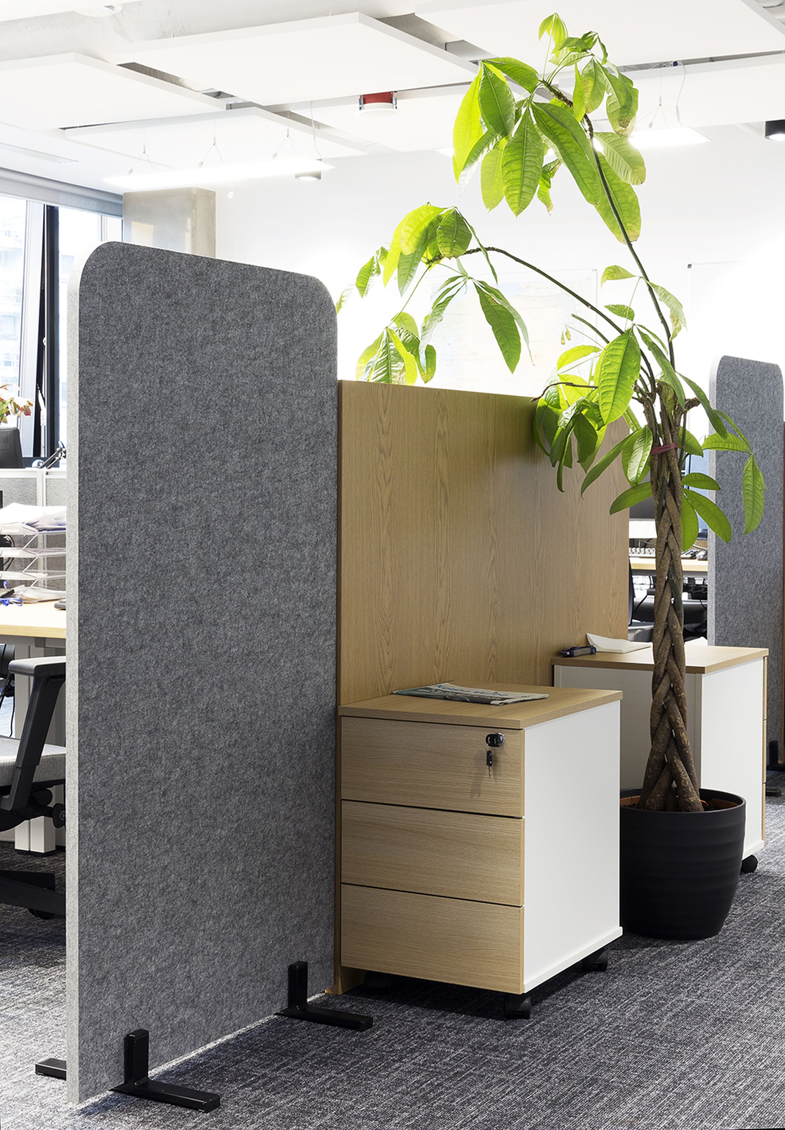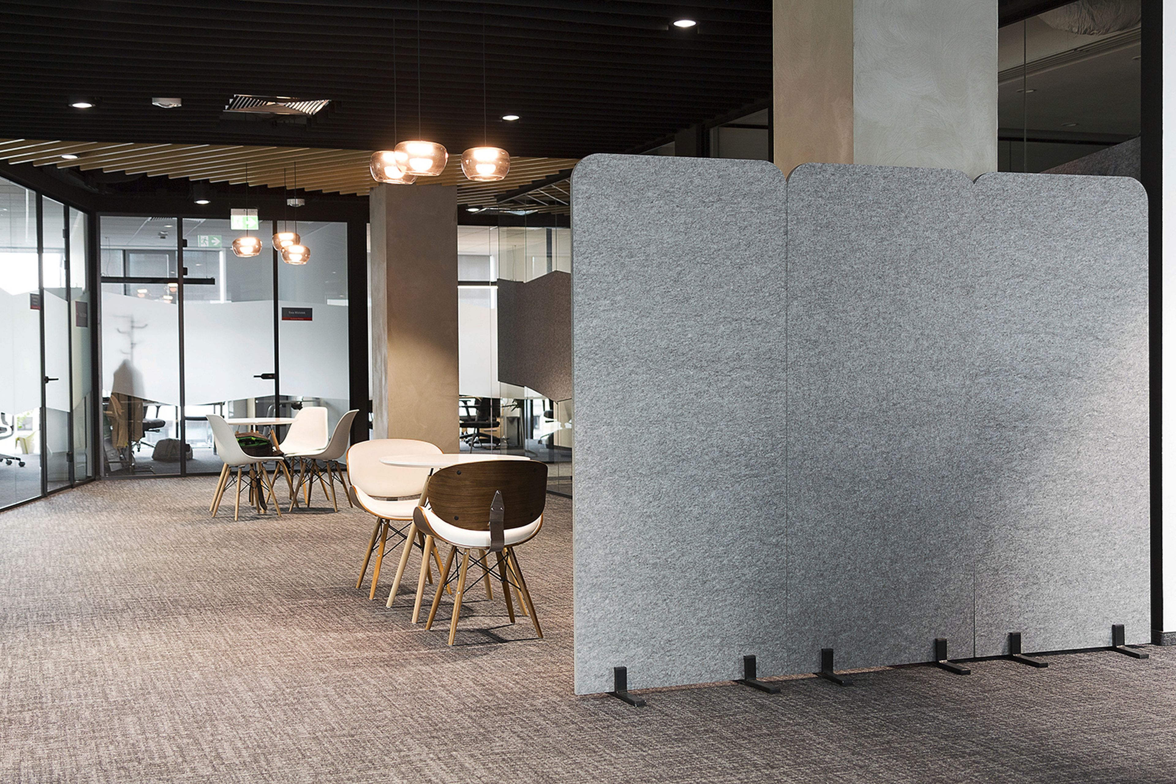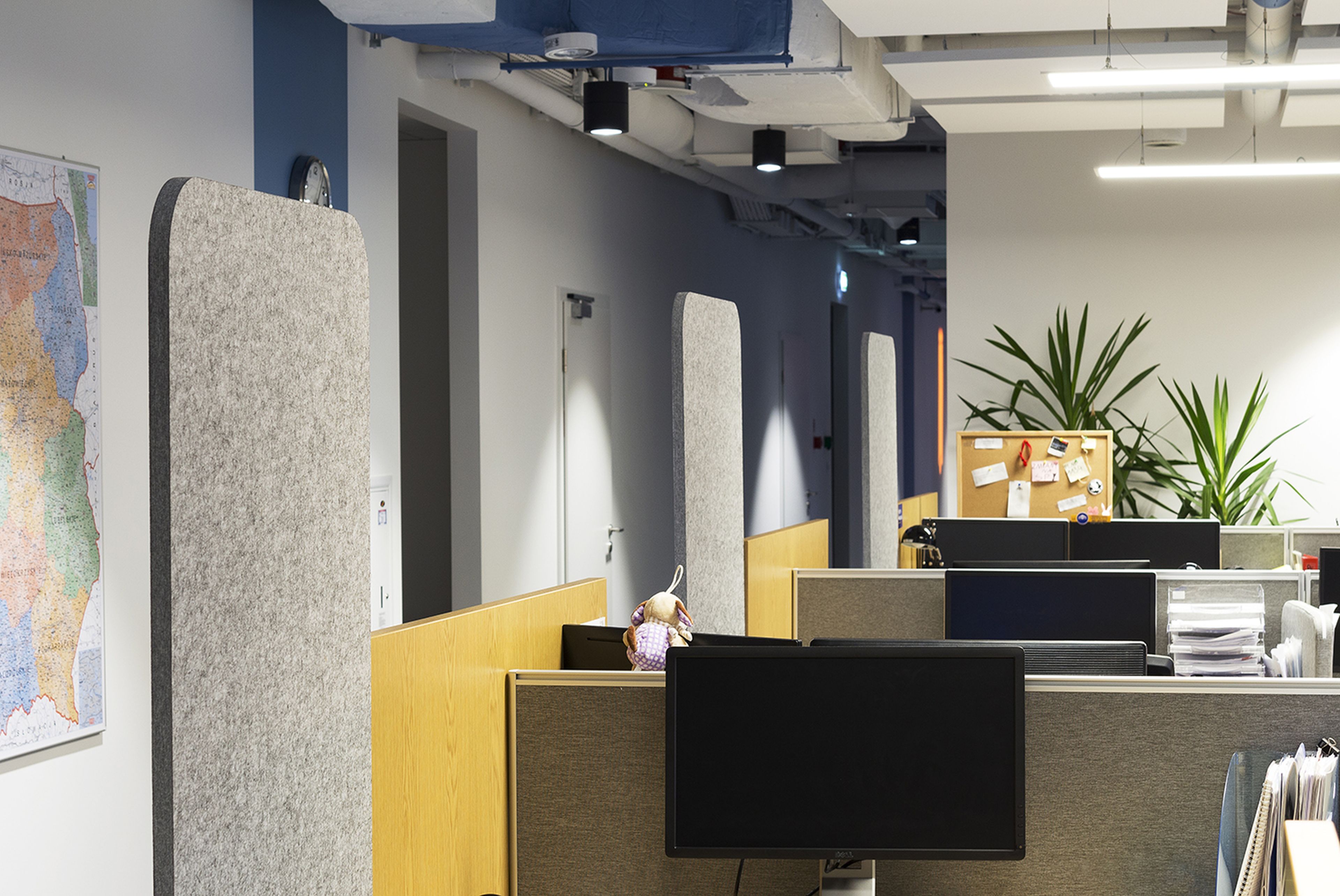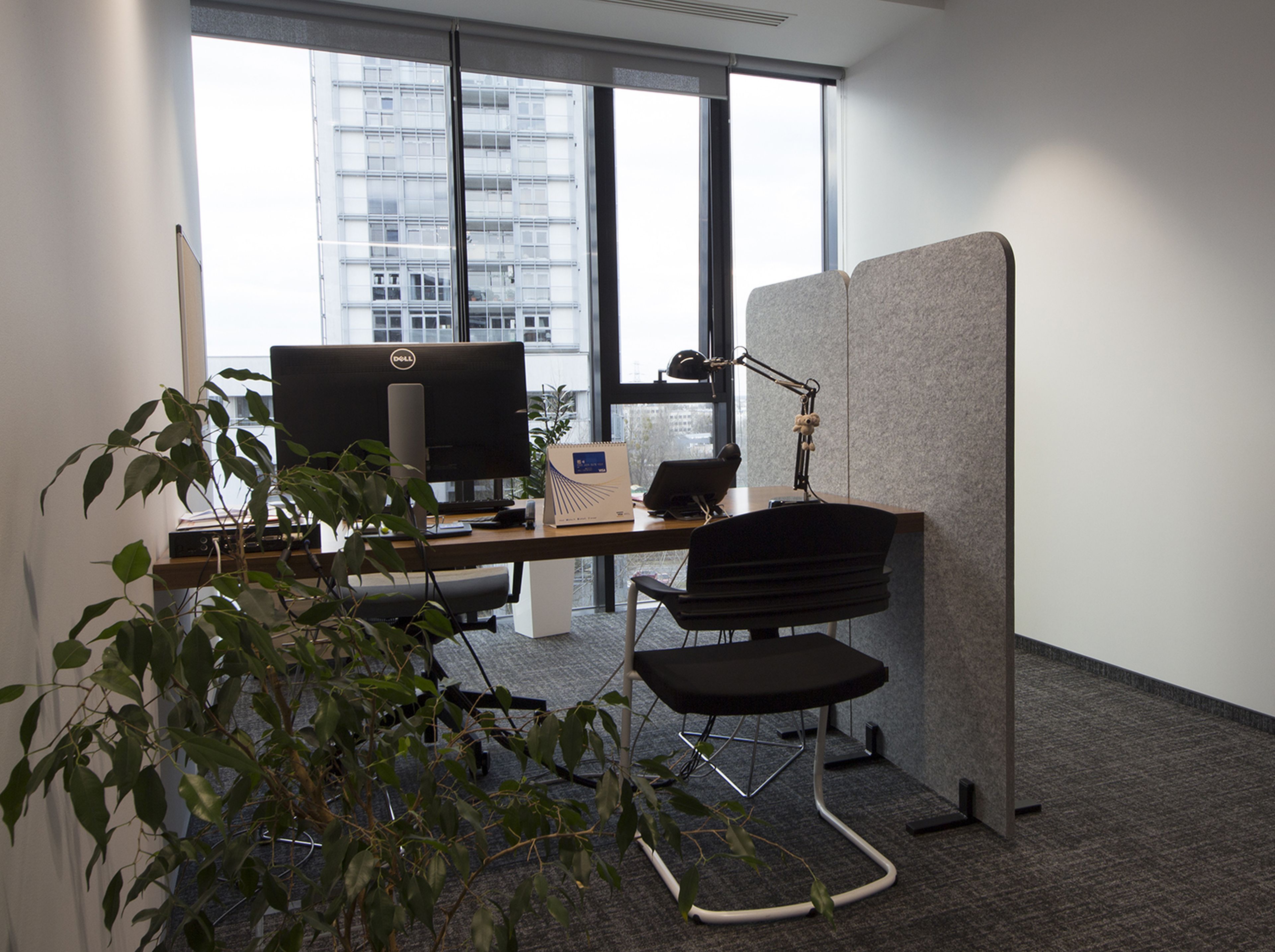 In the open space between workstations, free-standing Ecoscreen Floor screens appeared to separate desks, ensuring privacy while additionally absorbing sounds from phone conversations and the operation of office devices. Thanks to their mobile design, they can be easily moved and adjusted to changing spatial arrangements. The acoustic systems implemented allowed for reducing reverberation, improving speech clarity, and creating conditions conducive to concentration and conceptual work.