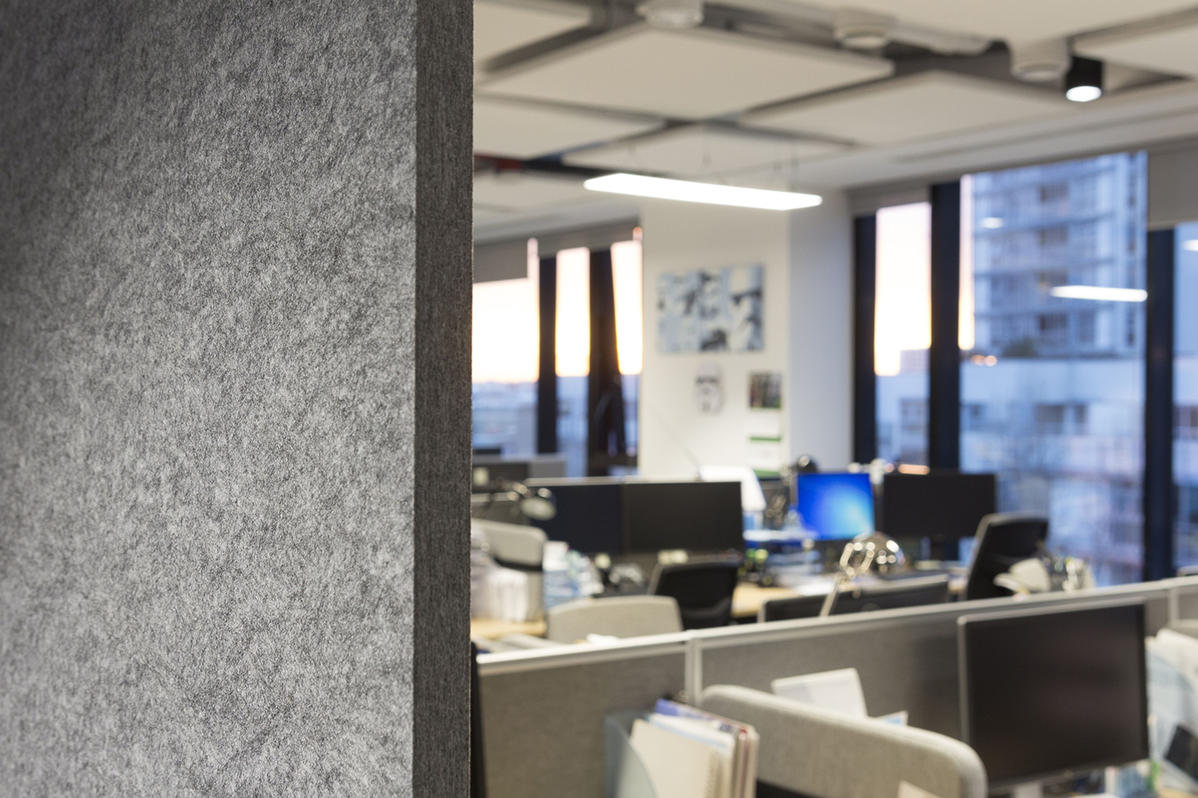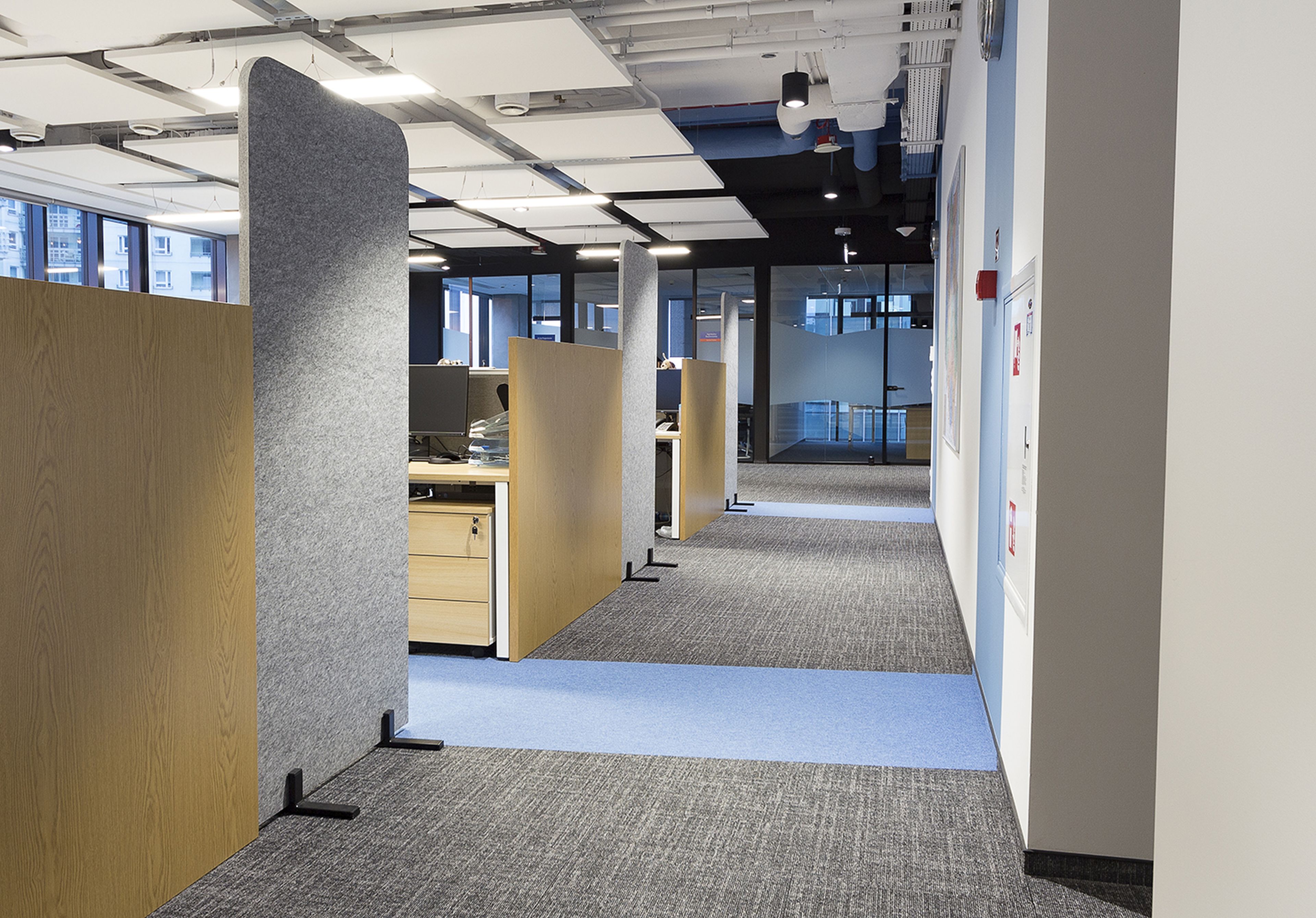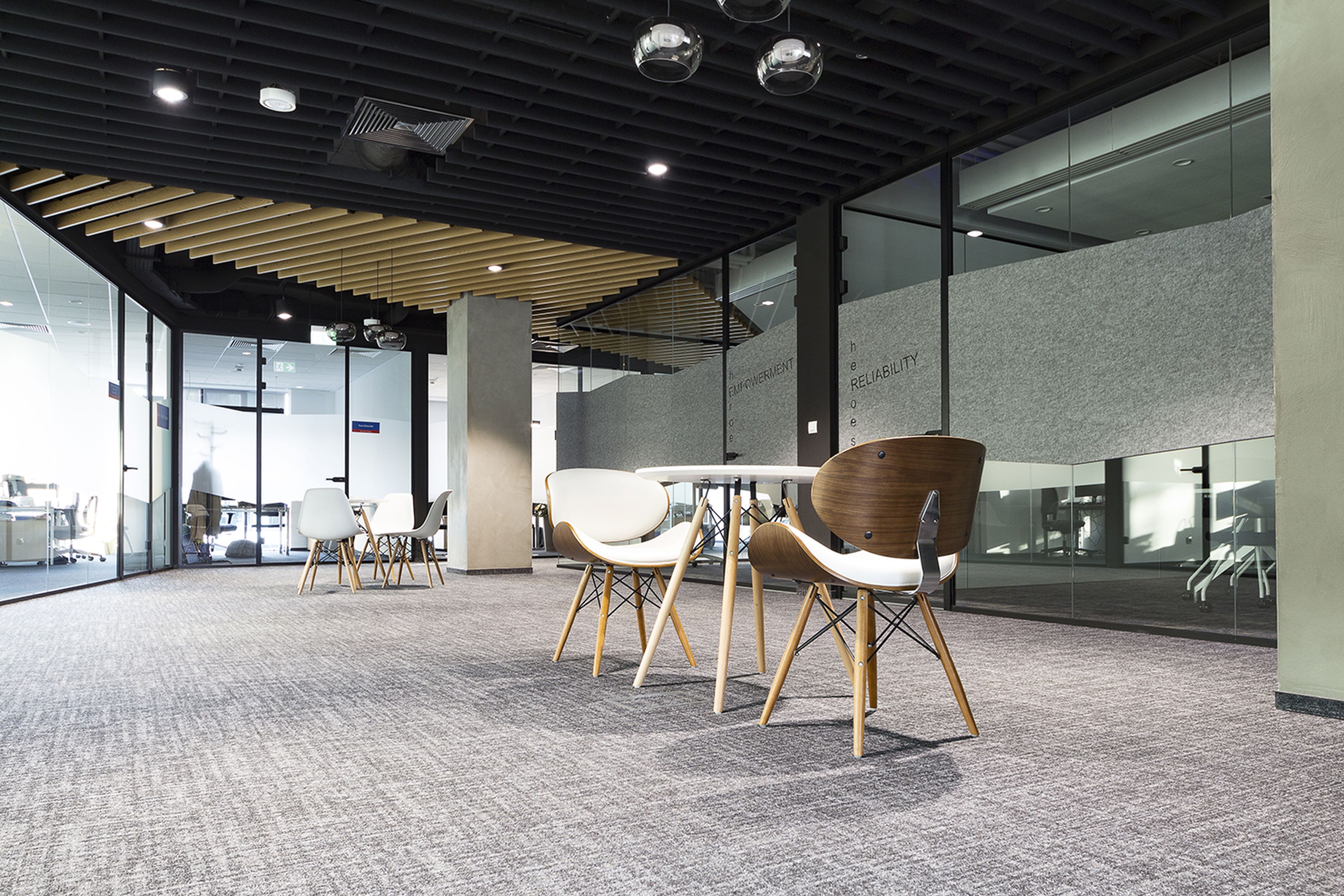 The biggest acoustic challenge in adapting the Euronet Polska office was taming the noise characteristic of large, open spaces, amplified by the glass corridors. The conditions required non-standard solutions, which is why we decided to integrate several of our top acoustic systems.