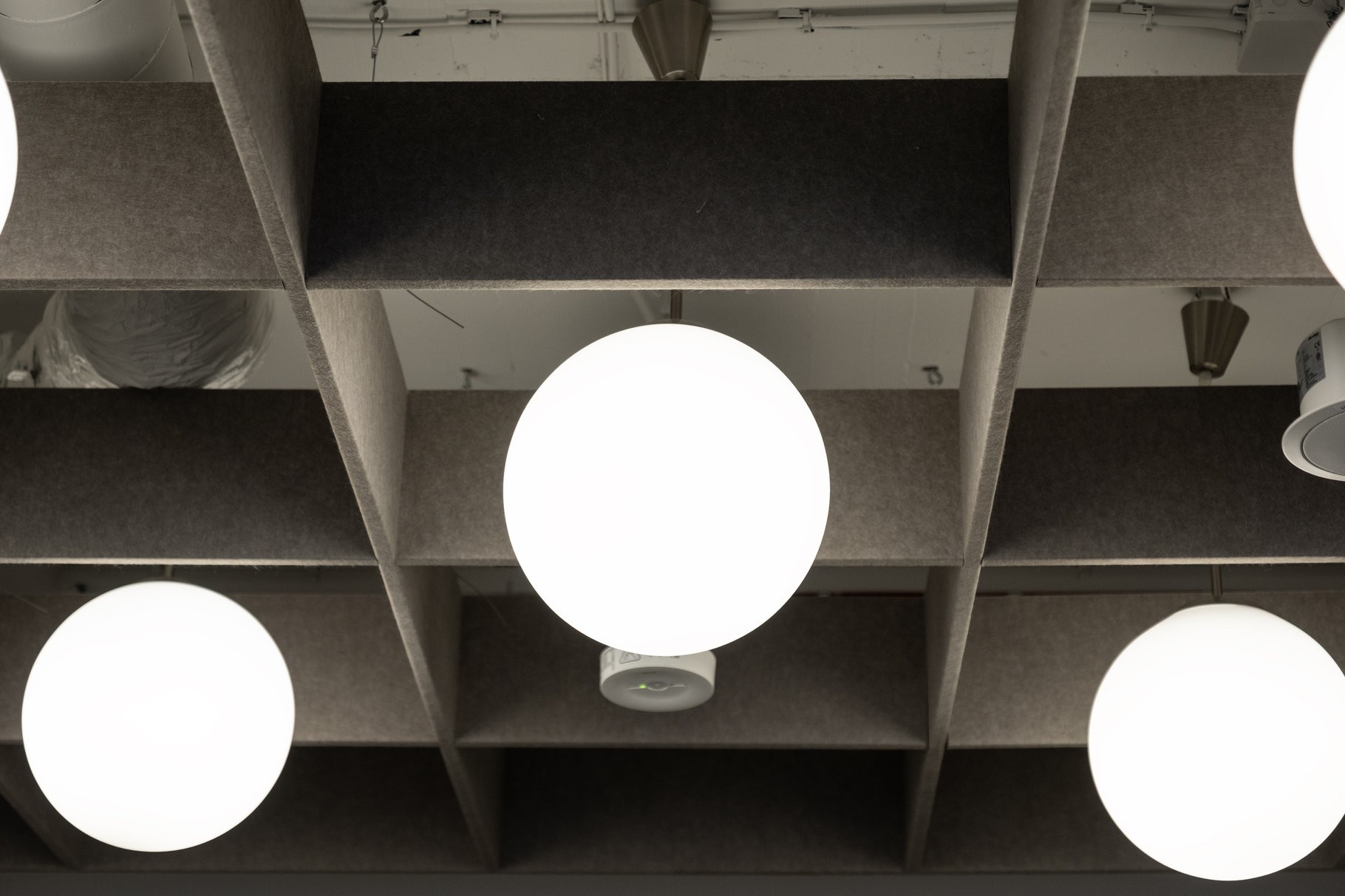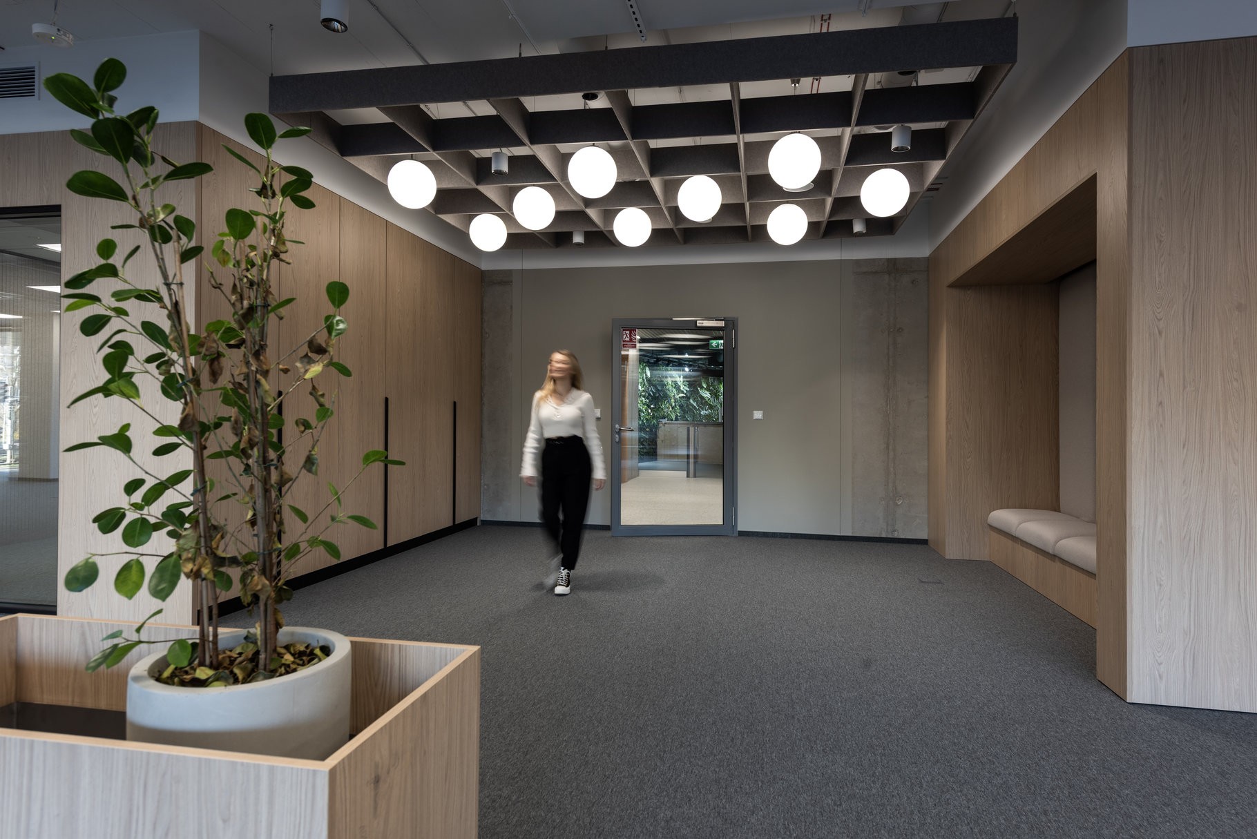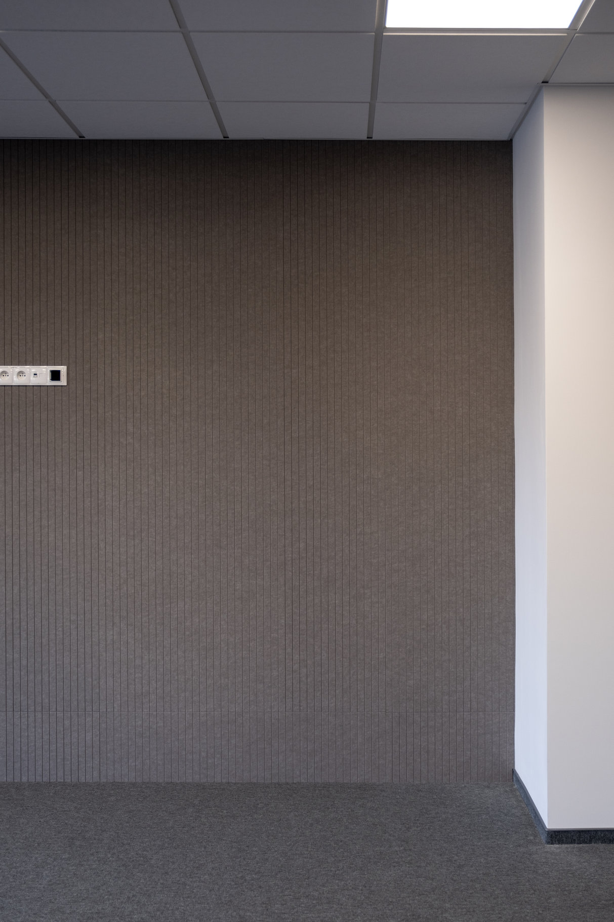 For the acoustic adaptation of the walls, we used the linear EcoStripes system. The arrangement of vertical panels emphasizes the modern character of the interior, and their acoustic absorbency helps to dampen sounds occurring in transitional spaces and in areas for individual work. EcoStripes give the interior a cozy feel without visually overwhelming it, introducing a pleasant softness.