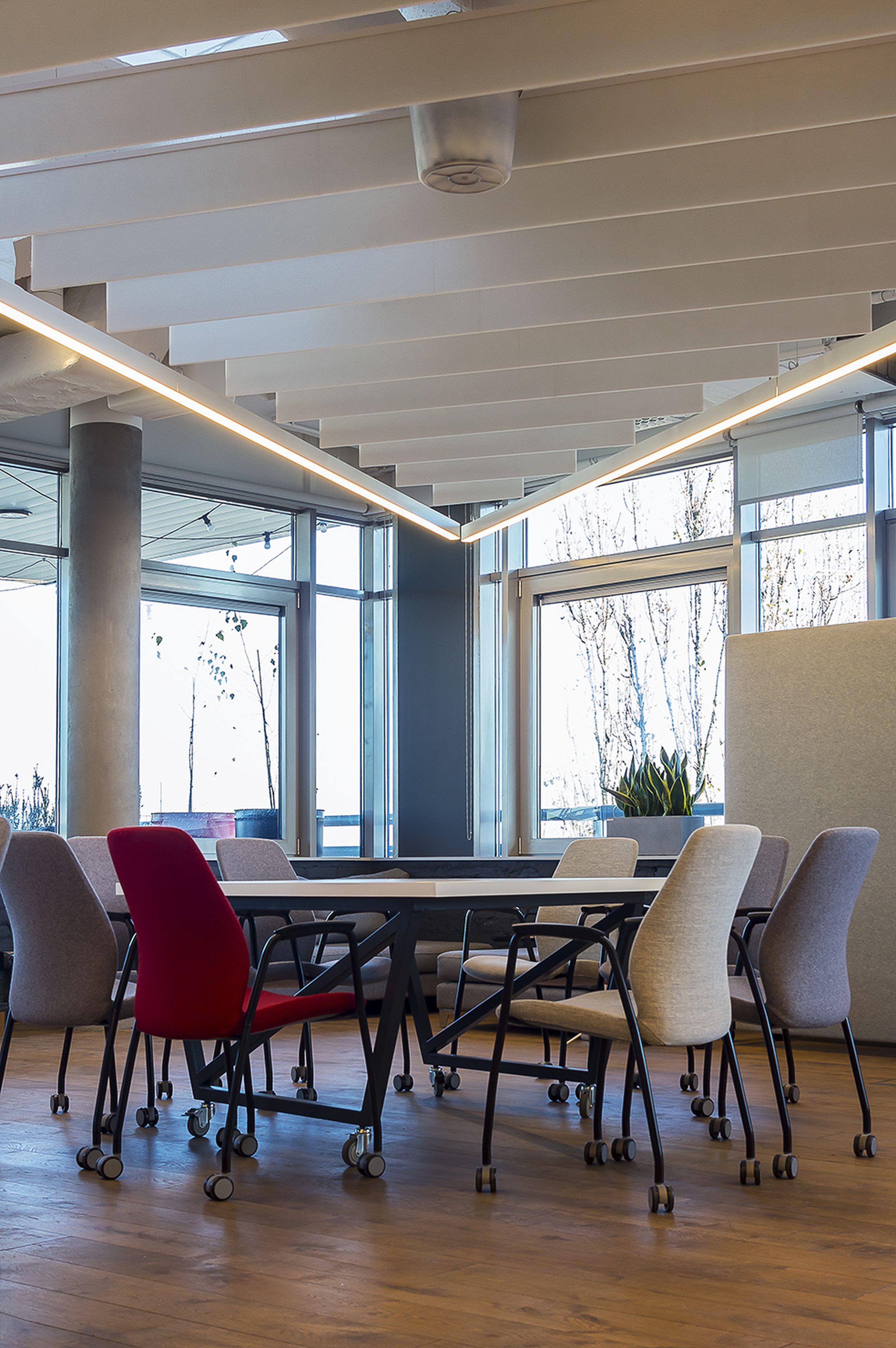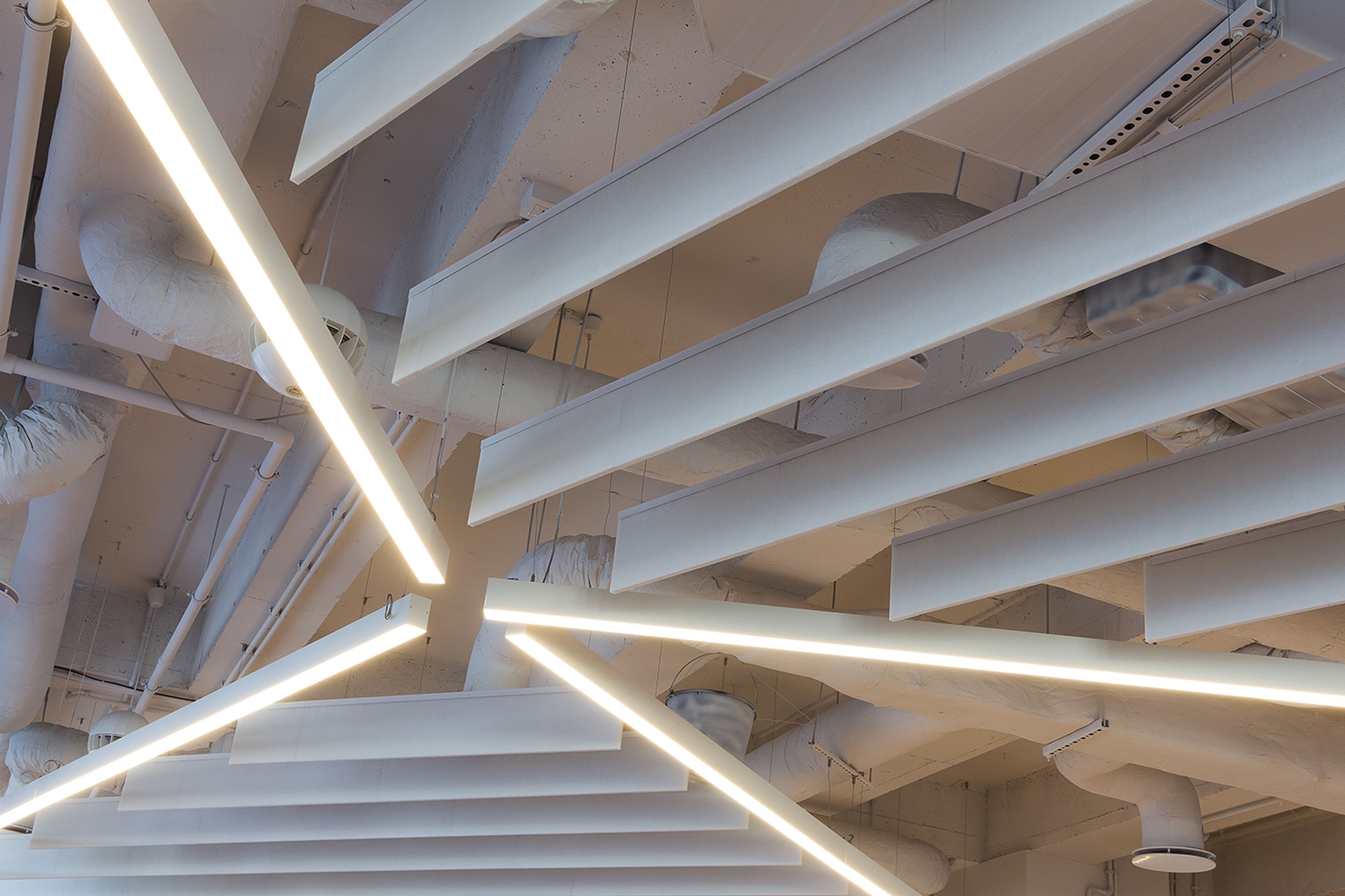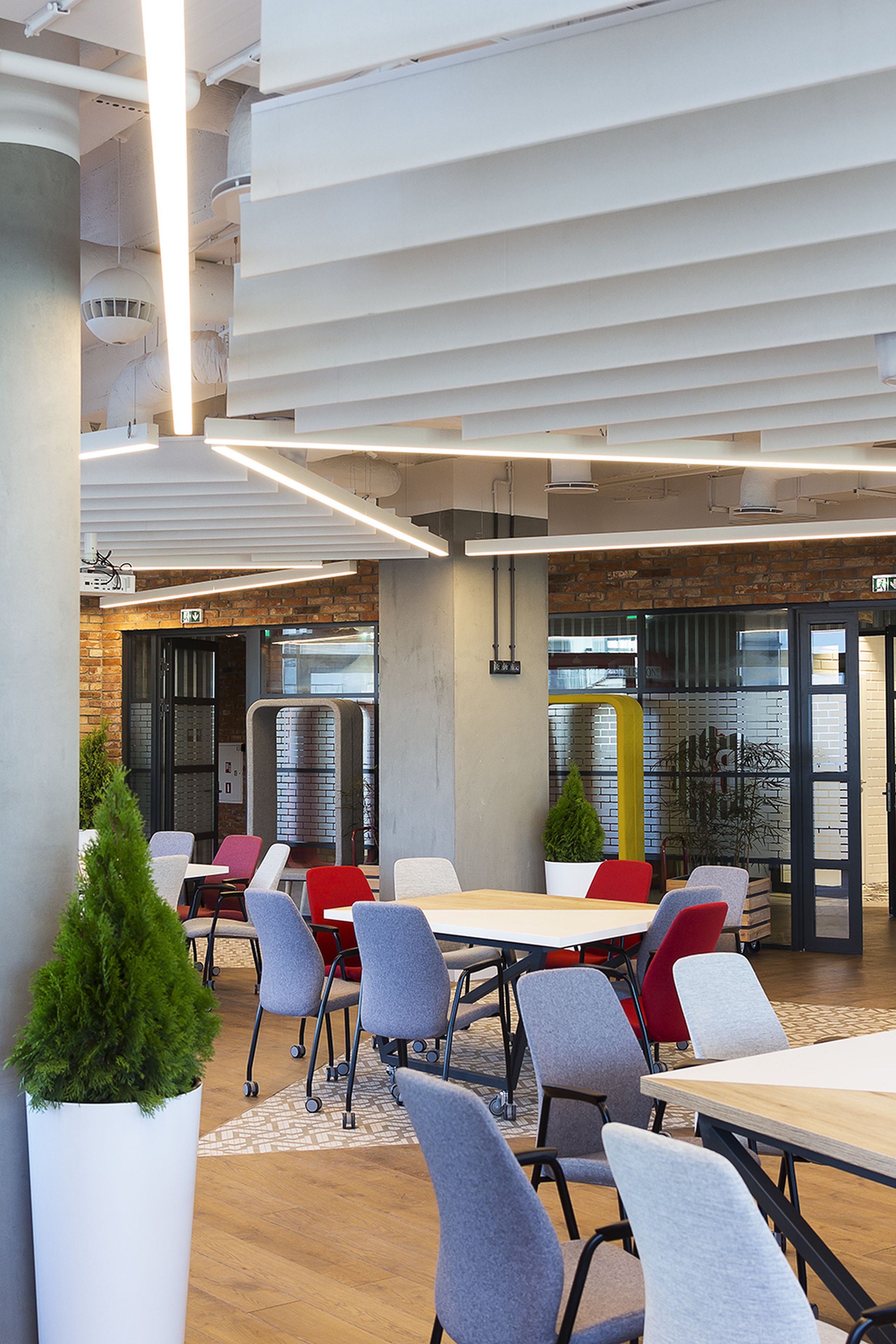 Zastosowanie EcoBaffle wyraźnie ograniczyło pogłos i rozprzestrzenianie się hałasu, co w przestrzeni coworkingowej ma kluczowe znaczenie dla koncentracji i komfortu pracy użytkowników. System pozwala zachować otwarty charakter biura, jednocześnie akustycznie stabilizując strefy pracy indywidualnej, spotkań czy wydarzeń. Geometryczny układ paneli w Brain Embassy współgra z liniowym oświetleniem, tworząc spójną kompozycję.