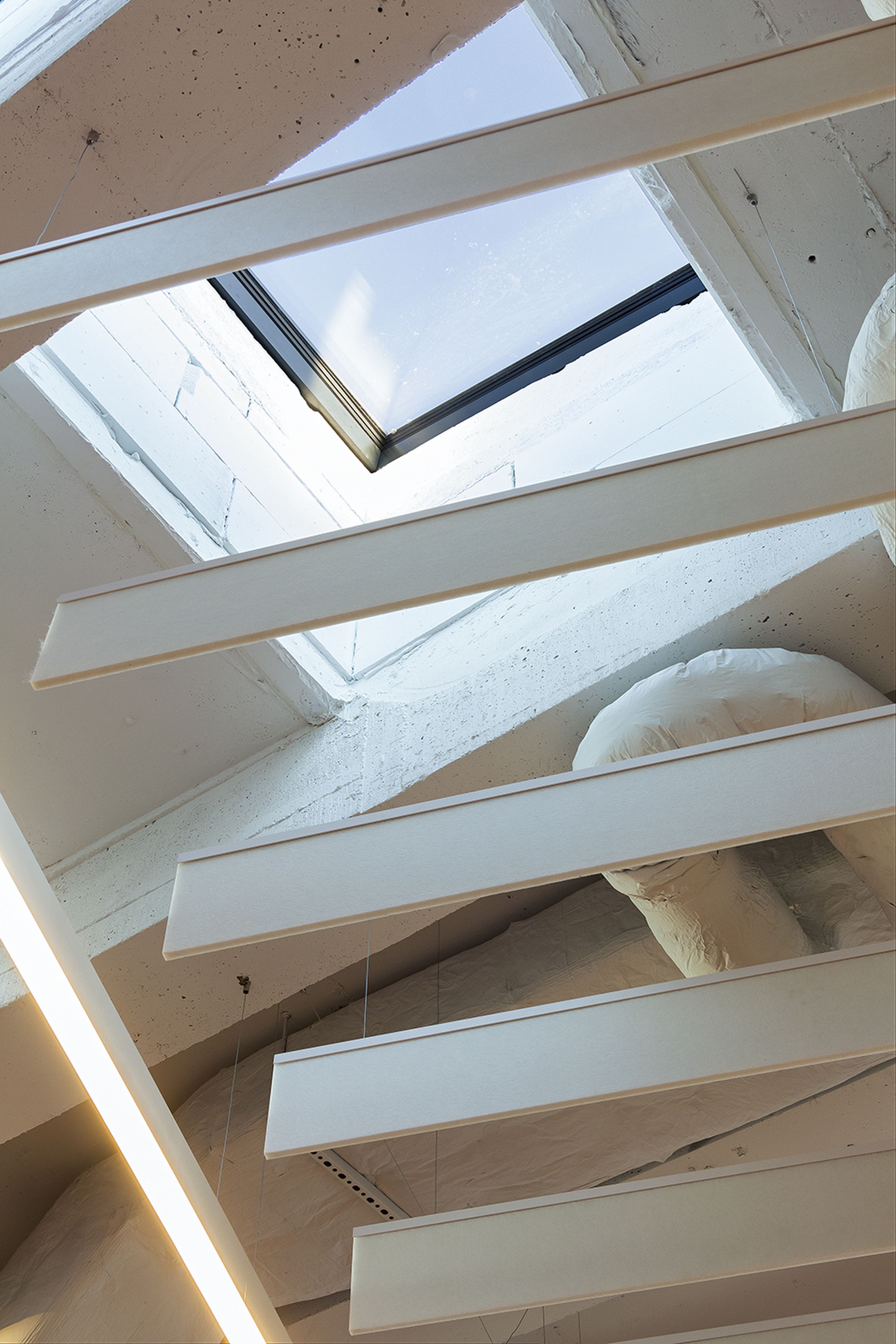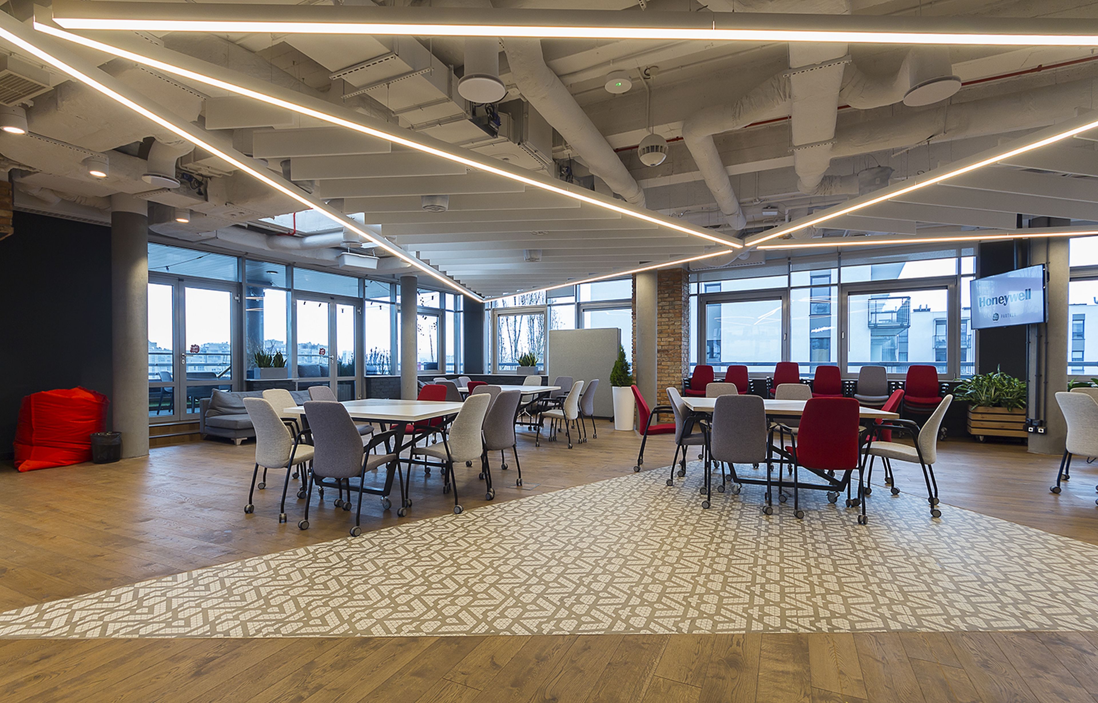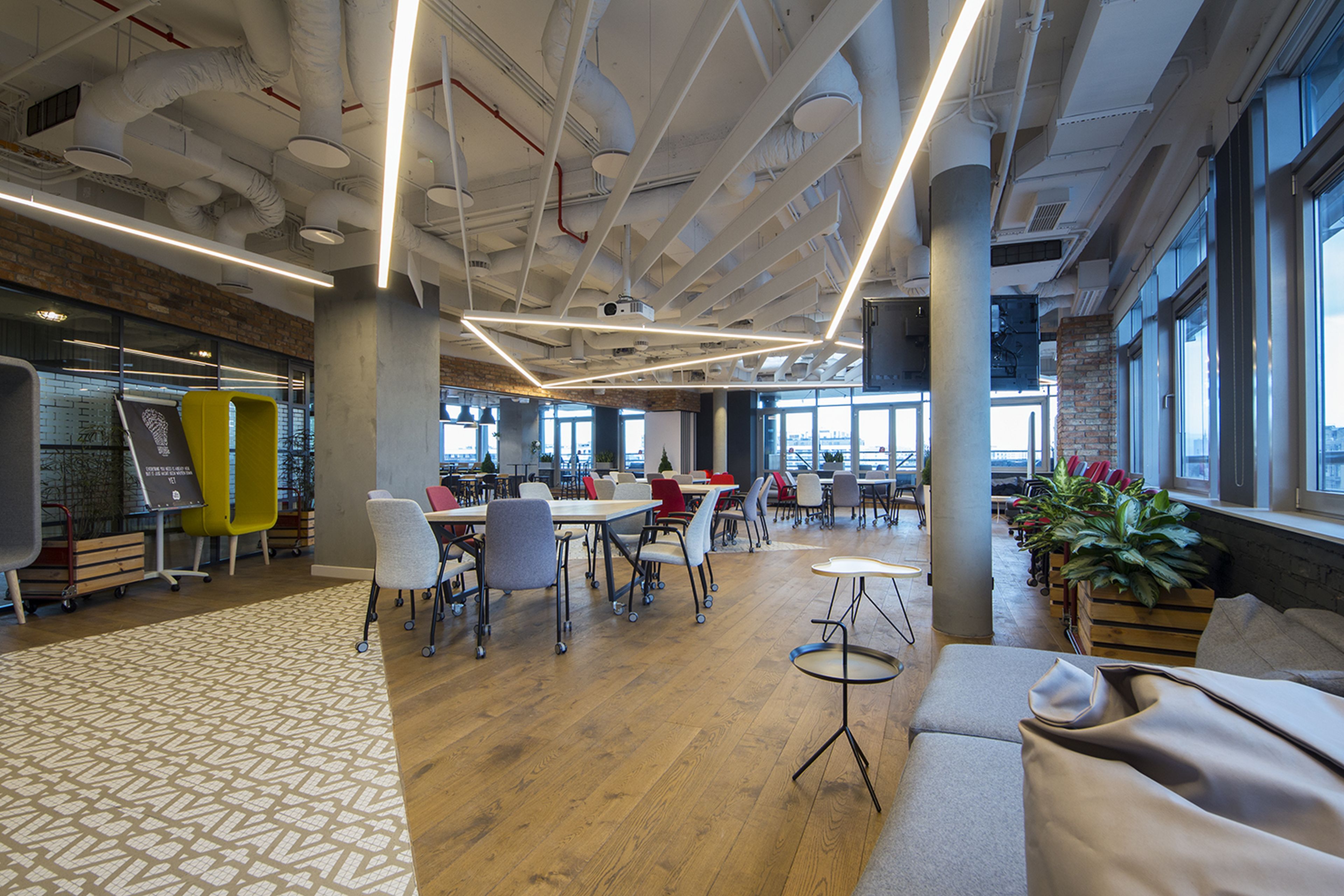 Zastosowanie EcoBaffle wyraźnie ograniczyło pogłos i rozprzestrzenianie się hałasu, co w przestrzeni coworkingowej ma kluczowe znaczenie dla koncentracji i komfortu pracy użytkowników. System pozwala zachować otwarty charakter biura, jednocześnie akustycznie stabilizując strefy pracy indywidualnej, spotkań czy wydarzeń. Geometryczny układ paneli w Brain Embassy współgra z liniowym oświetleniem, tworząc spójną kompozycję.