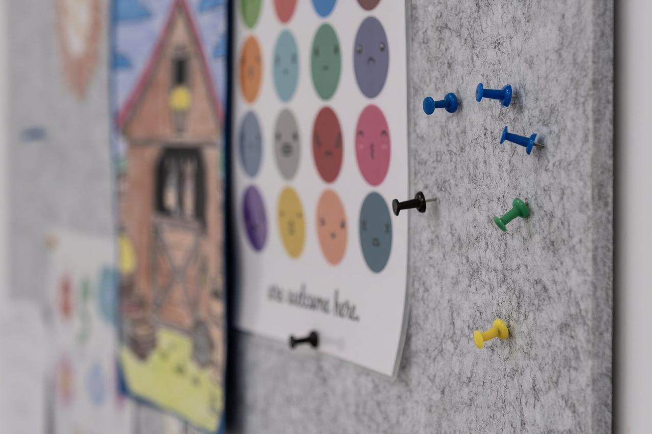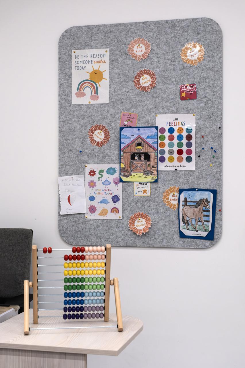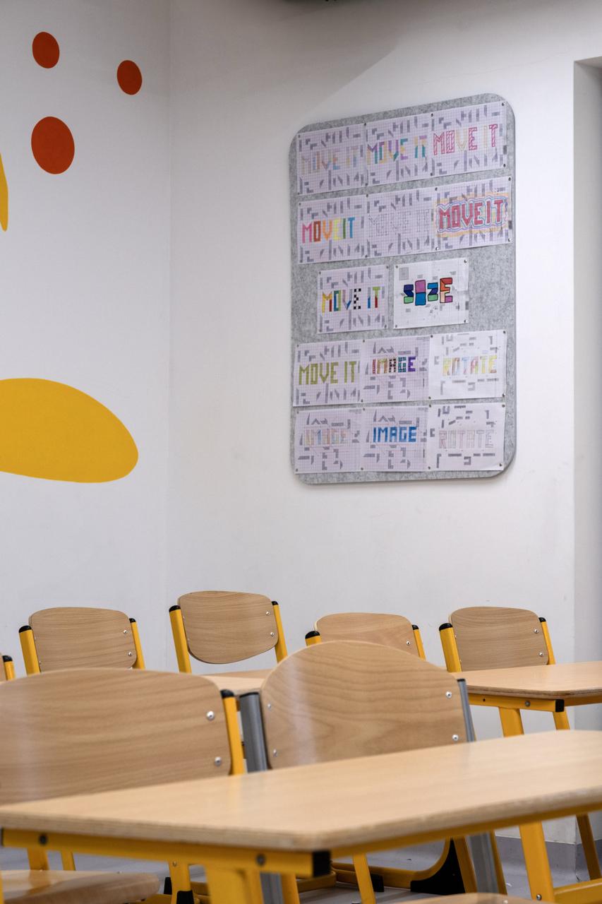 Tablice pełnią tutaj jeszcze jedną rolę, miękka w formie konstrukcja z zaokrąglonymi narożnikami jest spokojnym tłem dla intensywnych w ekspresji rysunków i pomocy naukowych.