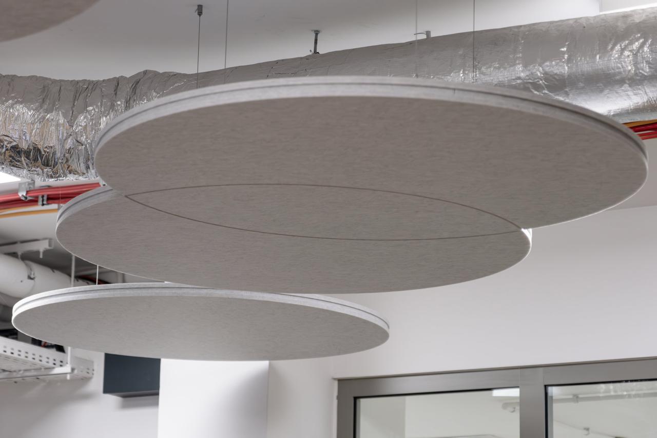 Z kolei okrągłe wyspy EcoCloud stabilizują akustykę w pionie, przechwytują odbicia i skracają czas pogłosu, działając tam, gdzie ściany to za mało.