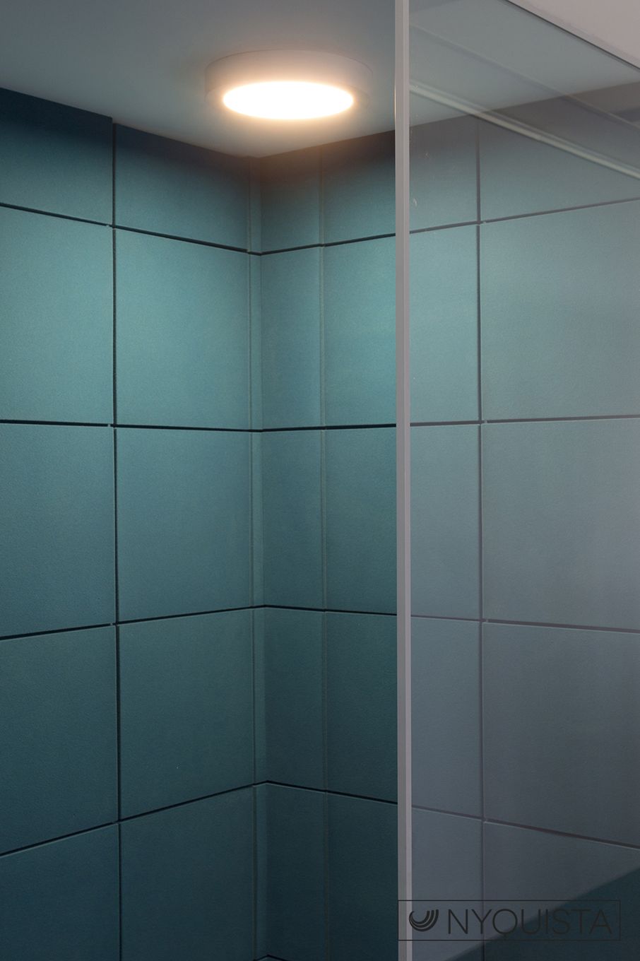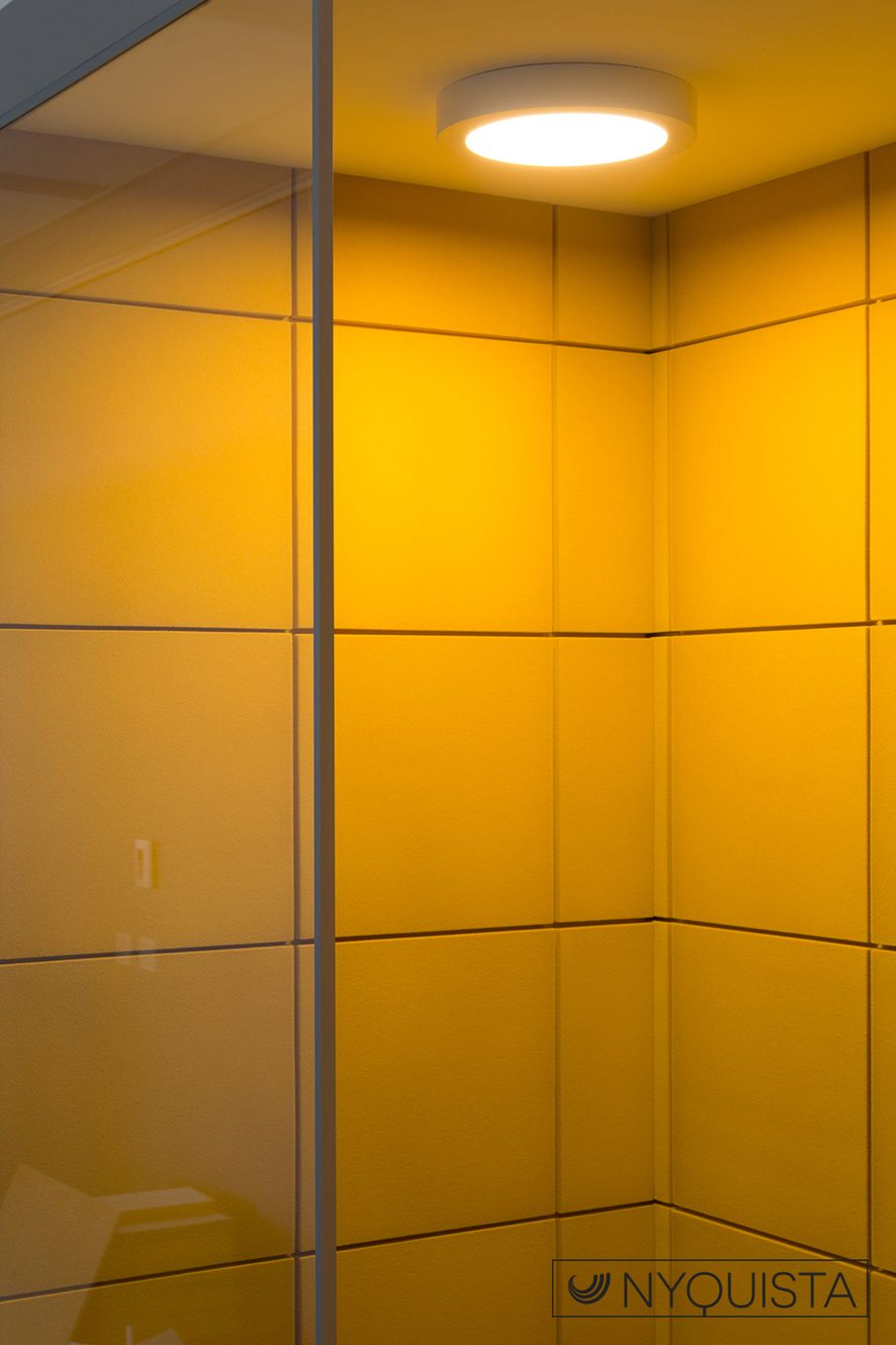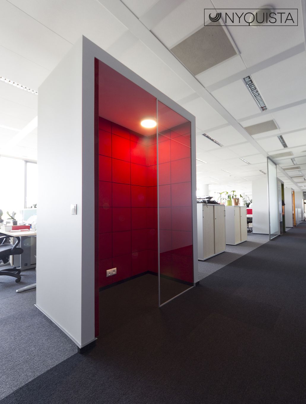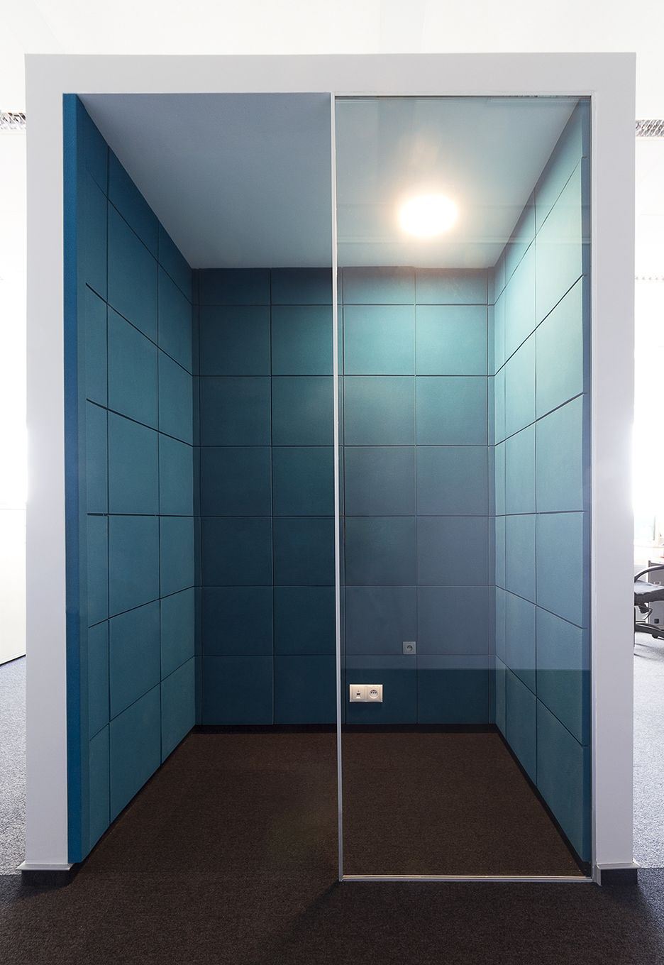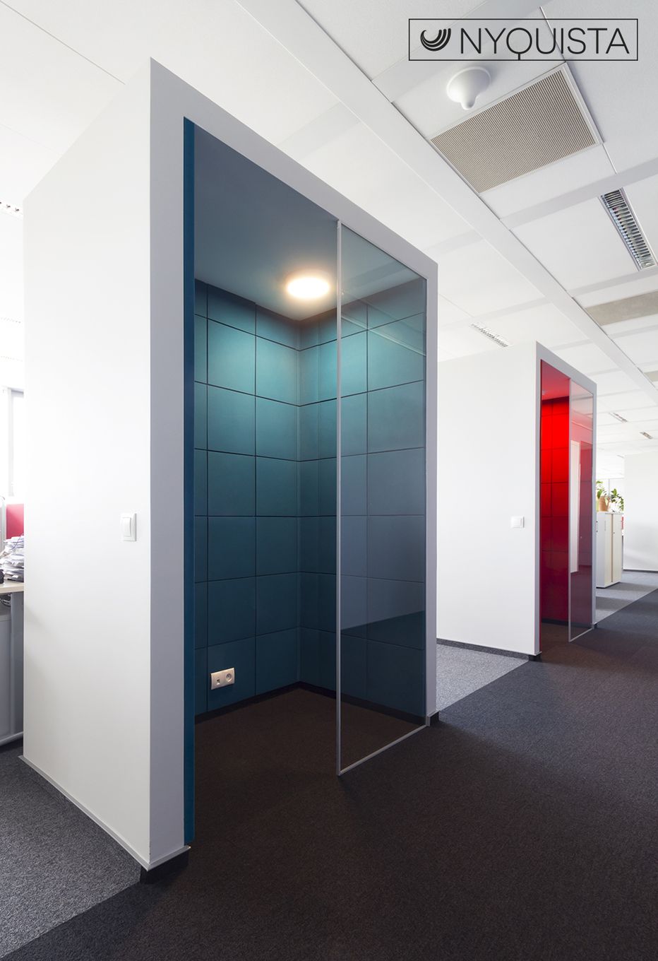 Wychodząc naprzeciw potrzebie - stworzyliśmy specjalnie budki do pracy indywidualnej, które umożliwią prowadzenie swobodnych rozmów telefonicznych oraz komfortowe korzystanie z urządzeń biurowych, a to wszystko bez zakłócania pracy w open space. Odpowiedzią na to wyzwanie są zaprojektowane przez nas skutecznie izolujące wewnątrz i na zewnętrz strefy cichej pracy oraz dedykowana strefa copy point. Konstrukcję wykonano z płyt gipsowo-kartonowych o podwyższonej izolacyjności akustycznej, a wnętrza wykończono akustycznymi panelami Fiber Color – Square Fugue o najwyższym współczynniku pochłaniania dźwięku w klasie A. Całości dopełniają ściany z grubego szkła hartowanego, które zapewniają prywatność rozmów, nie zamykając wizualnie przestrzeni.