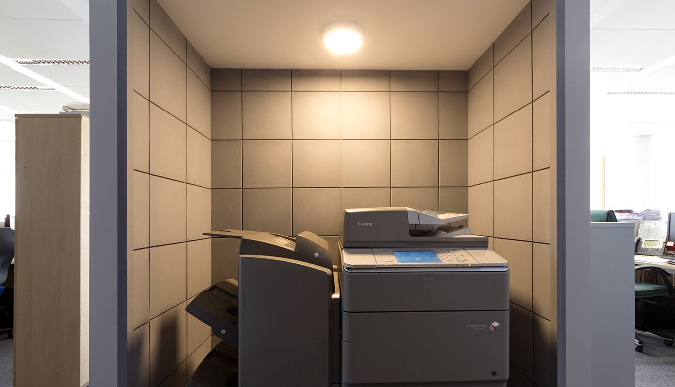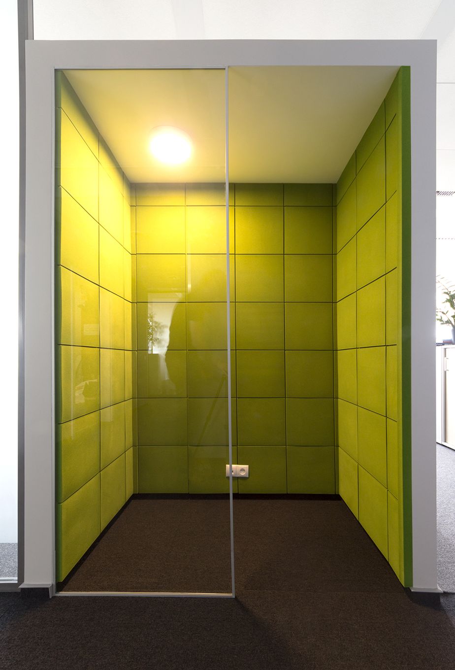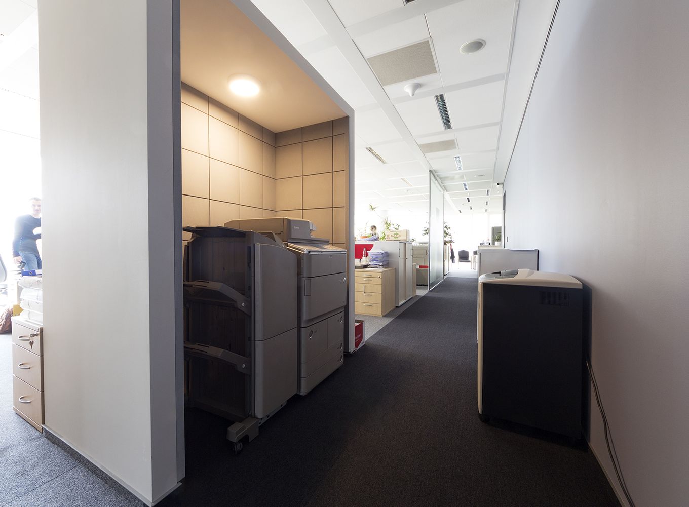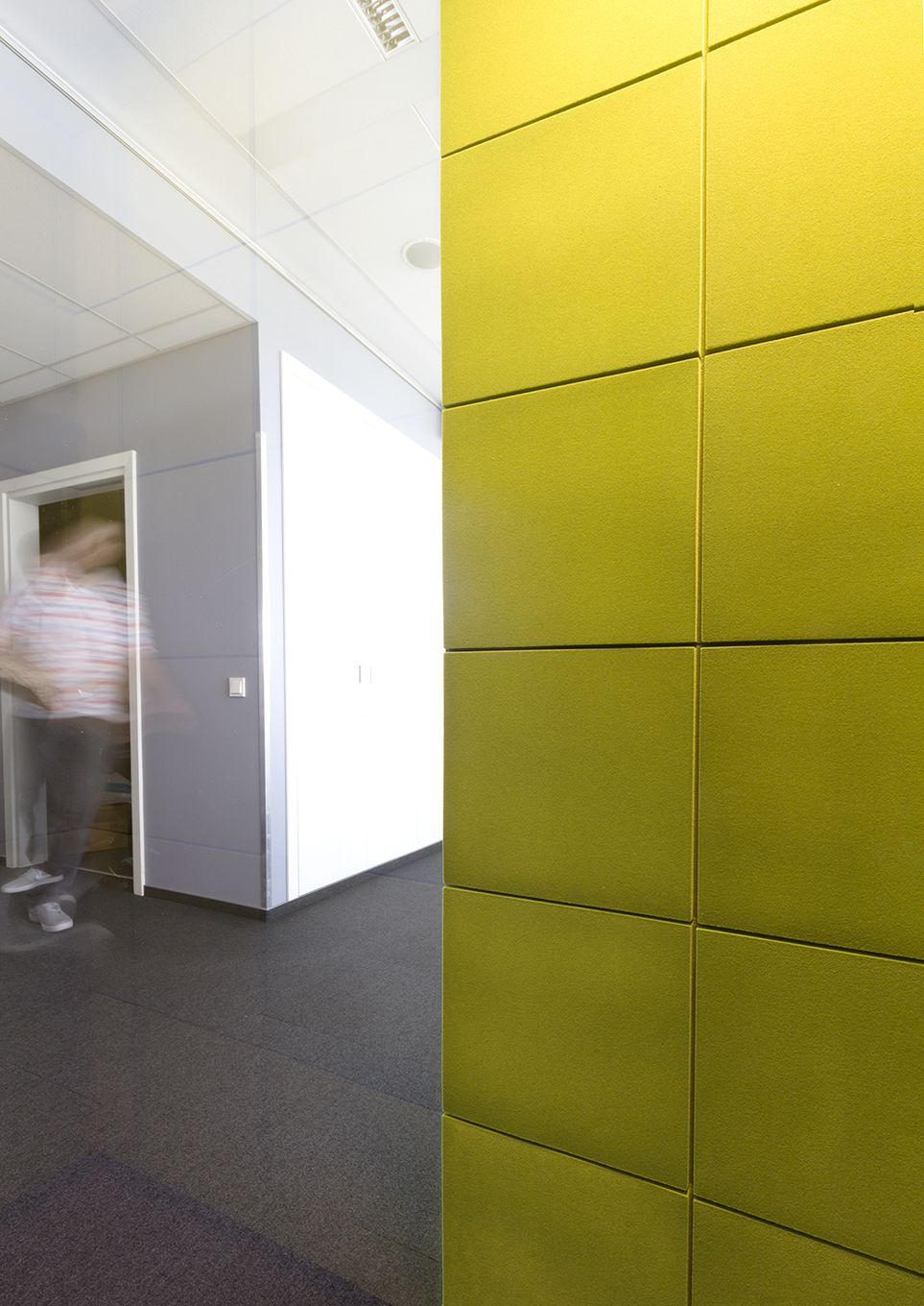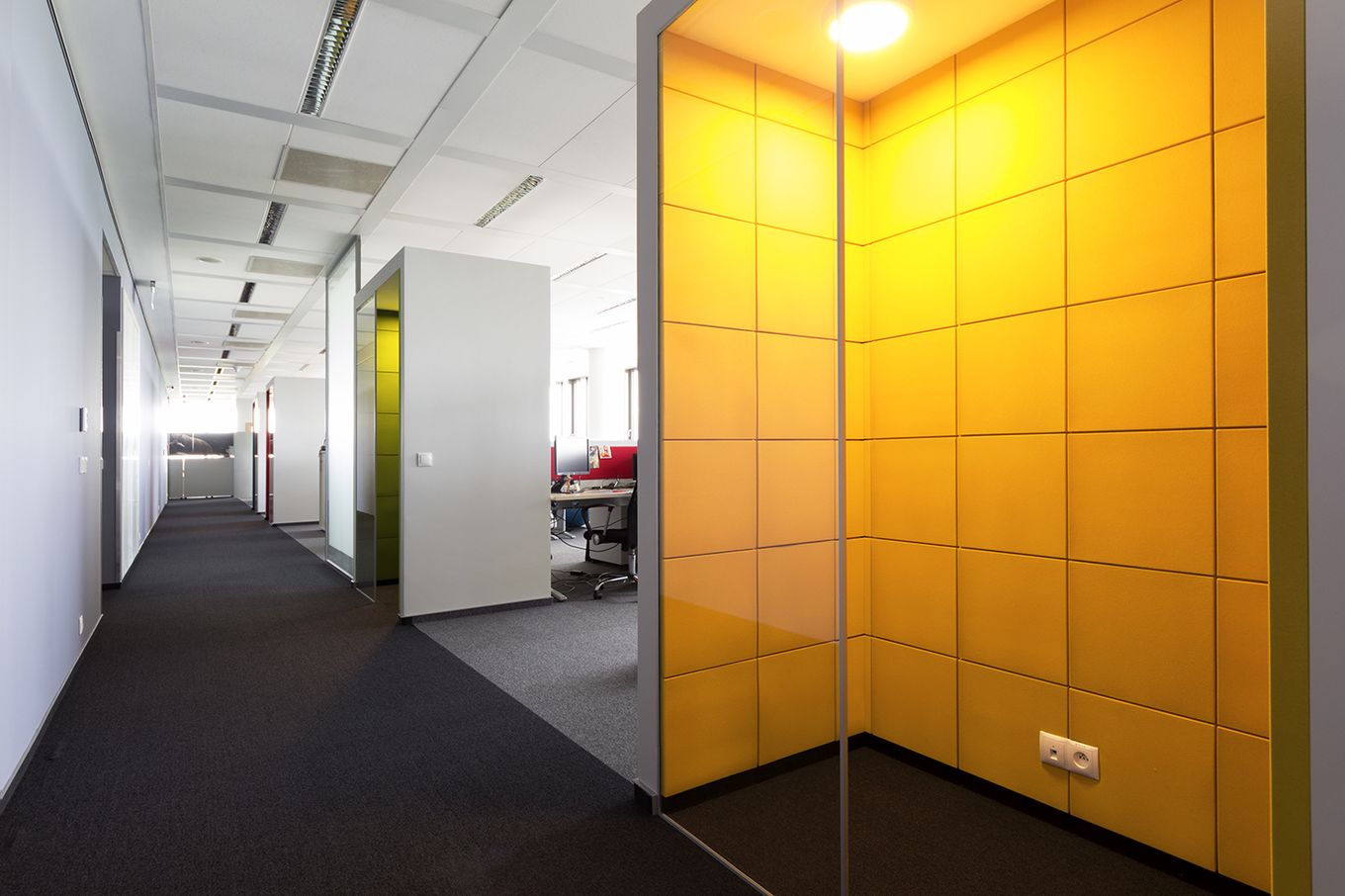 Wyrazisty, geometryczny układ paneli w intensywnych kolorach porządkuje przestrzeń i ułatwia orientację w biurze. Zastosowane maty akustyczne skutecznie przeciwdziałają hałasowi. Funkcjonalne budki wyraźnie poprawiły komfort pracy. Zapewniają ciszę i poczucie prywatności zarówno podczas rozmów telefonicznych, jak i pracy przy drukarkach.