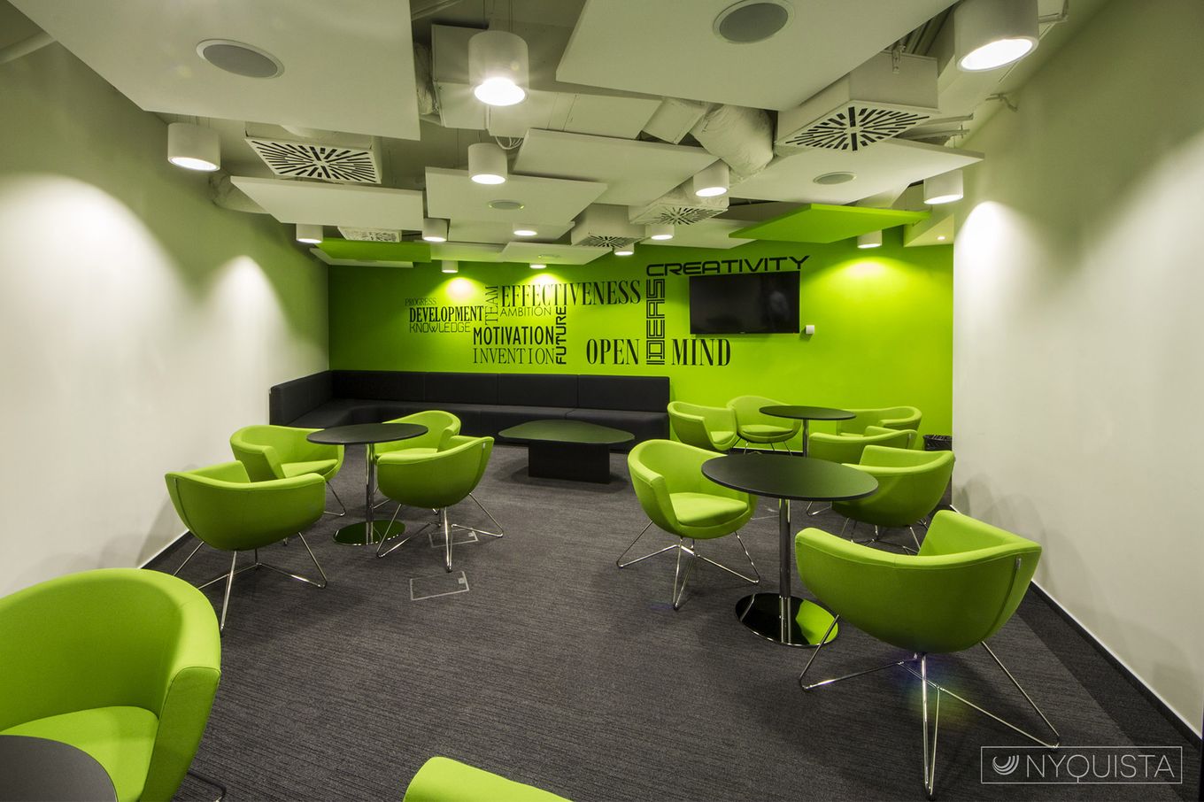 Dwa kolory i zróżnicowane wysokości zawieszonych EcoCloud-ów pozwoliły uporządkować wizualnie sufit i podkreślić wyraźny charakter wnętrz.