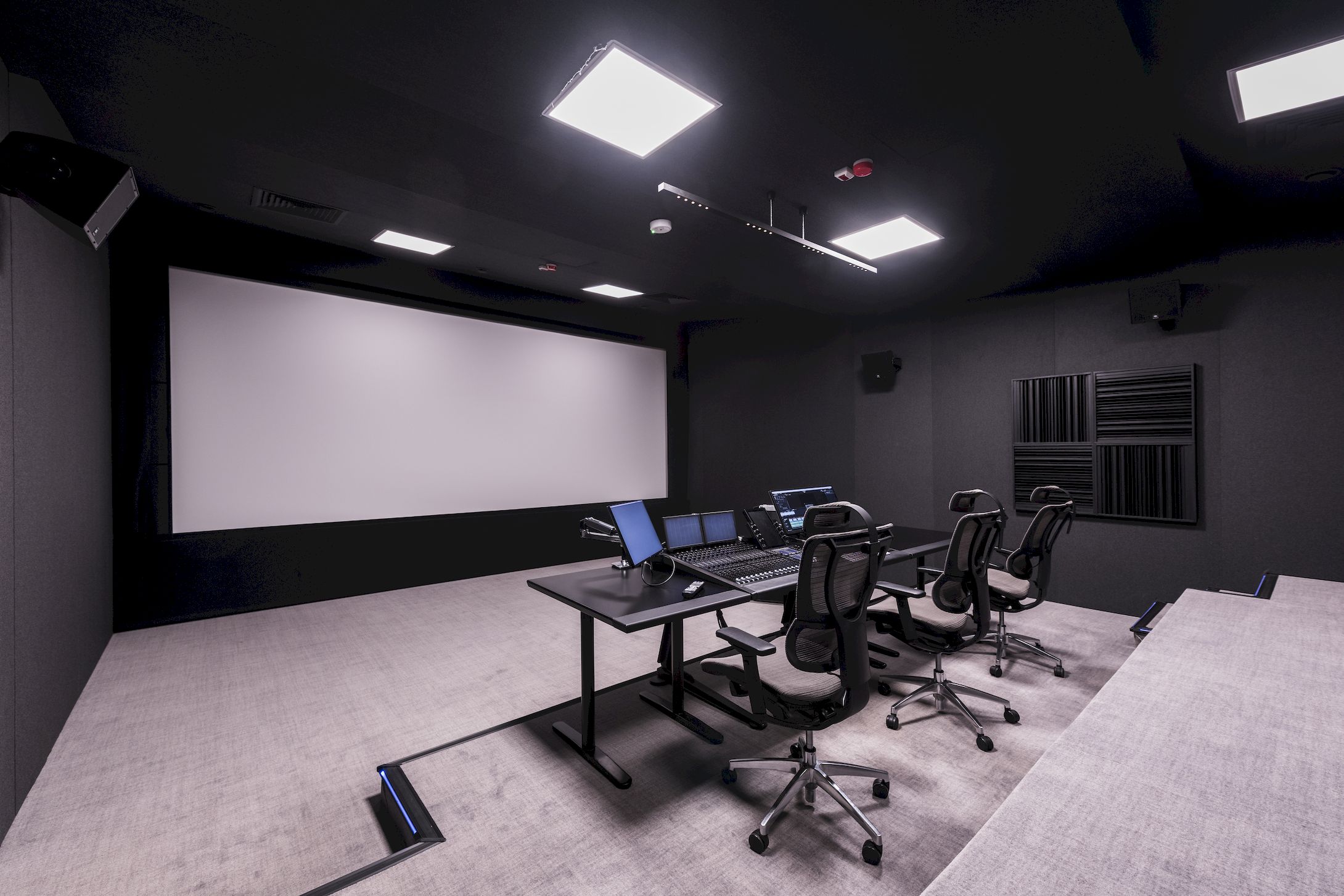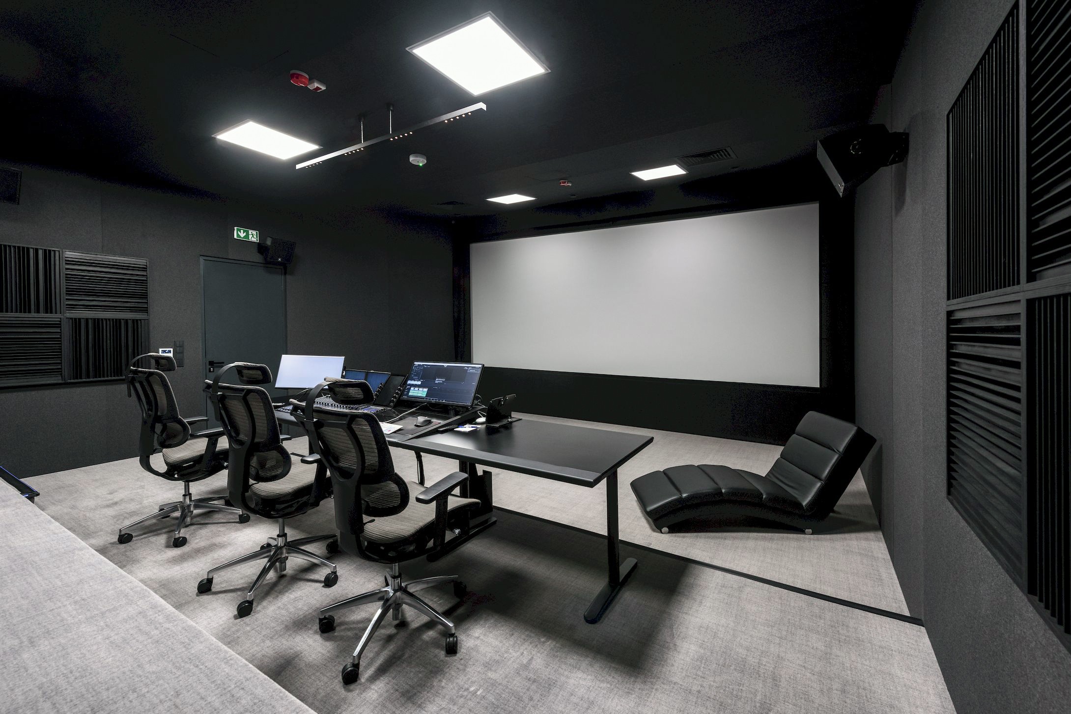 Wizualnie wnętrze kina utrzymane jest w stonowanej kolorystyce. Matowe powierzchnie oraz ograniczenie refleksów świetlnych sprzyjają pracy z obrazem. Oświetlenie zapewnia komfort pracy technicznej jednocześnie nie ingerując w percepcję projekcji.