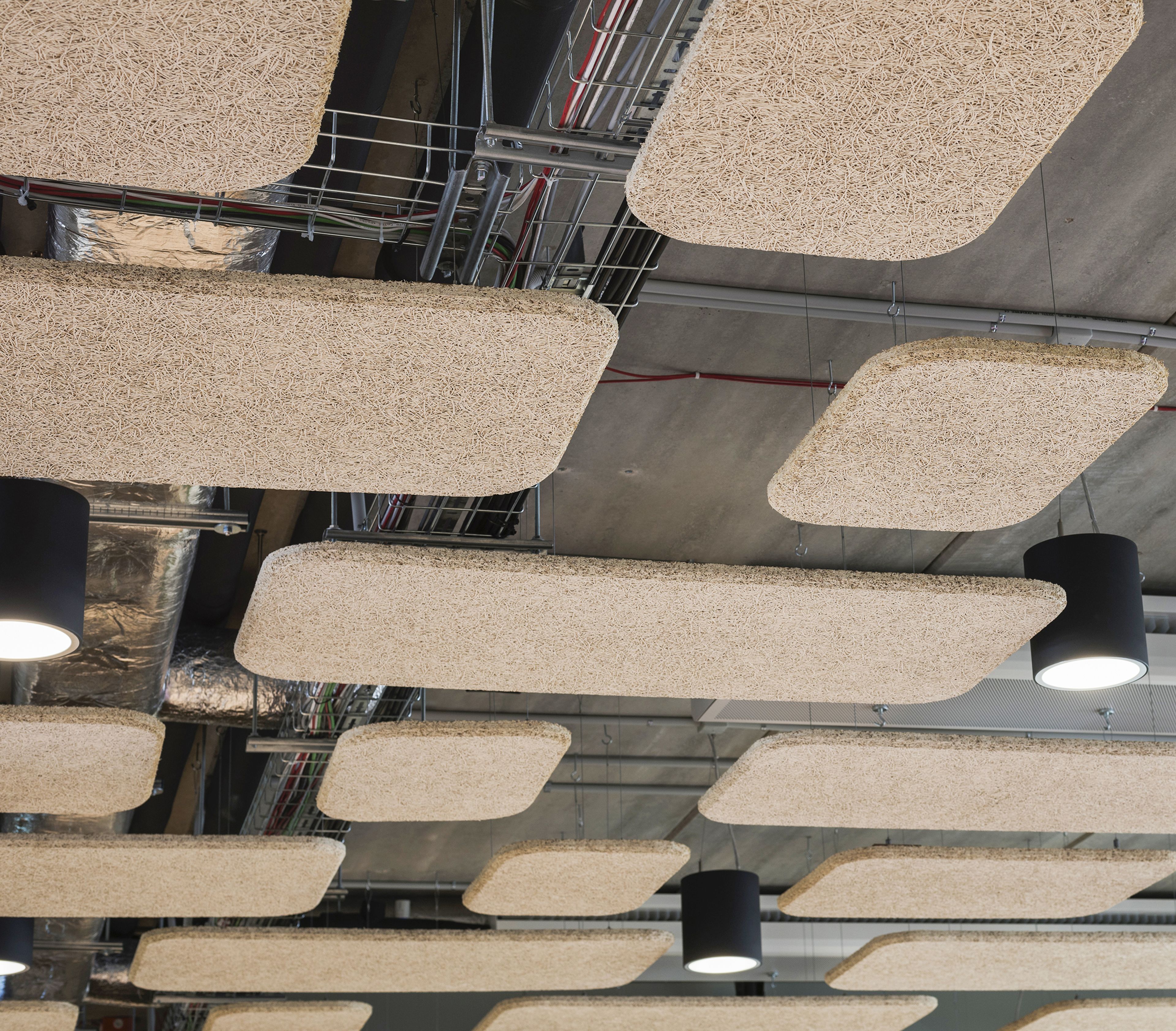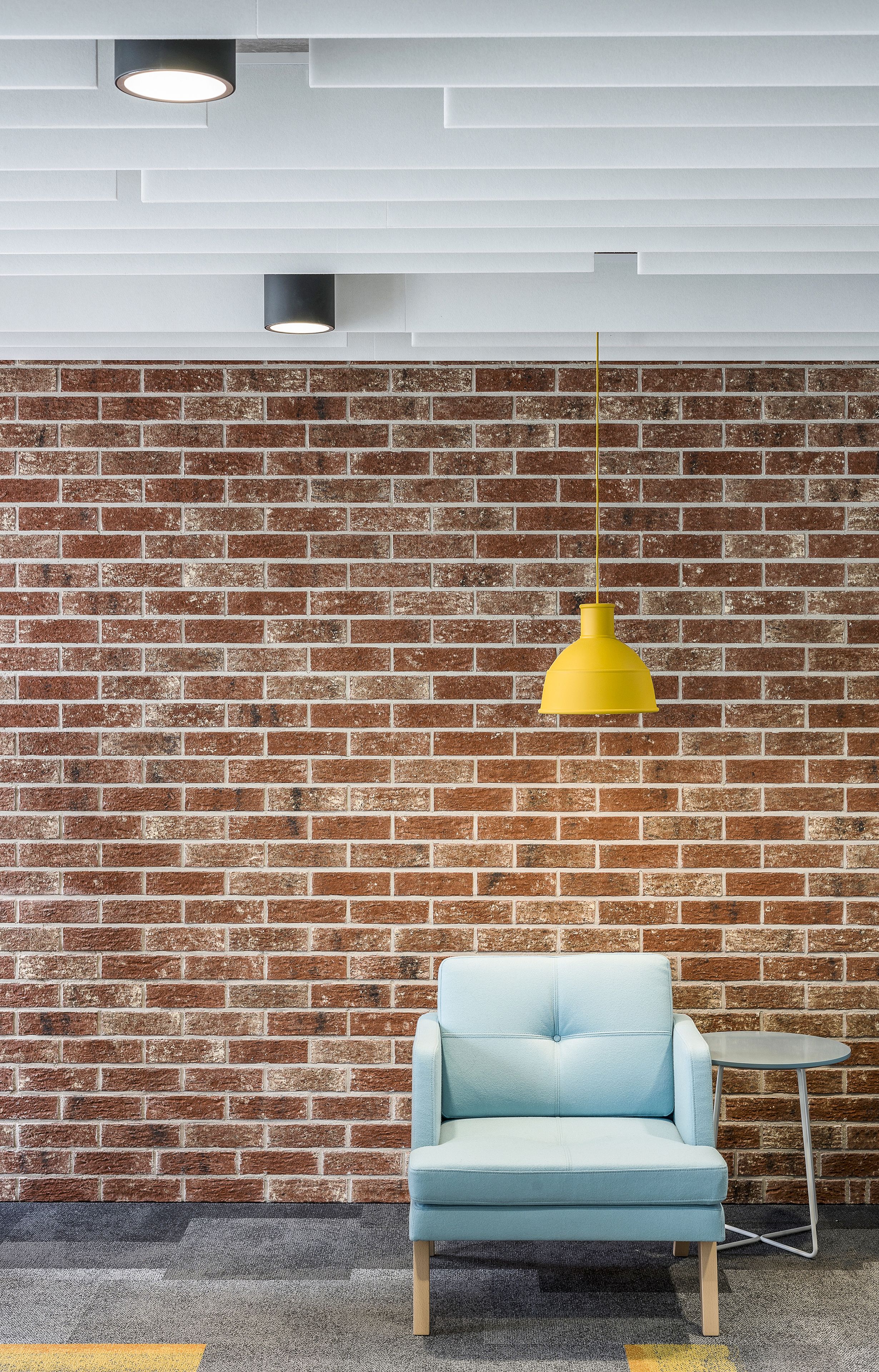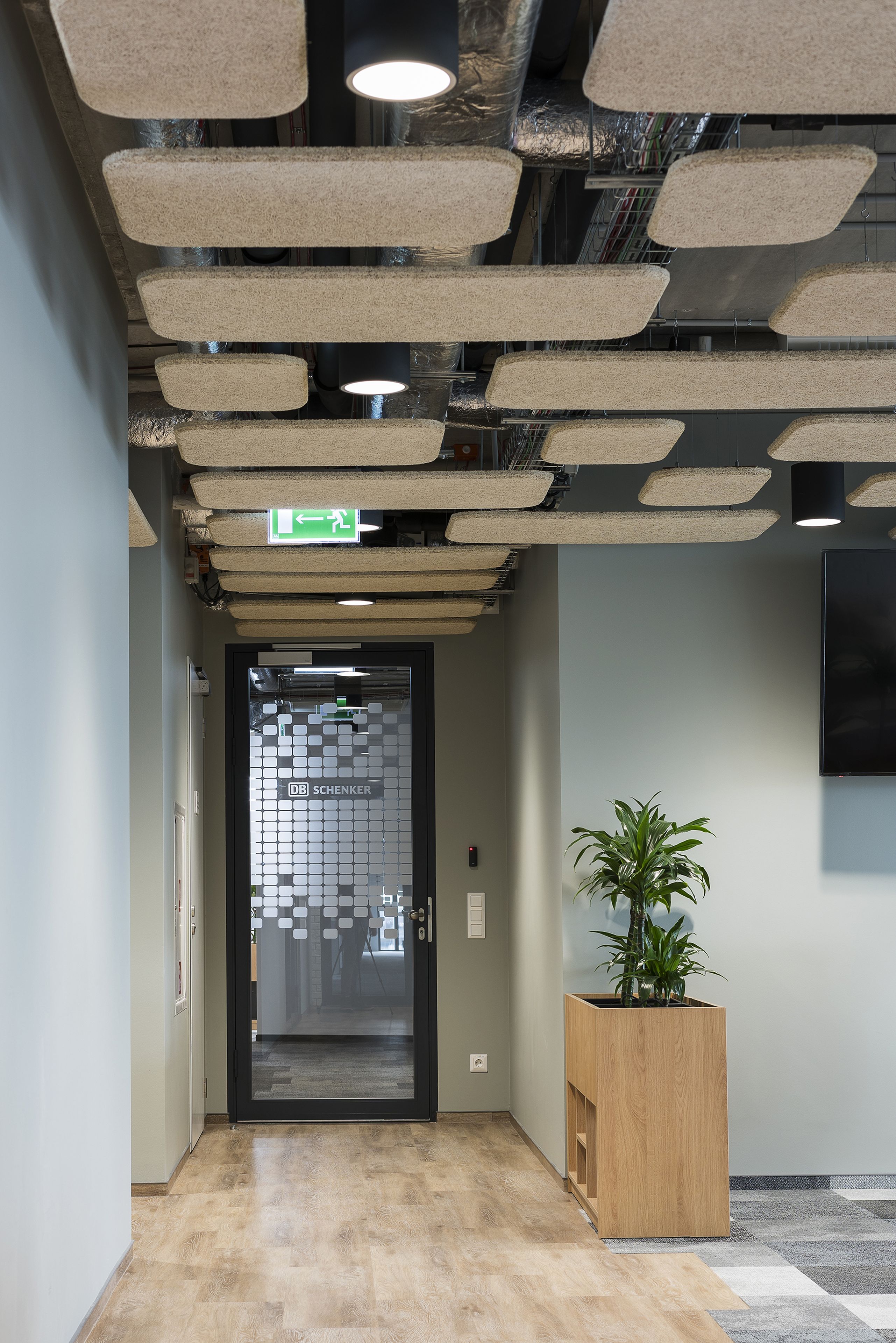 Projekt akustyczny został w przyjemny wizualnie sposób oparty na kontrastach. Horyzontalnie zawieszone EcoBaffle w jasnym kolorze optycznie obniżają wysoki sufit, a zestawione z cegłą, zielenią roślin i wyrazistymi akcentami kolorystycznymi tworzą ciekawy design we wnętrzu. Uzupełnieniem adaptacji akustycznej są sufitowe panele WoodenFiber. Ich porowata struktura zapewnia wysoką chłonność dźwięku, jednocześnie wprowadzając naturalny charakter w na powierzchni betonowego stropu.