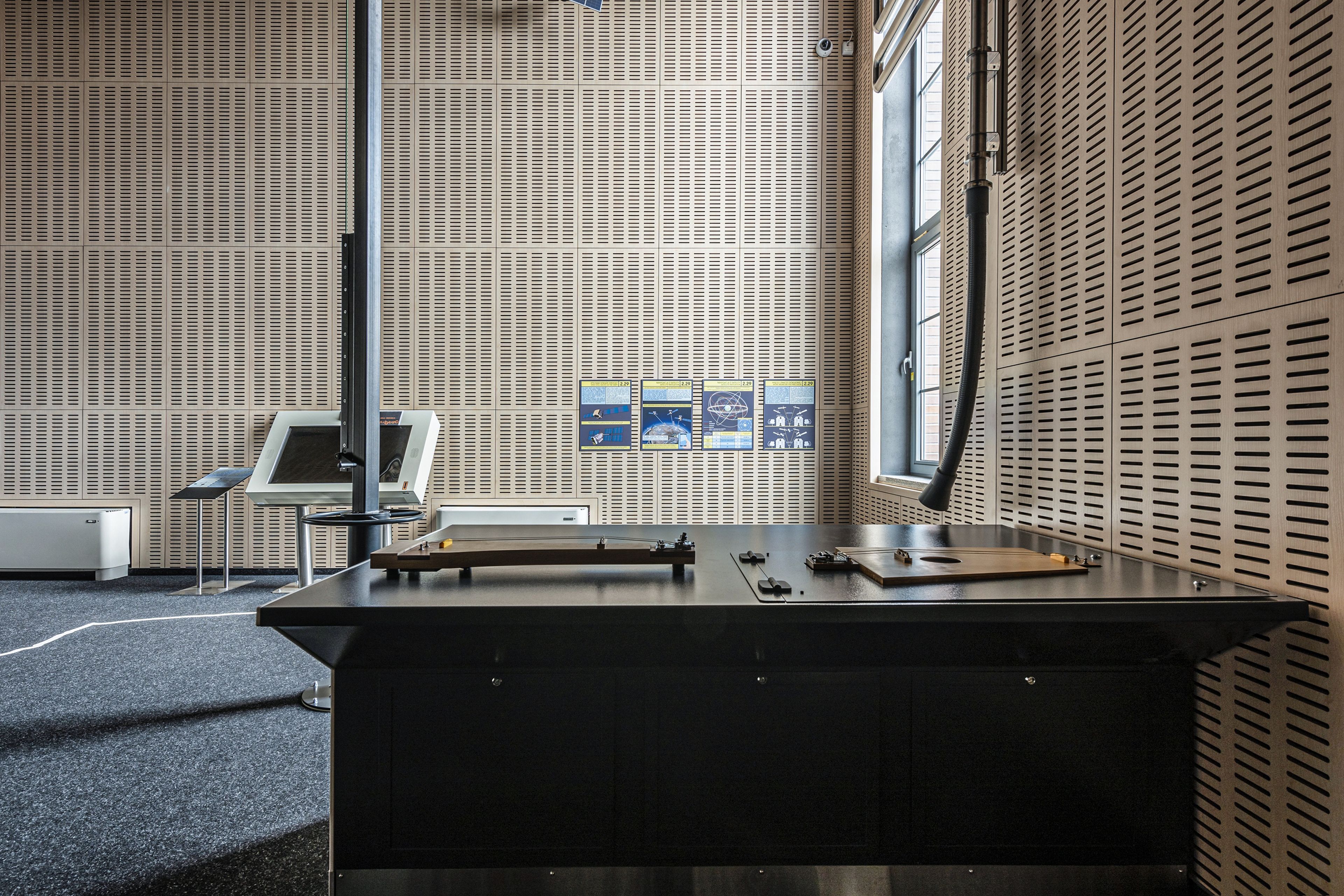W sali ekspozycyjnej kluczowe było stworzenie środowiska, które pozwala w pełni skupić się na dźwięku jako zjawisku fizycznym. Dla zachowania pełnej kontroli akustycznej pomieszczena wybraliśmy system WoodenWall. perforowane panele drewniane o jasnej, naturalnej kolorystyce, które pokrywają ściany sali w regularnym, modułowym układzie. Drewno wprowadza ciepło i jest doskonałym akustycznie materiałem. Ponadto indywidualnie dobrana perforacja szczelinowa wraz z ukrytą warstwą pochłaniającą skutecznie absorbuje dźwięk w zakresie wybranych niskich i średnich częstotliwości. To rozwiązanie redukuje pogłos, zapewniając pożądany komfort akustyczny.