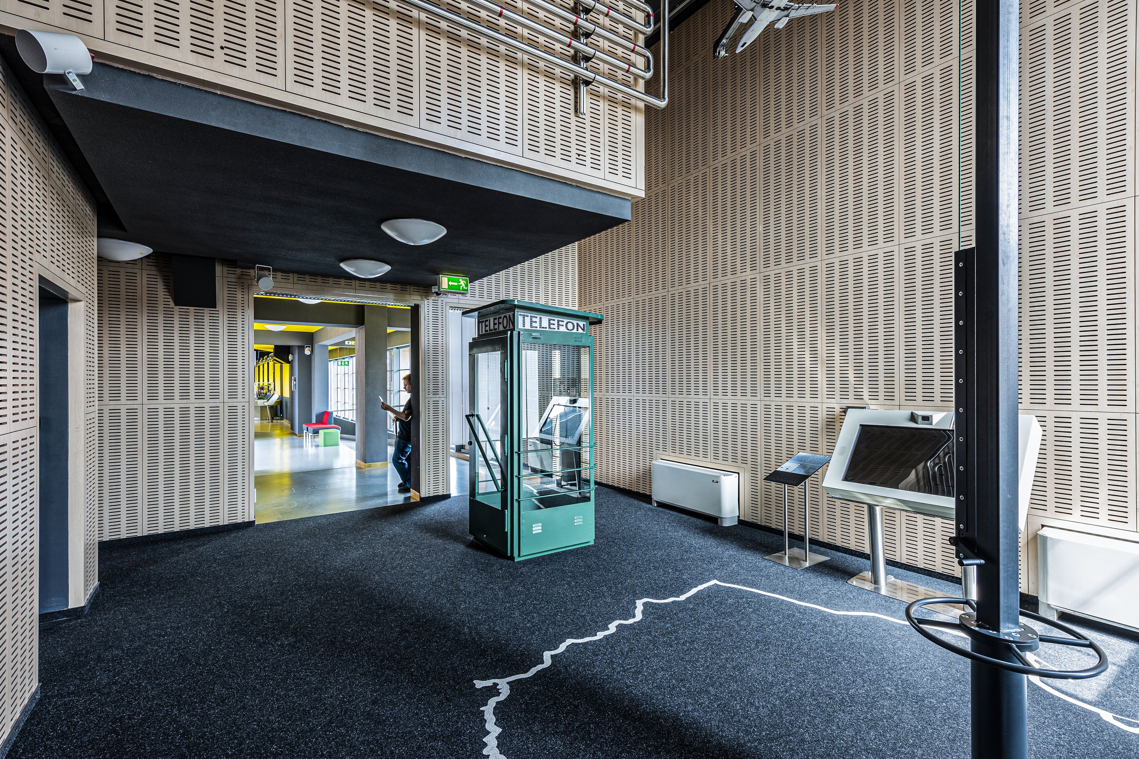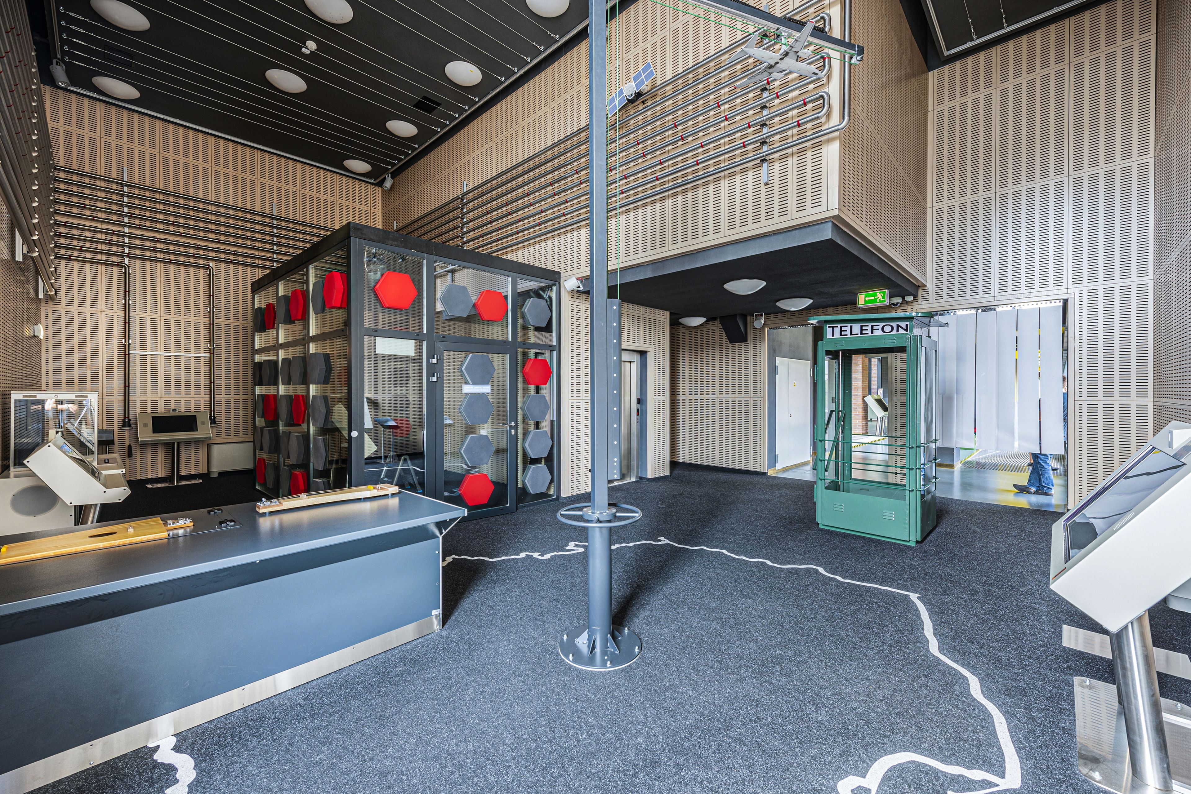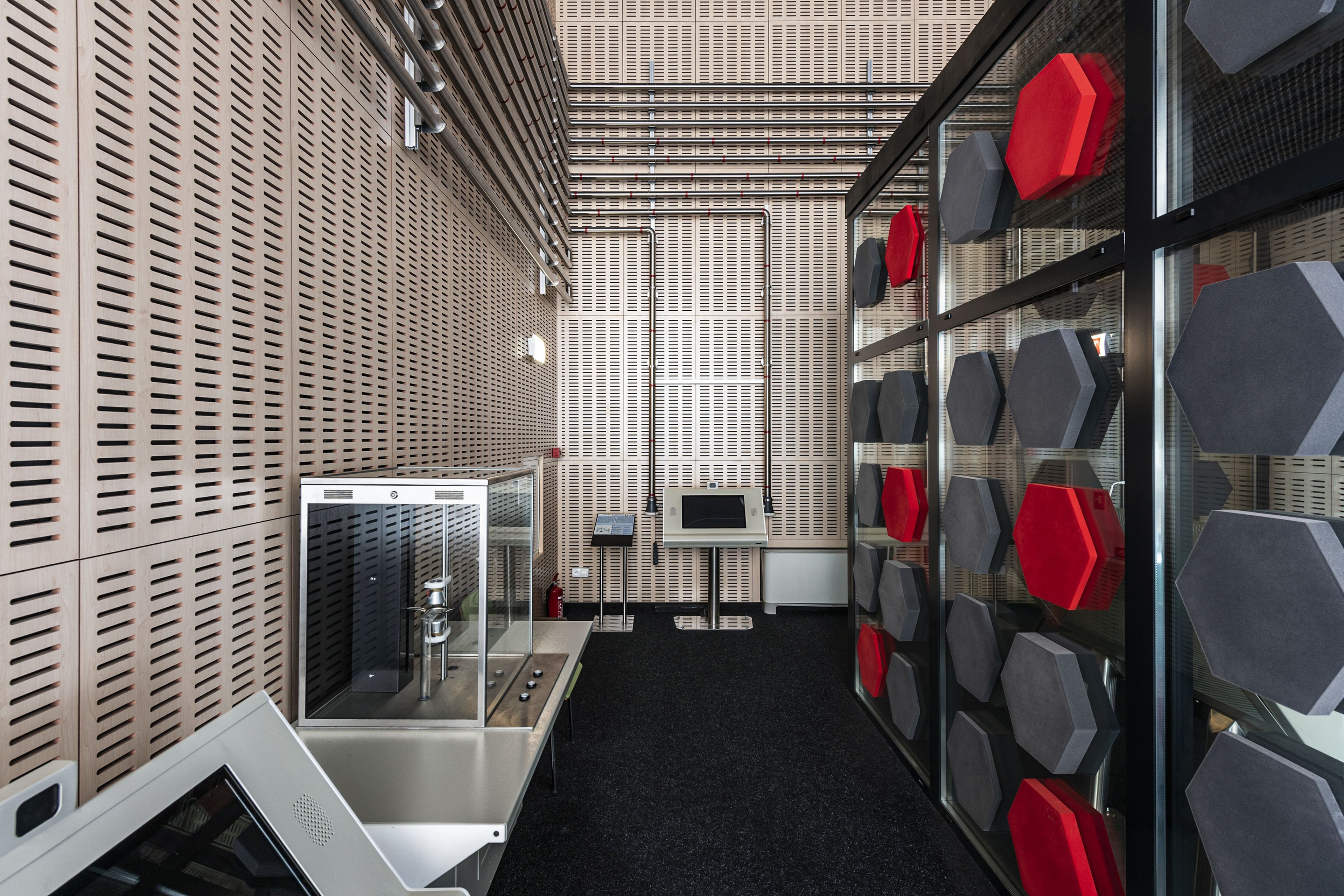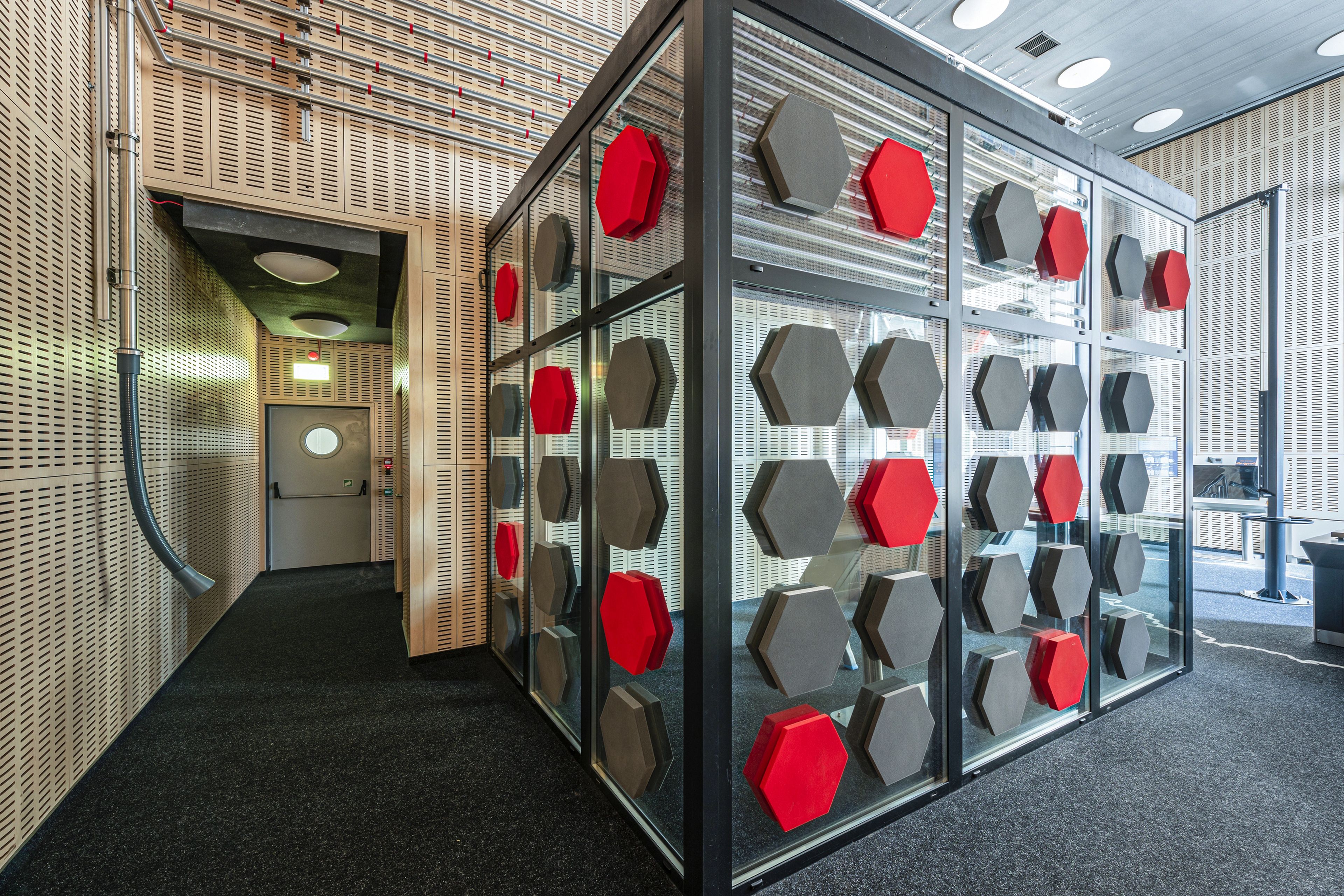 Centralnym elementem sali jest przeszklona budka, której ściany zostały wykończone panelami Fiber Color. Trójwymiarowe, geometryczne formy w kontrastowych odcieniach szarości i czerwieni wprowadzają wyrazisty akcent, jednocześnie będąc akustycznymi absorberami - dzięki którym dźwięk pozostaje „pod kontrolą”, a odbiorcy mogą w pełni skupić się na doświadczaniu bez zakłóceń otoczenia.