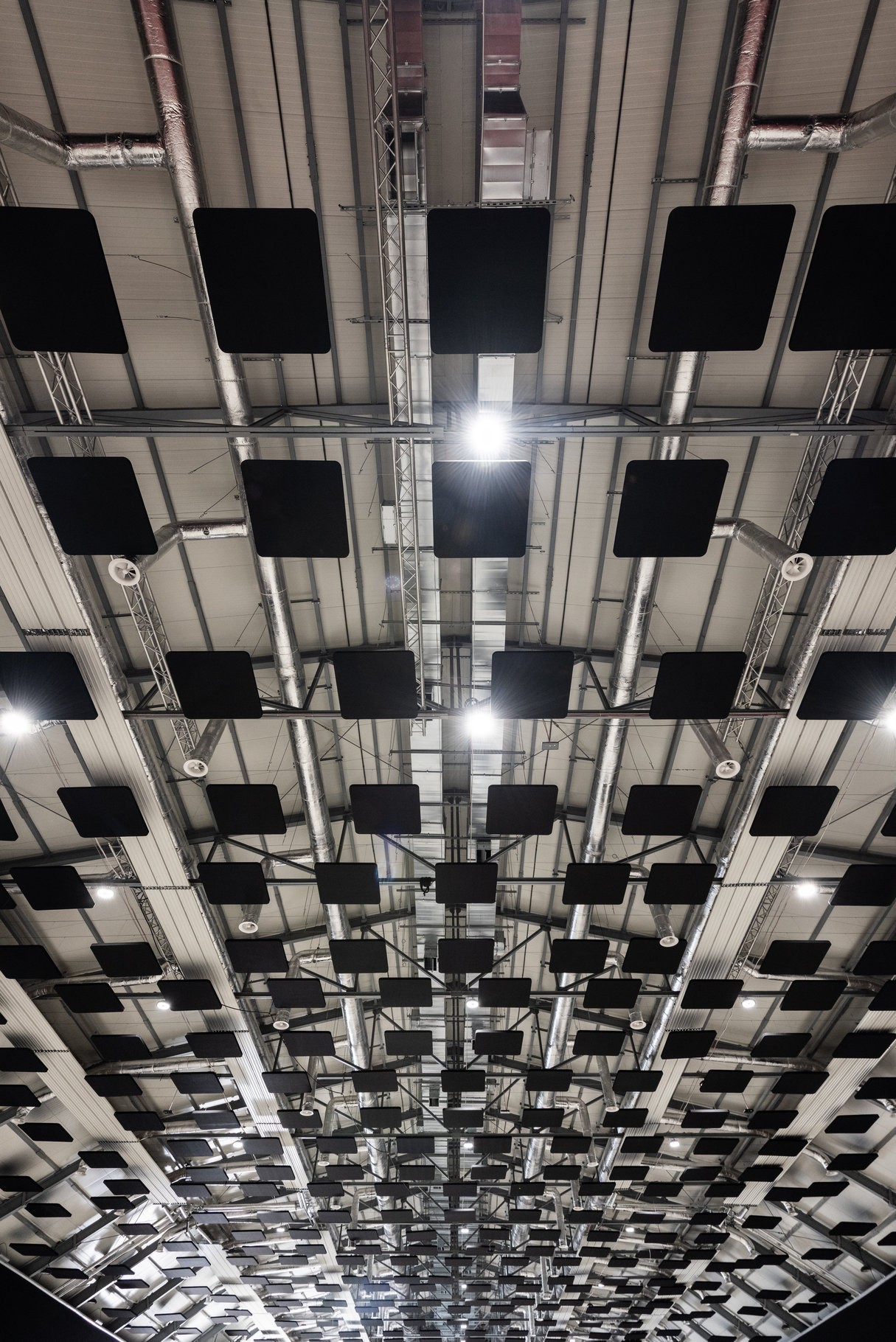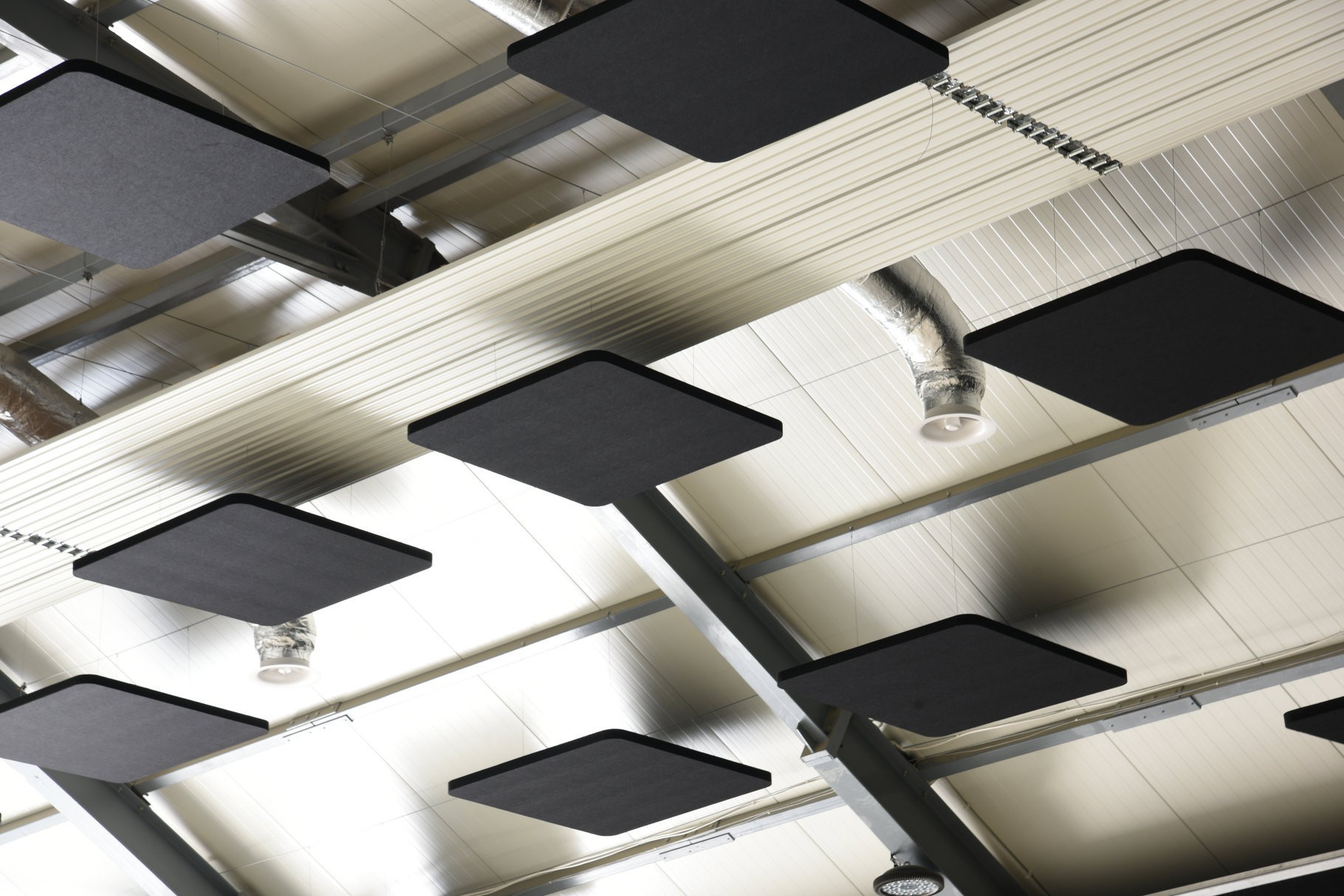 W realizacji wykorzystaliśmy 400 akustycznych wysp sufitowych EcoCloud. Klasyczna forma i czarny kolor doskonale rozwiązują problem pogłosu. Ich strategiczne rozmieszczenie pozwoliło uzyskać najbardziej optymalne warunki akustyczne we wnętrzu. EcoCloud wykonane są z wysokiej jakości materiału dźwiękochłonnego PET pełnią funkcję techniczną oraz estetyczną, nadając przestrzeni nowoczesny i uporządkowany charakter.