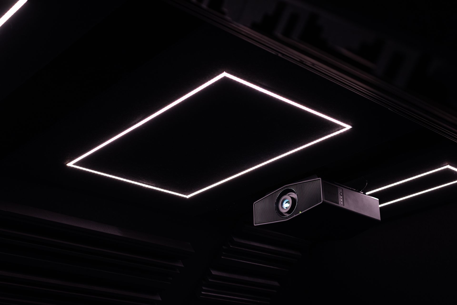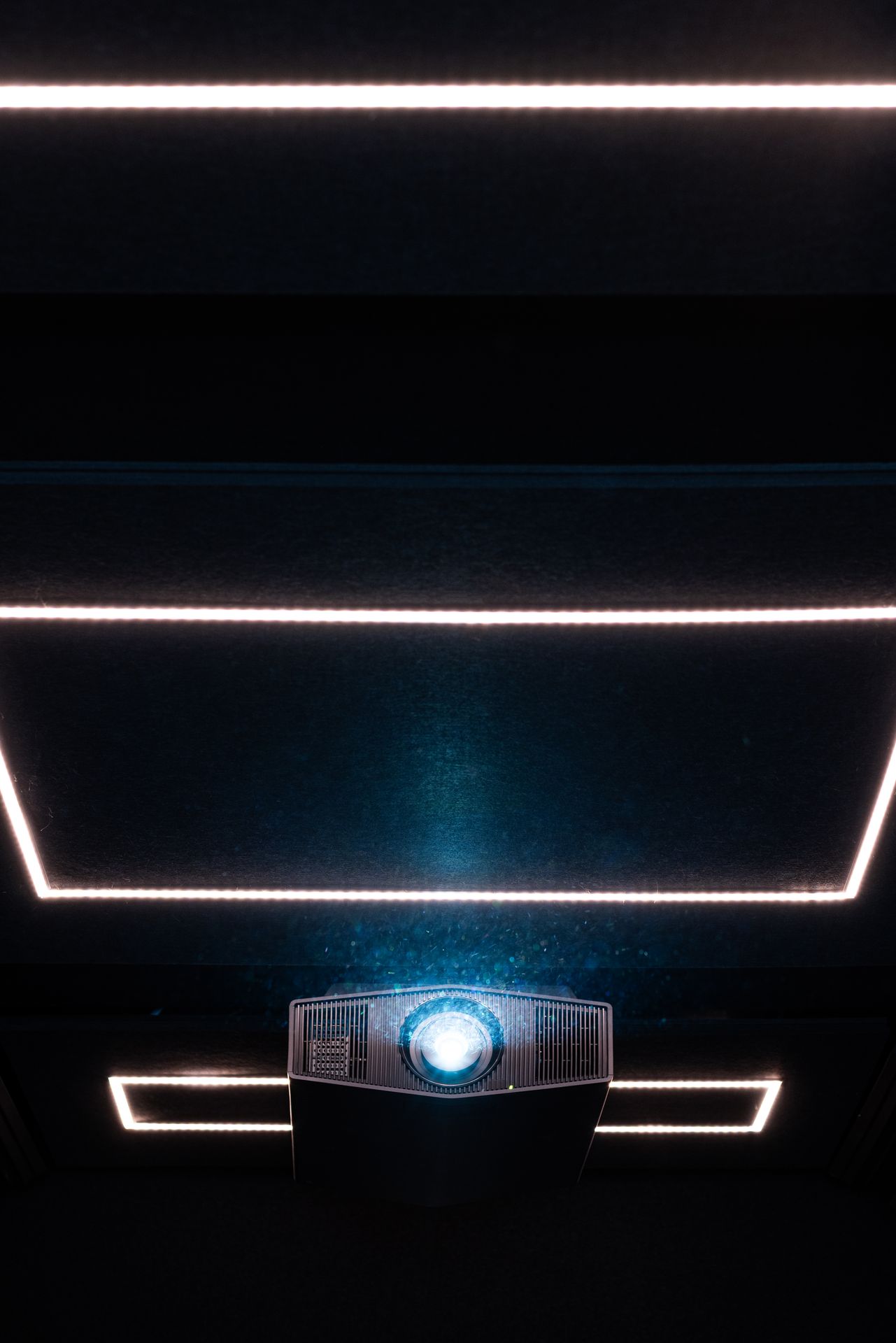 Wizualnie wnętrze opiera się na kontraście ciemnych, matowych powierzchni i świetlnych ram LED – o zmiennej kolorystyce. które można dostosować do nastroju lub wybranej projekcji. Od klasycznej, ciepłej bieli po futurystyczny fiolet, to koncepcja która podąża za aktualnym nastrojem lub wybraną projekcją.