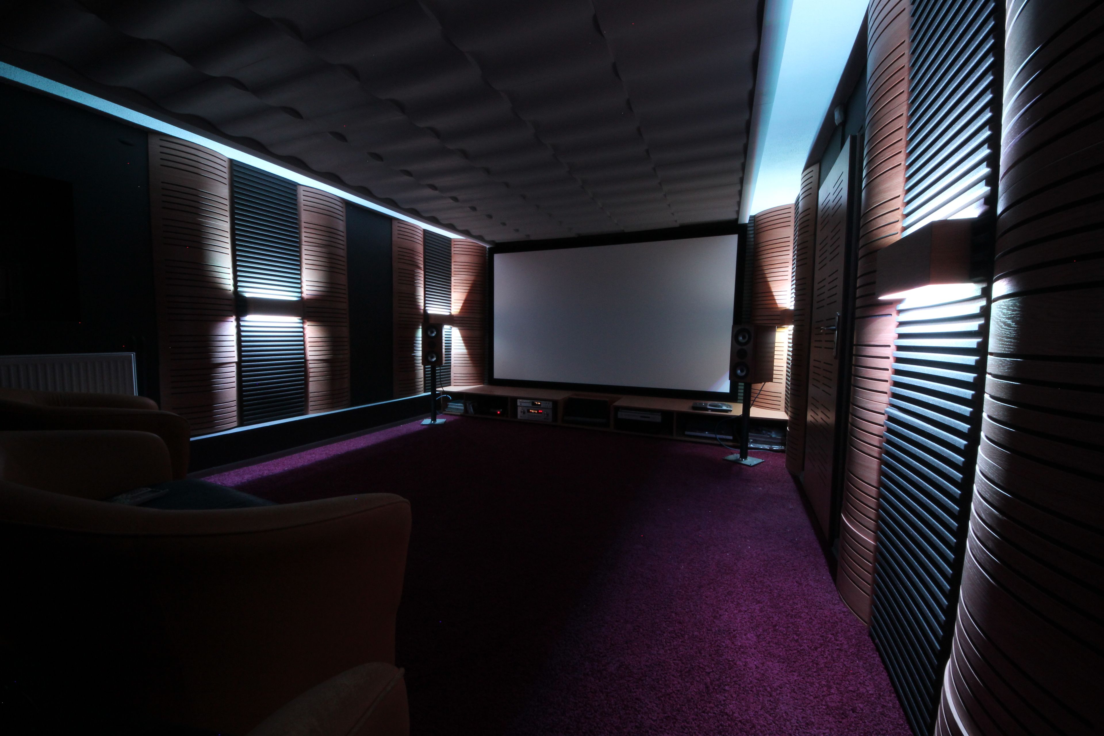 Zamknięta przestrzeń i naturalna izolacja sprzyjają pracy z dźwiękiem, dlatego to właśnie tam powstała ta realizacja. Klient marzył o profesjonalnej sali kinowej we własnym domu, a pomieszczenie w piwnicy okazało się do tego idealnym punktem wyjścia.