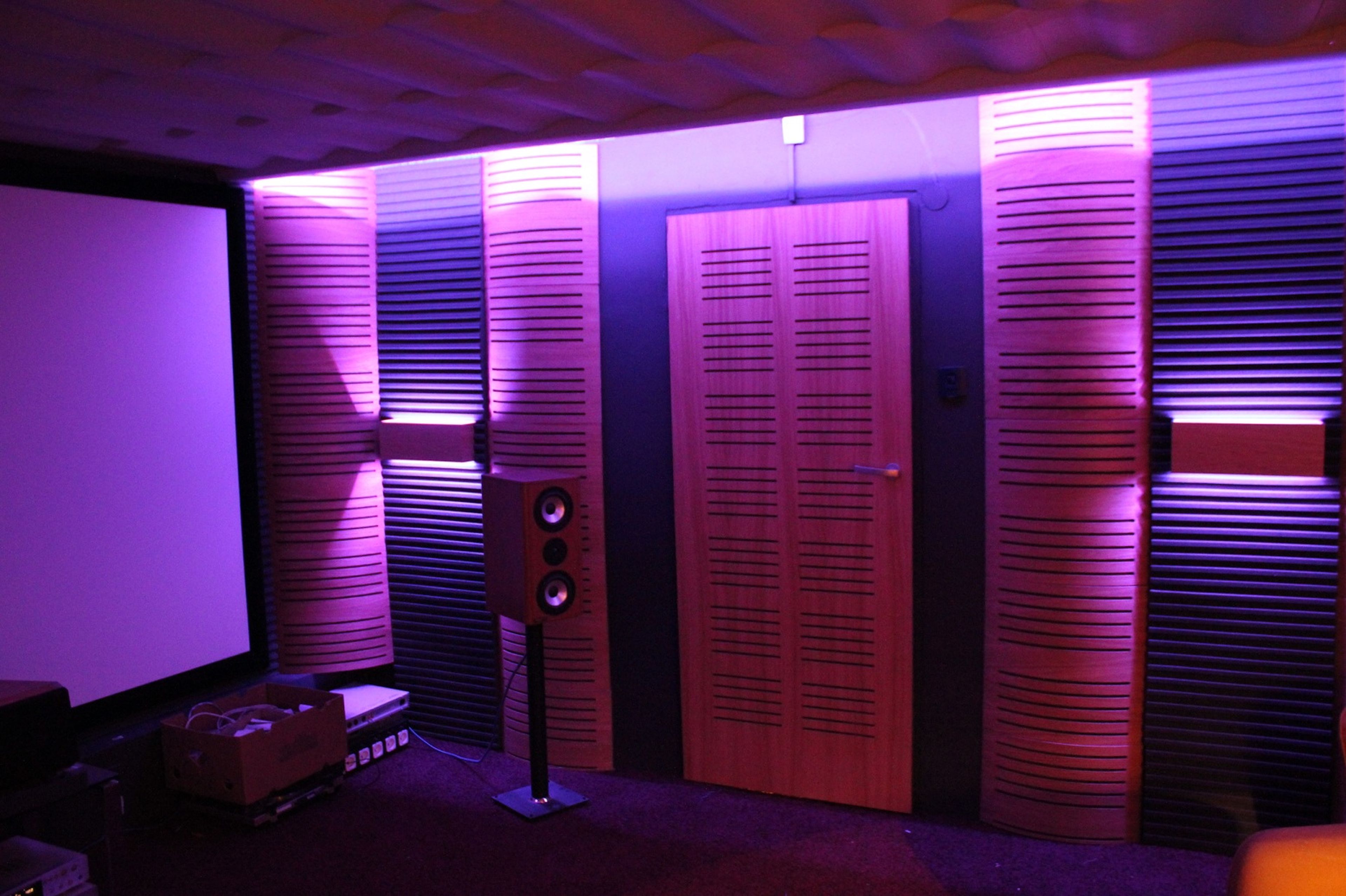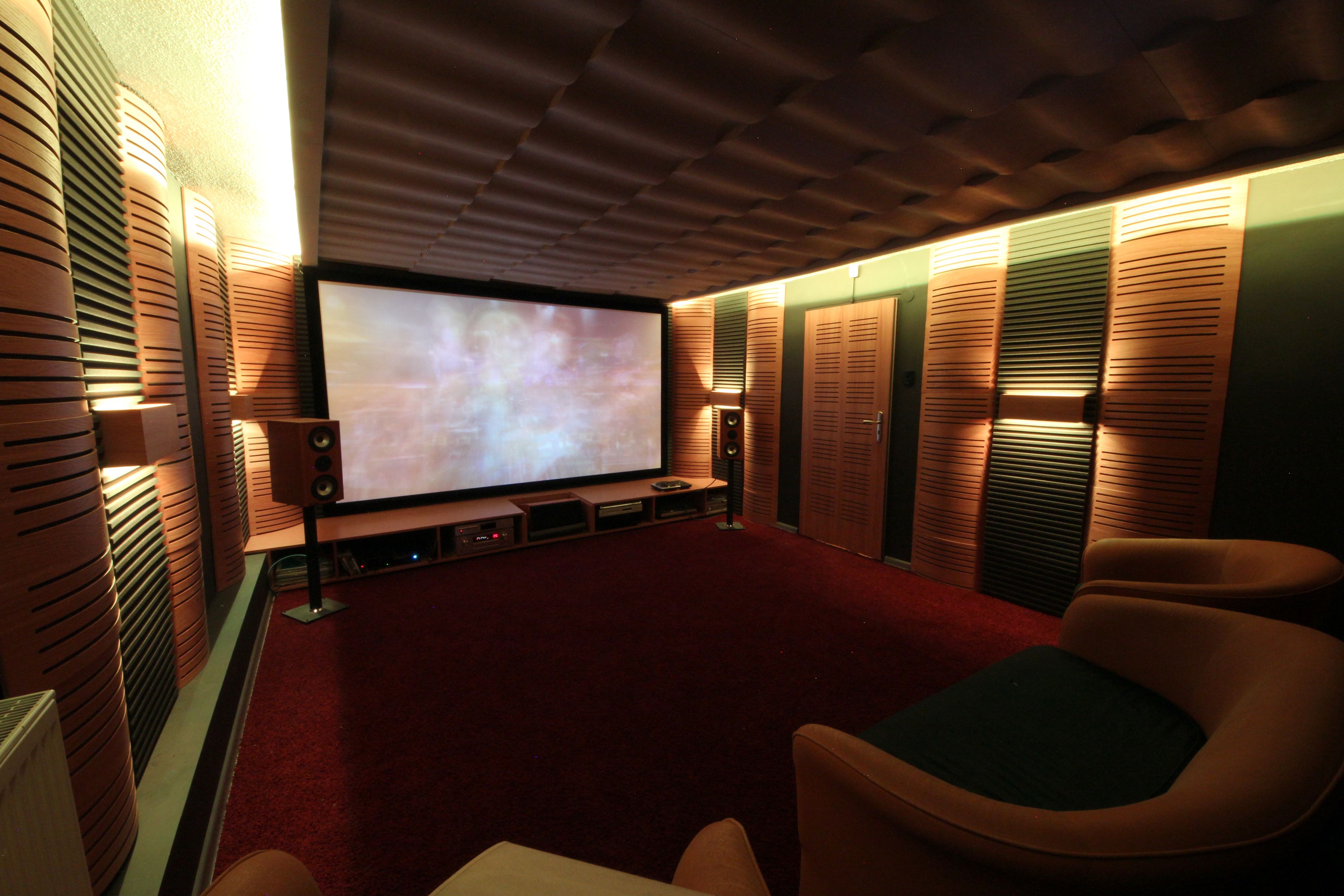 Wnętrze w dużej mierze wykończyliśmy wykorzystując strojone, drewniane panele WoodenWall. Ich konstrukcja pozwala pochłaniać wybrane zakresy częstotliwości, dzięki czemu dźwięk pozostaje naturalny. Perforowana powierzchnia w połączeniu z ukrytym we wnętrzu materiałem pochłaniającym redukuje pogłos i poprawia czytelność dialogów, co w kinie domowym ma kluczowe znaczenie. Dodatkowe pochłanianie zapewniają panele piankowe Dune.