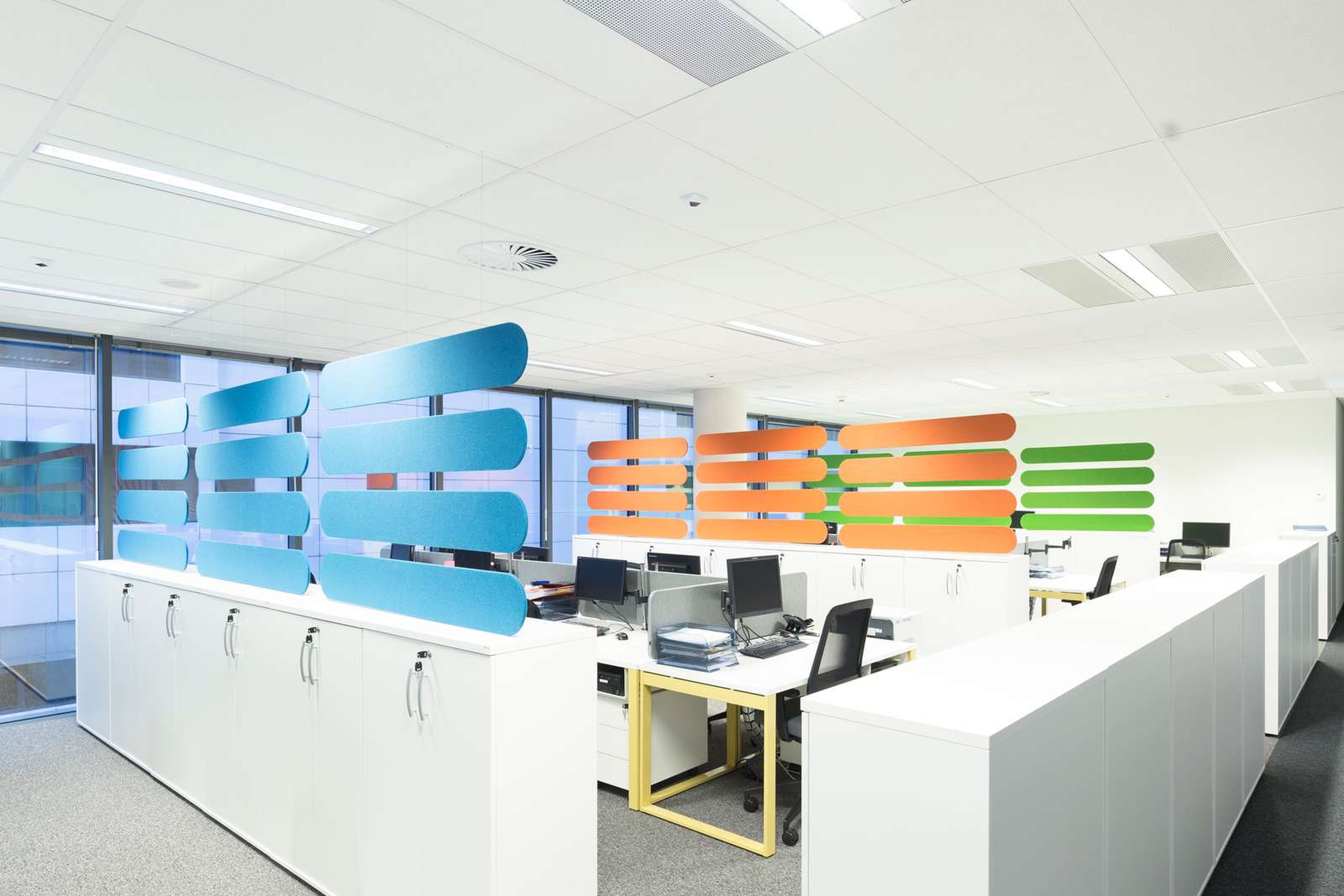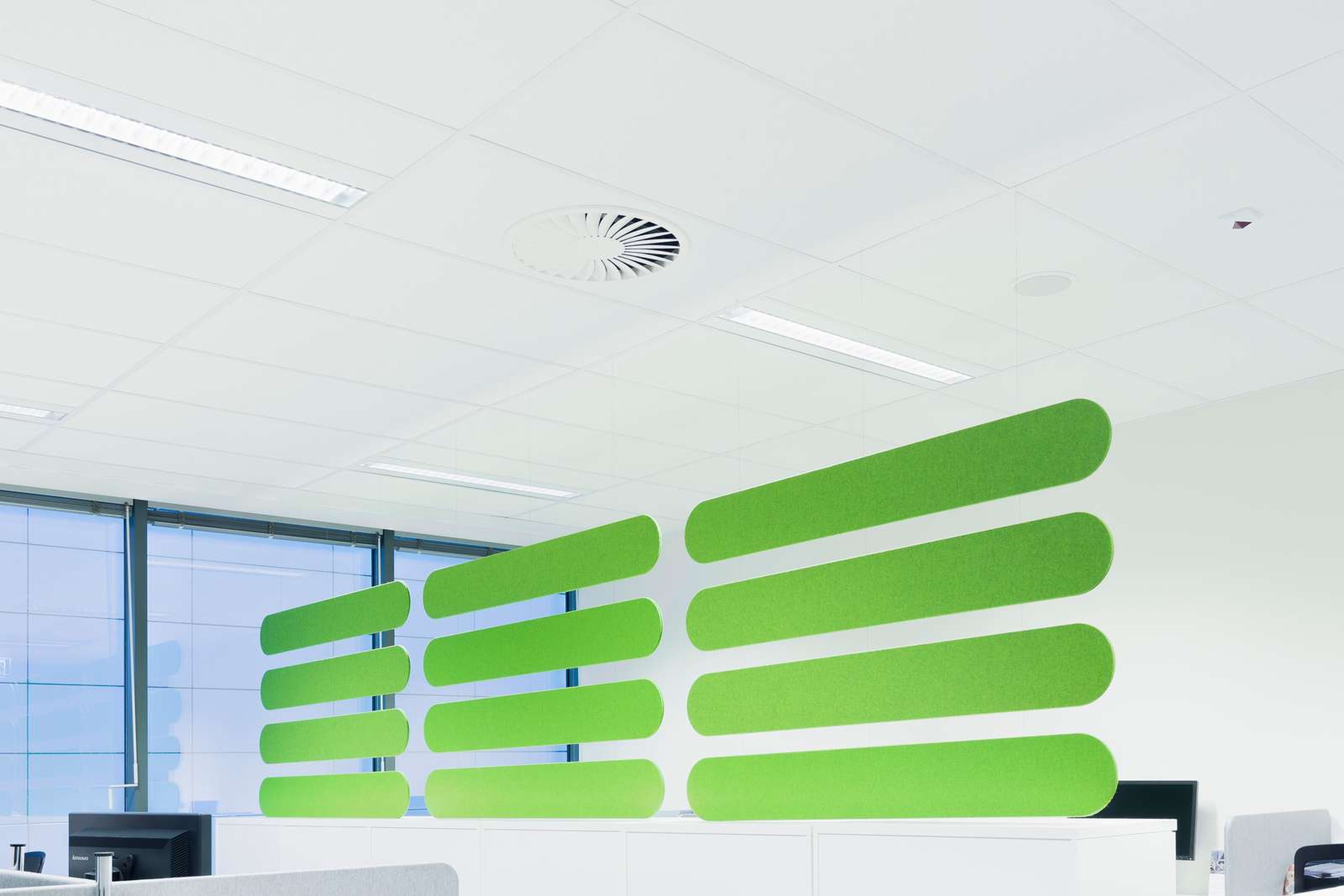 Priorytetem w rozległej przestrzeni open space było wprowadzenie czytelnej struktury bez rezygnacji z otwartego charakteru wnętrza. Horyzontalne EcoDivider Hanging zawieszone nad linią szaf wyraźnie zaznaczają granice poszczególnych zespołów, jednocześnie zachowując dostęp do światła dziennego.