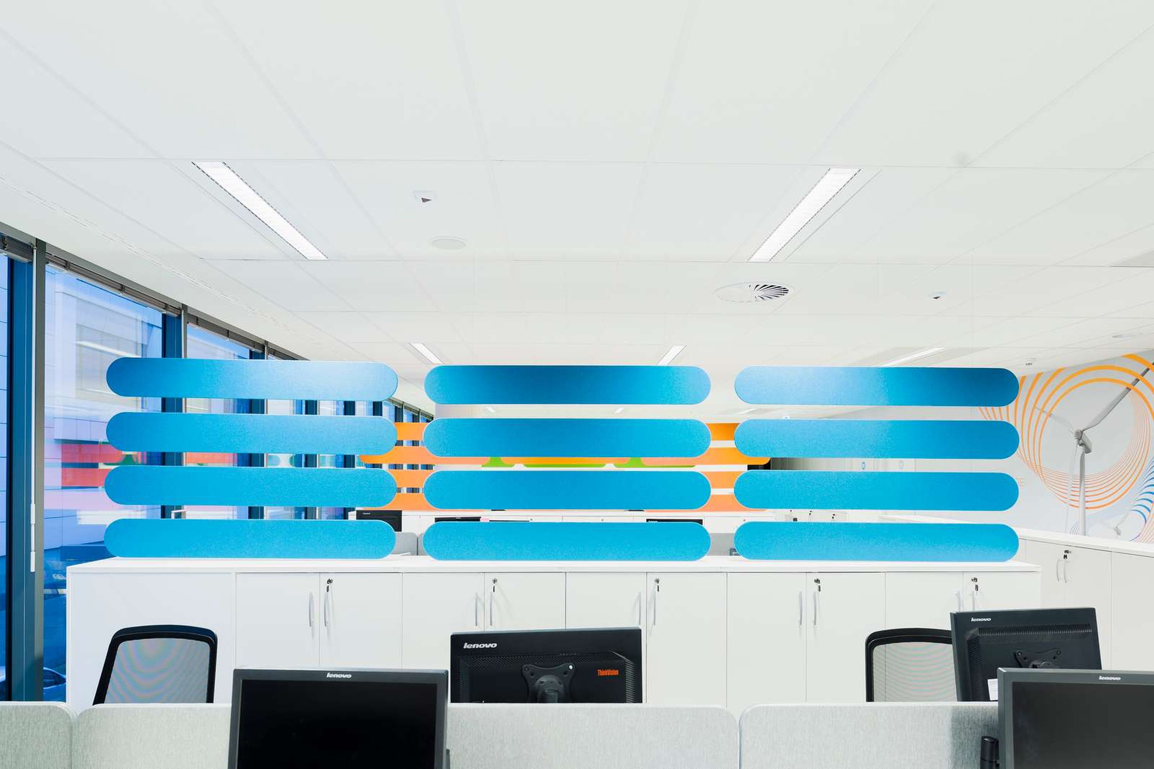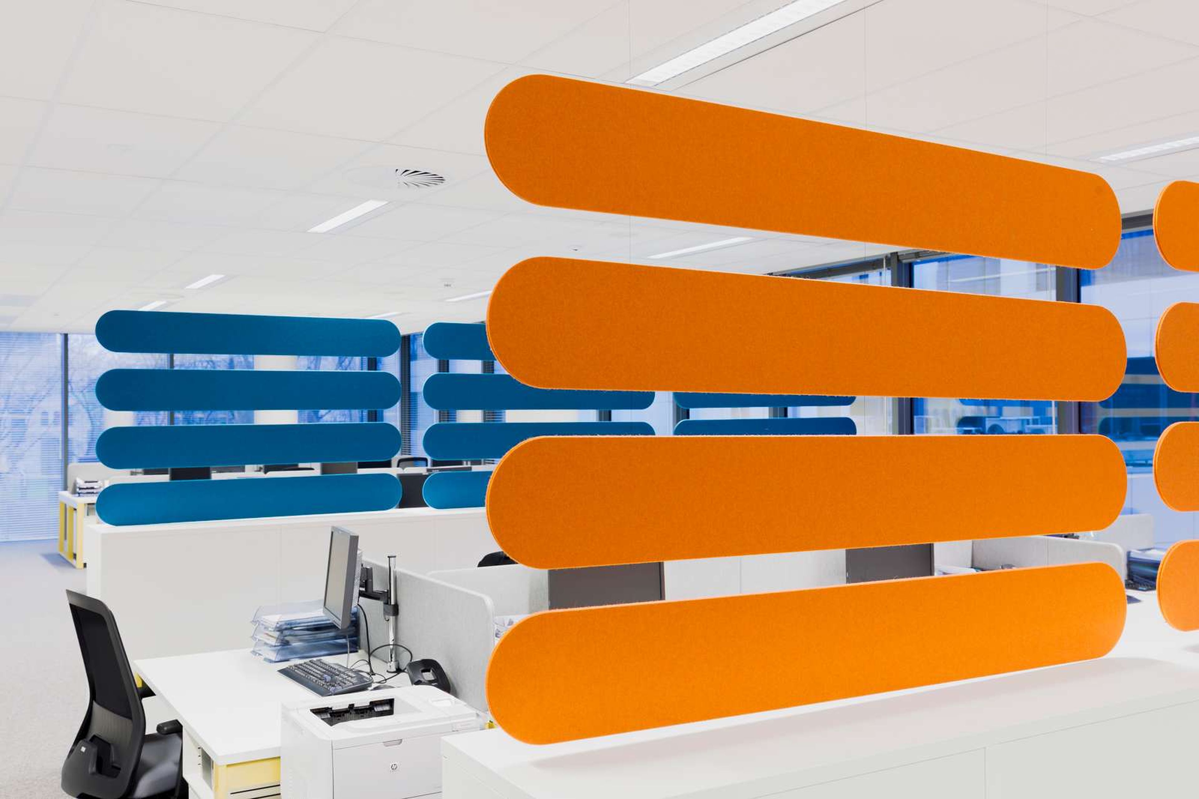 Intensywne kolory wpisane identyfikację wizualną marki przechwytują dźwięk na wysokości rozmów, ograniczając jego rozchodzenie się pomiędzy strefami pracy. Dzięki trójwarstwowej konstrukcji z filcu PET, w tym perforowanej warstwie środkowej, EcoDivider Hanging skutecznie redukują pogłos i poprawiają komfort akustyczny bez potrzeby wprowadzania ciężkich, pełnych ścian.