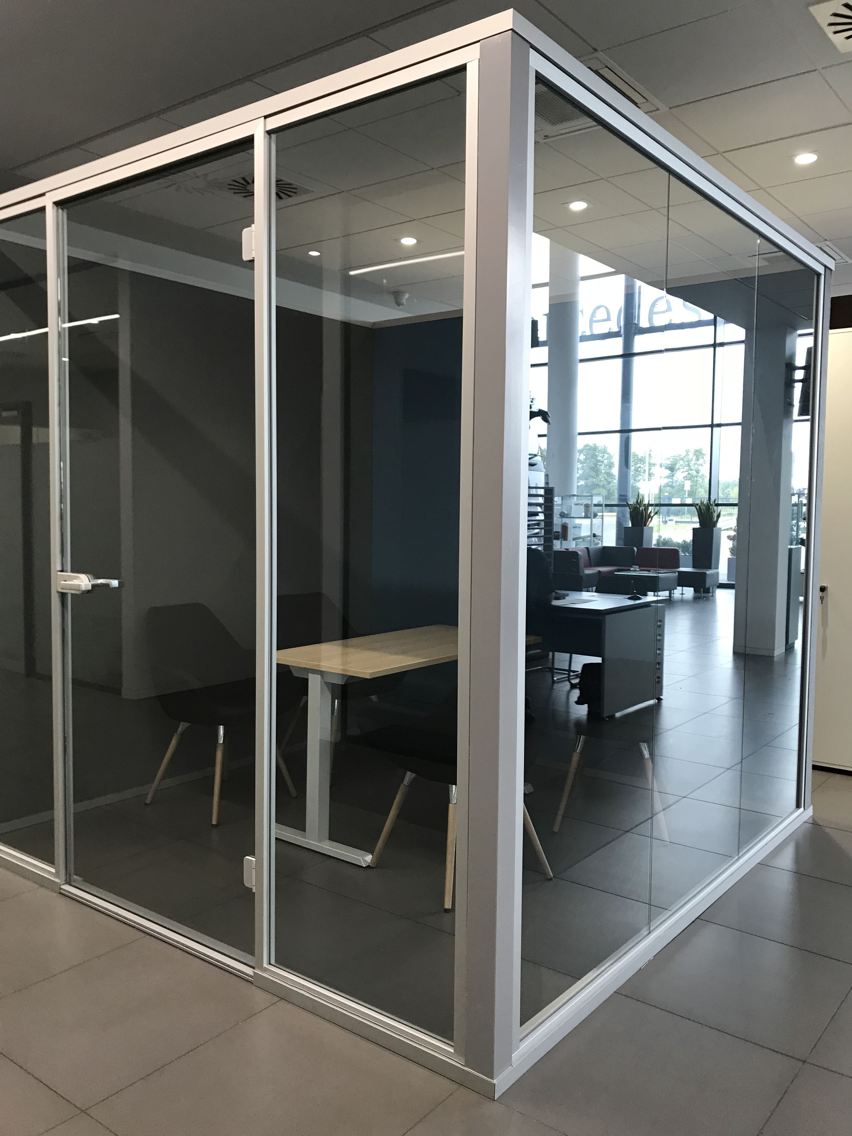 Dwie w czterech ścian wykonane z wykorzystaniem specjalnego szkła akustycznego zapewniają wizualną lekkość i kontakt z resztą przestrzeni open space. Pozostałe dwie ściany wykończone systemem NyquiWall. W podkonstrukcji, którego dla wzmocnienia izolacji zastosowana została pianka akustyczna pełniąca rolę materiału pochłaniającego. To połączenie zapewnia wysoki komfort akustyczny wewnątrz mobilnego pokoju spotkań – poprawia zrozumiałość mowy, redukuje pogłos i eliminuje niepożądane odbicia dźwięku. Dodatkowo użyta izolacja akustyczna ogranicza przenikanie rozmów do strefy open space, co zwiększa poufność spotkań i minimalizuje rozpraszający hałas w biurze.