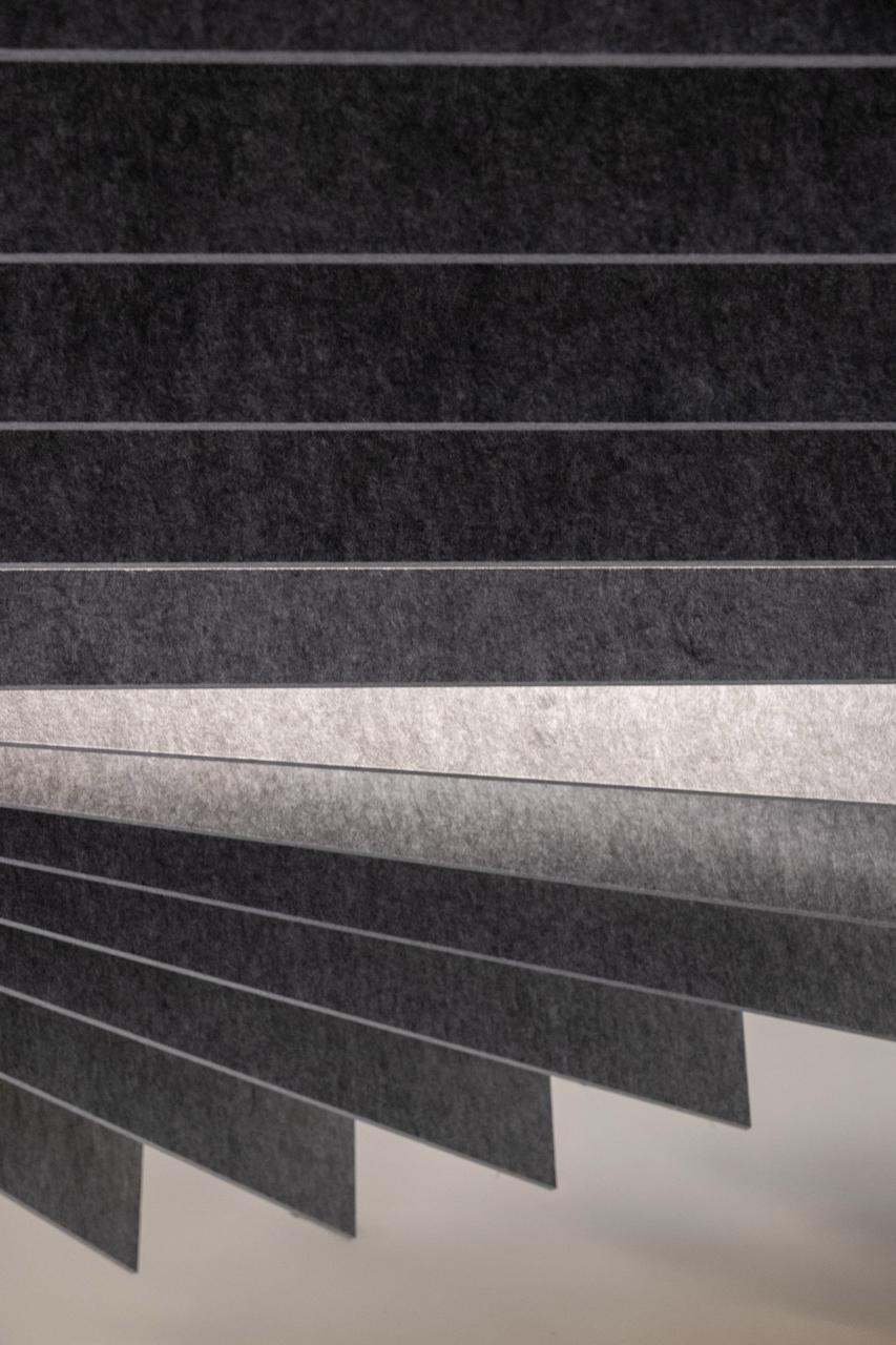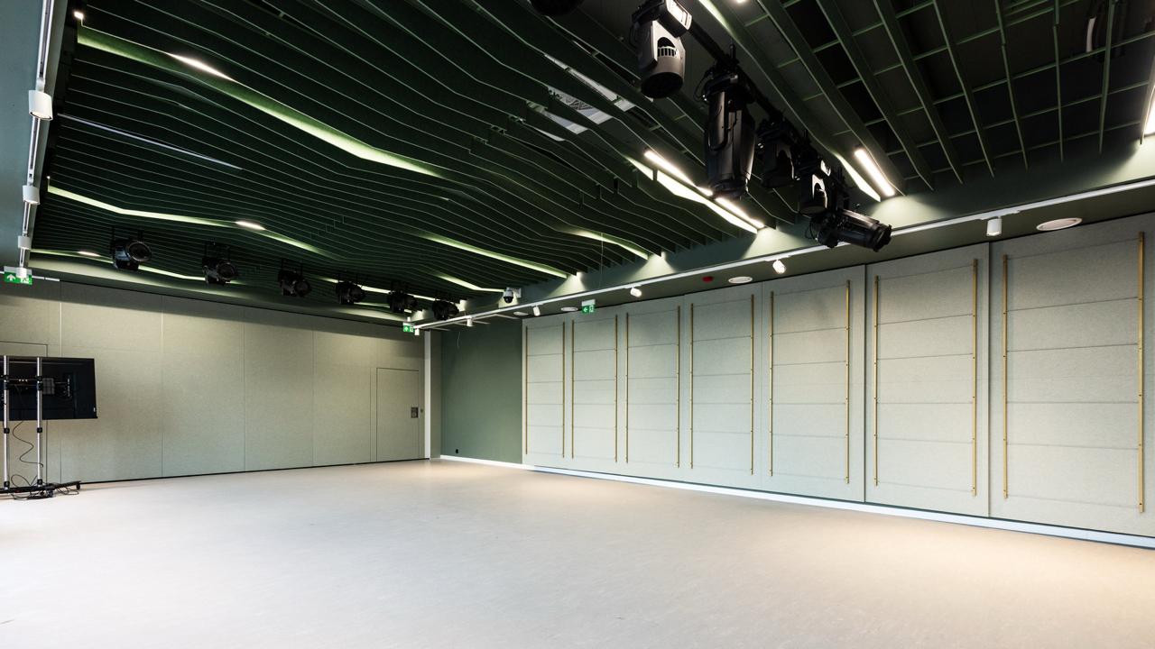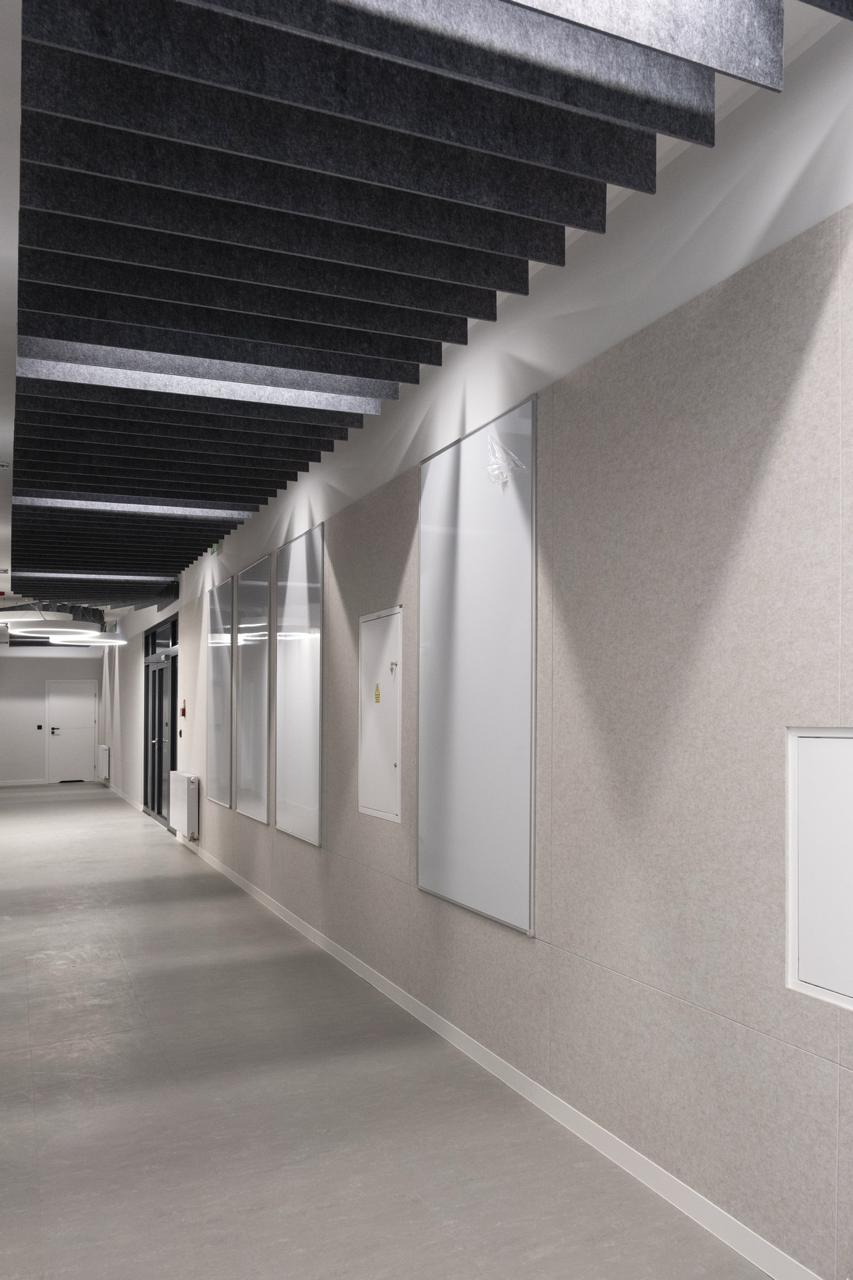 Salę widowiskową oraz ciągi komunikacyjne zaaranżowaliśmy wykorzystując sufitowy system EcoBaffle na kilka sposobów. Skutecznie pochłaniają dźwięk, a nieregularność w osi zawieszenia, a także różnice w kształcie samych baffli podkreślają głębię i kierunkowość przestrzeni. Długie korytarze nie niosą już pogłosu.