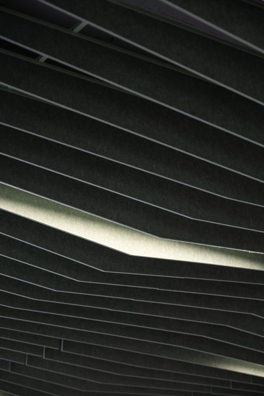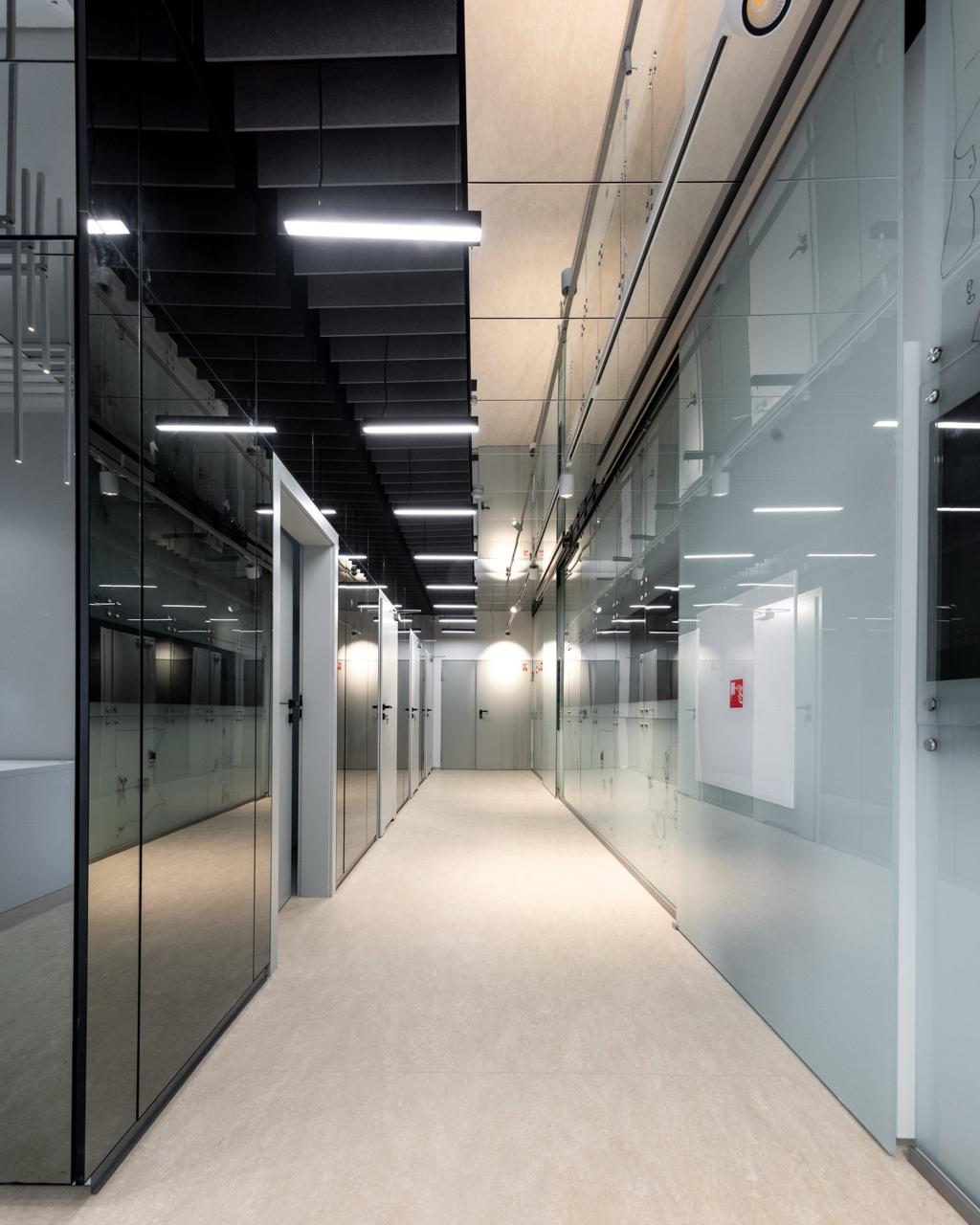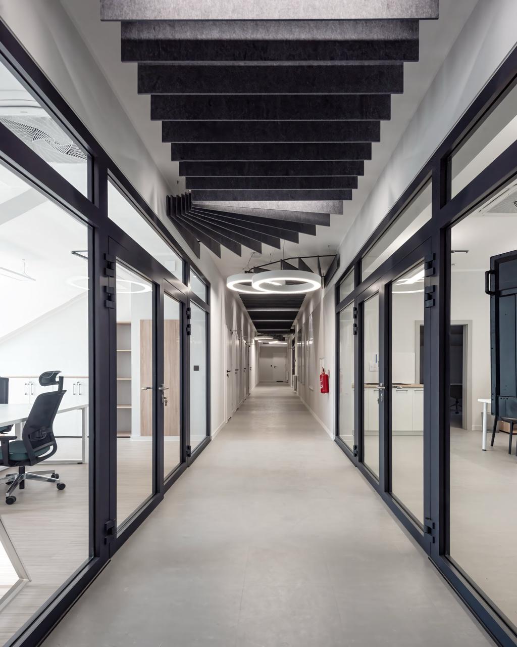 Salę widowiskową oraz ciągi komunikacyjne zaaranżowaliśmy wykorzystując sufitowy system EcoBaffle na kilka sposobów. Skutecznie pochłaniają dźwięk, a nieregularność w osi zawieszenia, a także różnice w kształcie samych baffli podkreślają głębię i kierunkowość przestrzeni. Długie korytarze nie niosą już pogłosu.