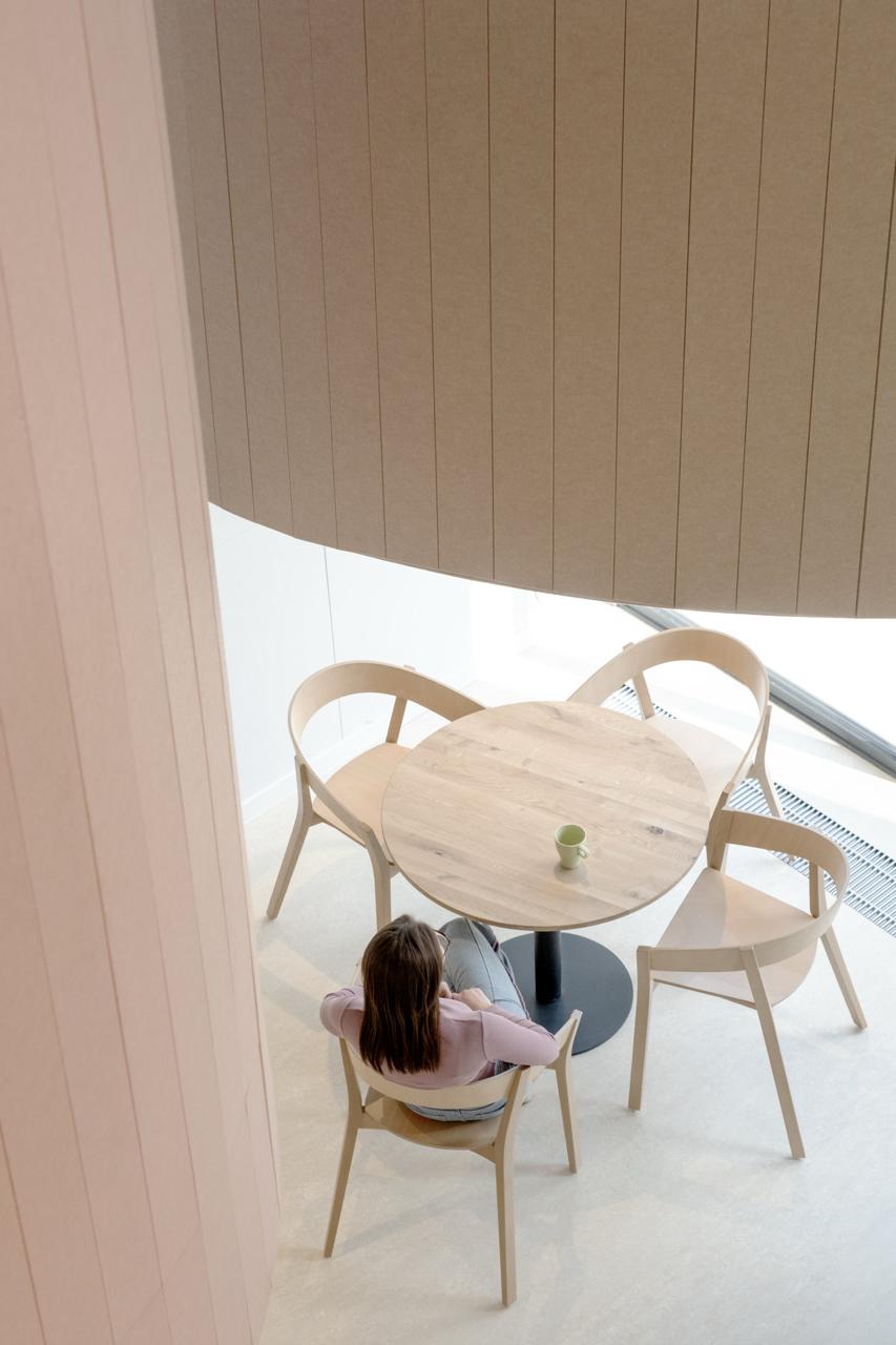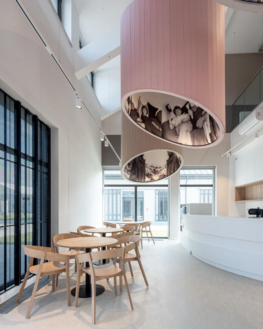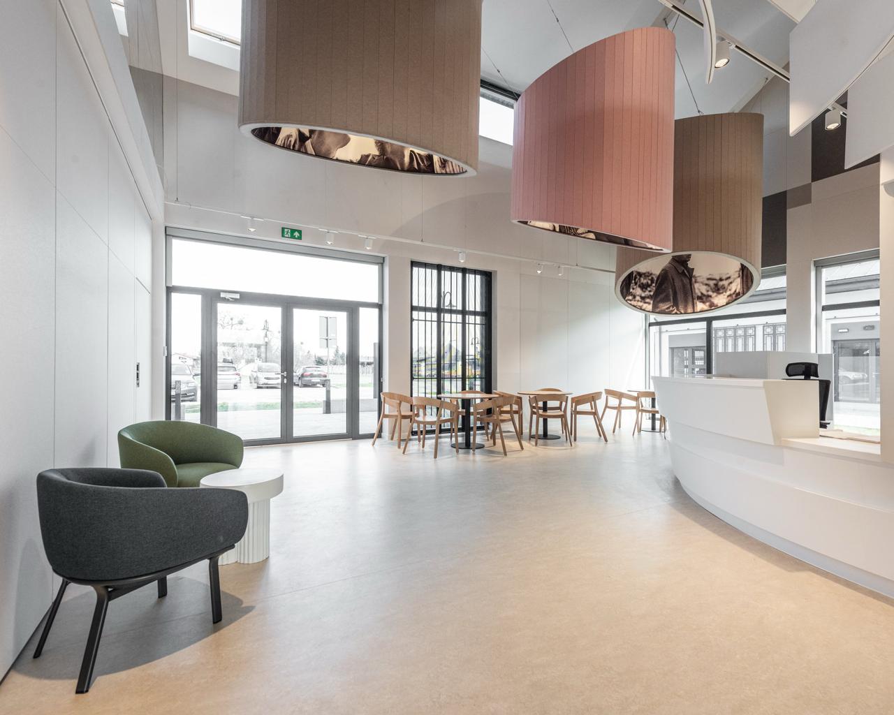 Wysoka przestrzeń lobby zyskała wsparcie dzięki podwieszonym tubom ekspozycyjnym wykończonym ekologicznym materiałem PET. Działają na zasadzie wysp sufitowych, pochłaniają dźwięk tam, gdzie zwykle pojawia się jego kumulacja. Tutaj szczególnie wybrzmiewa ważna rola akustyki, zaopiekowana przestrzeń muzeum nie przytłacza, za to pozwala wejść zwiedzającym w rytm całej ekspozycji.