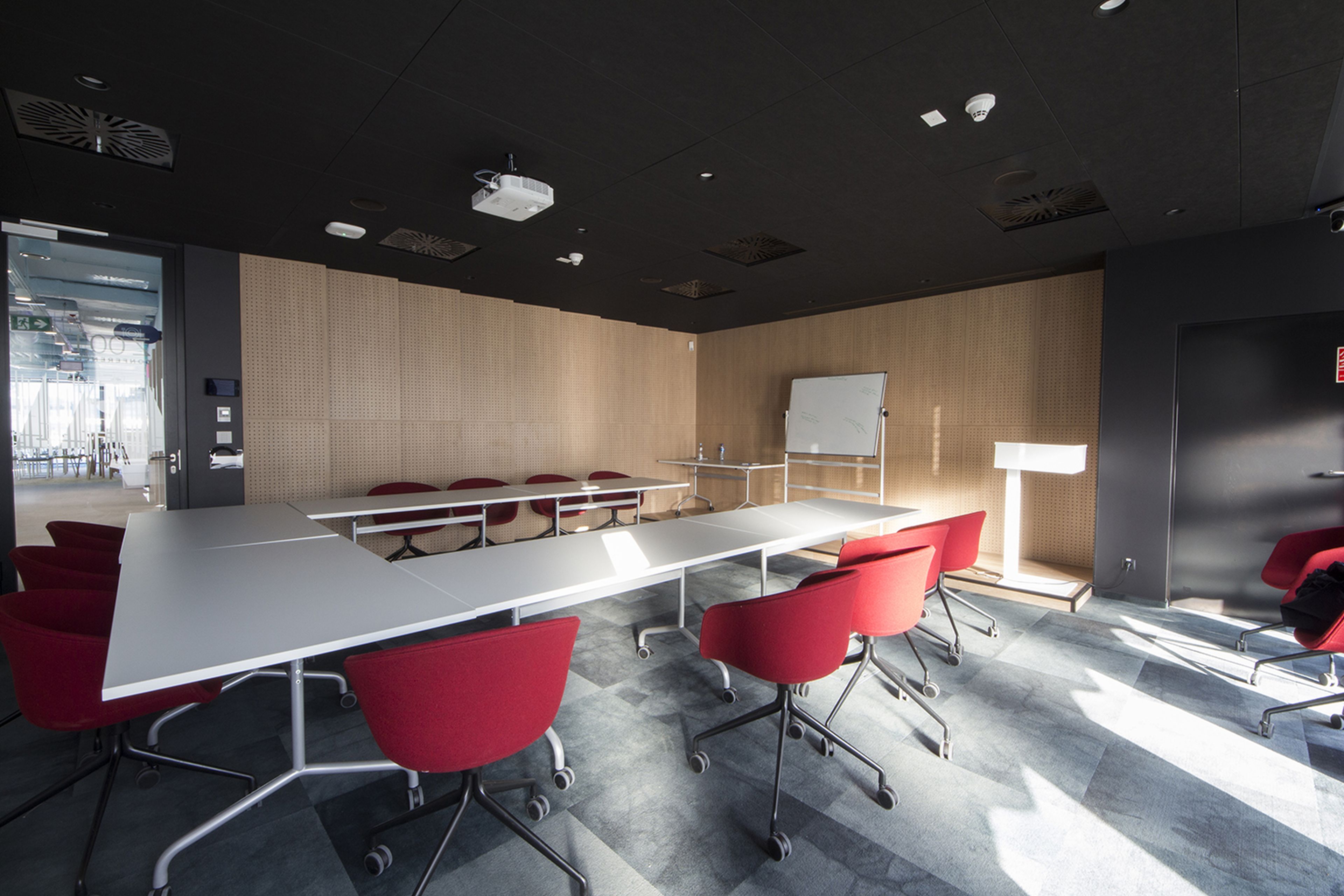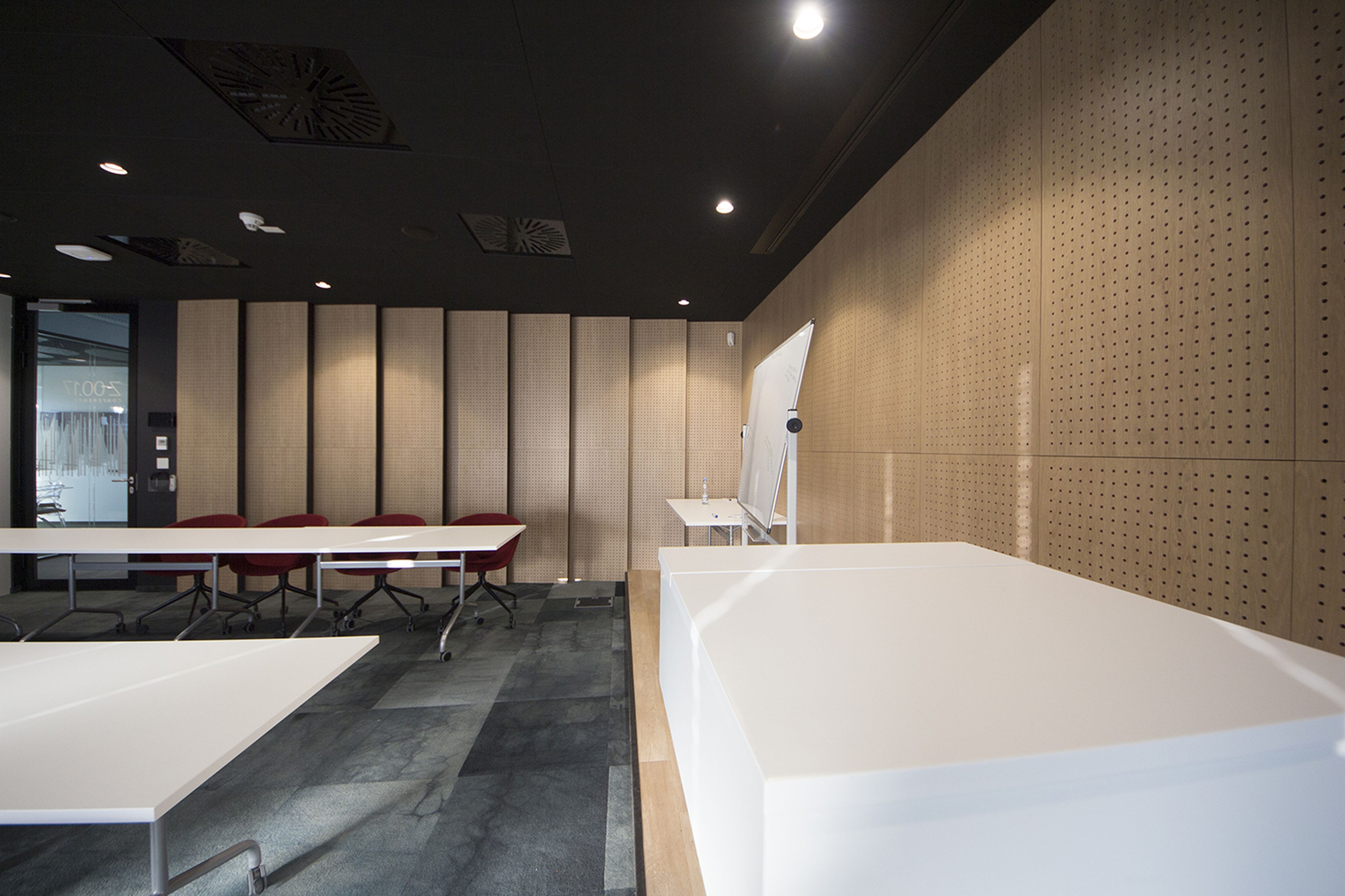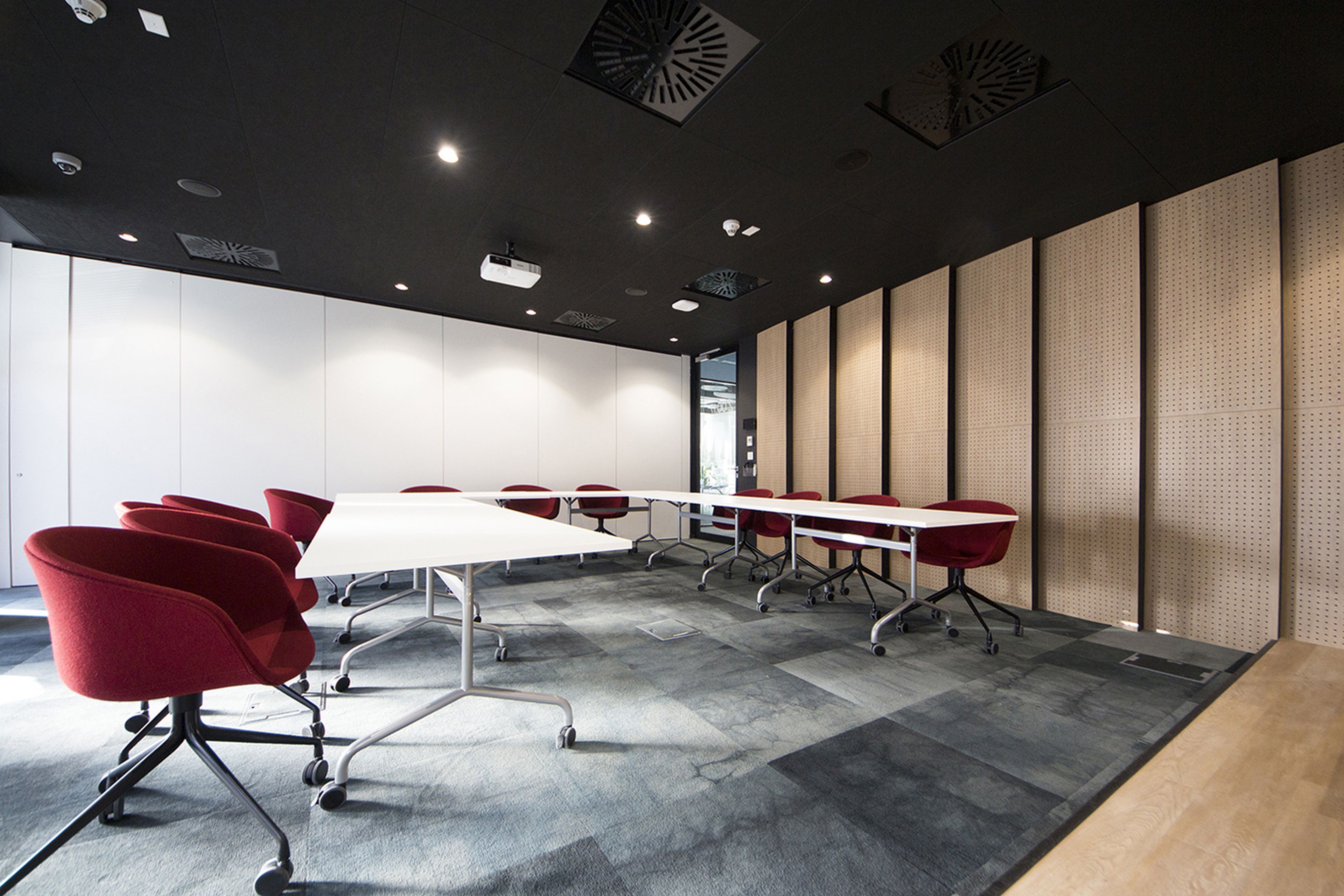 Ważnym elementem realizacji jest elastyczność. Sala działa zarówno jako jedna większa przestrzeń, jak i podzielona na mniejsze części, bez utraty jakości akustycznej. Spotkania odbywają się bez konieczności korzystania z dodatkowego nagłośnienia, co było jednym z głównych założeń projektu.