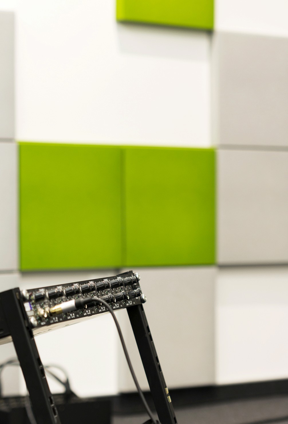Adaptacja akustyczna została oparta na kilku typach ustrojów pracujących w różnych zakresach częstotliwości. Na ścianach pojawiły się panele Square Fugue. Ich geometryczny układ oraz kontrastowe kolory wprowadzają wyraźny charakter wizualny w przestrzeni studia. Natomiast przestrzeń pod skosami strategicznie wykorzystaliśmy do zabudowy membranowych pułapek basowych. Zarówno pułapki basowe, jak i część ustrojów ściennych – zostały ukryte pod systemem napinanych ścian NyquiWall.