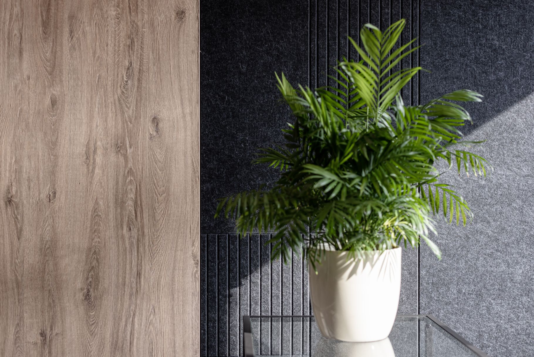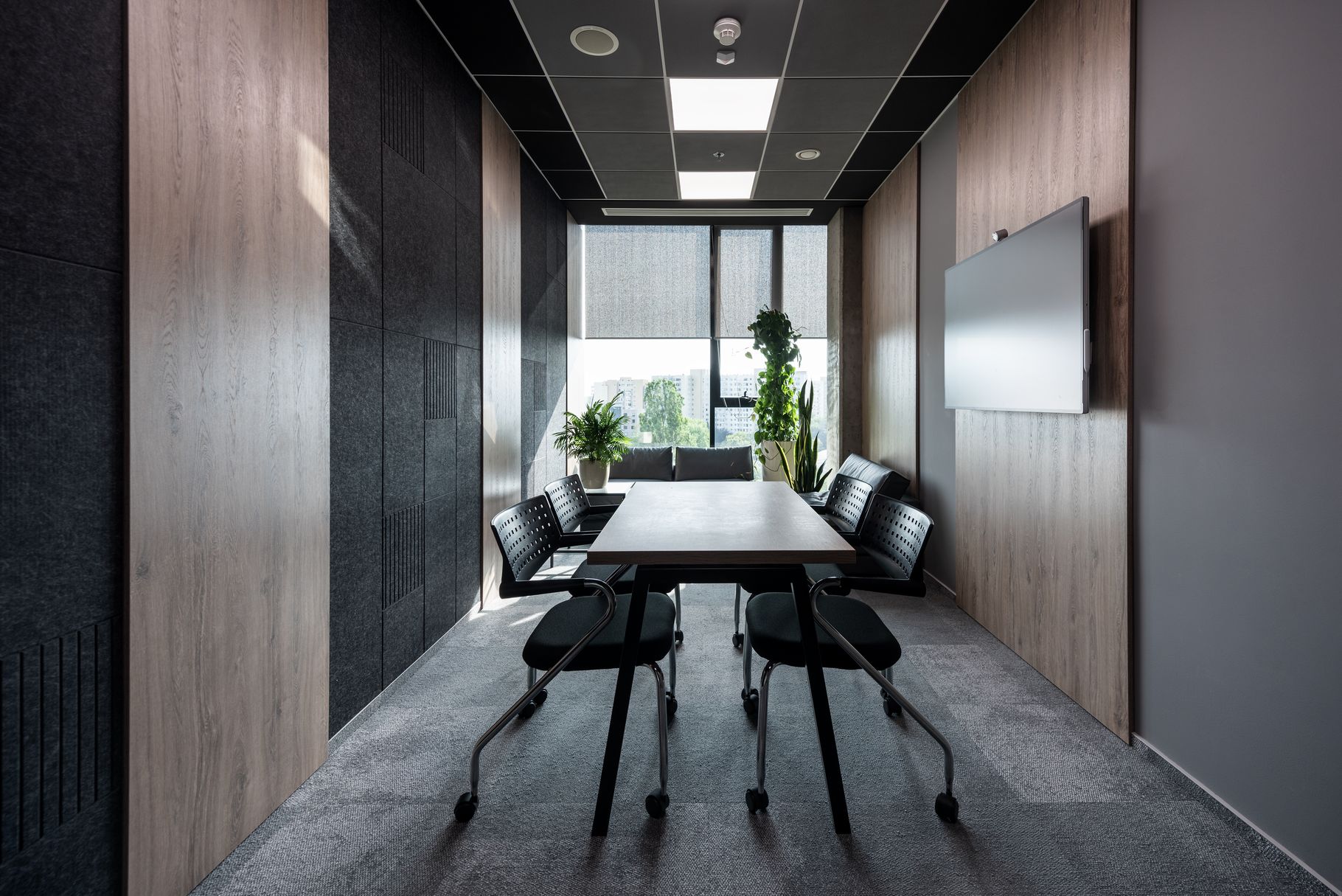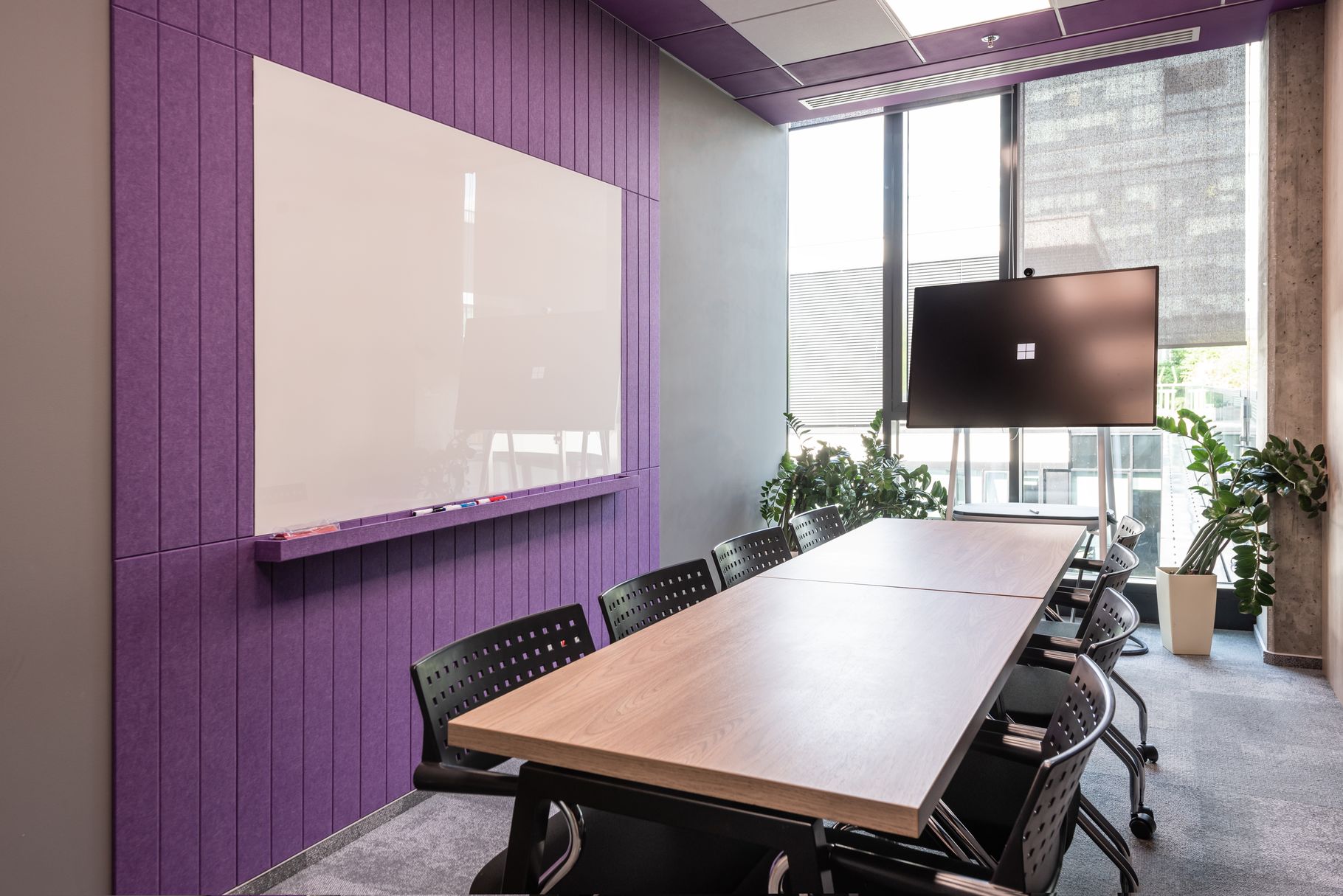 Od gładkich powierzchni po subtelnie frezowane podziały ścian, sale spotkań i strefy lounge zostały wyposażone w rozwiązania EcoWall Basic oraz EcoWall Shape. Całości dopełniają akustyczne kasetony EcoCeiling, które przejmują kontrolę nad odbiciami w skali całego sufitu. To szczególnie istotne w niewielkich, intensywnie użytkowanych pomieszczeniach. Nasze panele, skutecznie redukują pogłos i poprawiają zrozumiałość mowy.