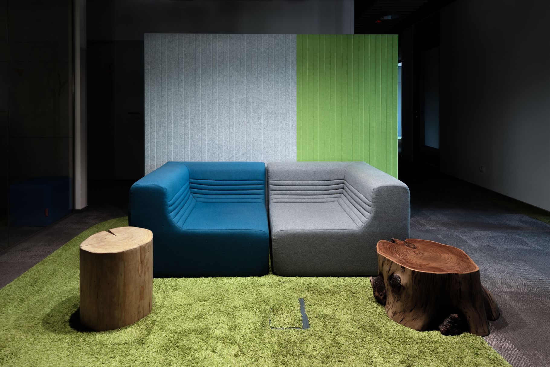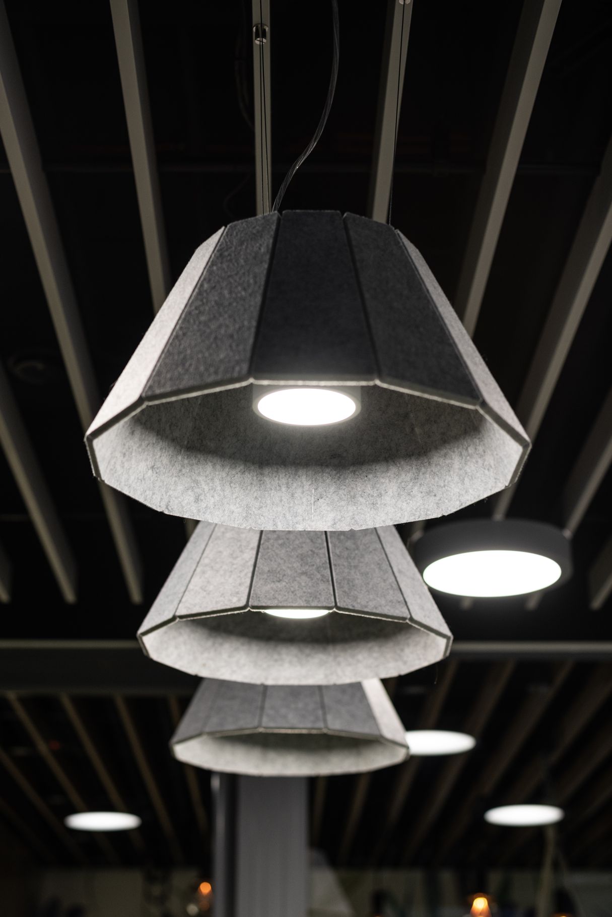 Istotnym elementem projektu są również oprawy EcoLamp które pełnią rolę dodatkowych absorberów sufitowych. Geometryczna forma i miękka, filcowa struktura wpisują się w spójny system akustyczny. Za to OfficeDivider wyznacza czytelne granice w otwartej strefie relaksu.