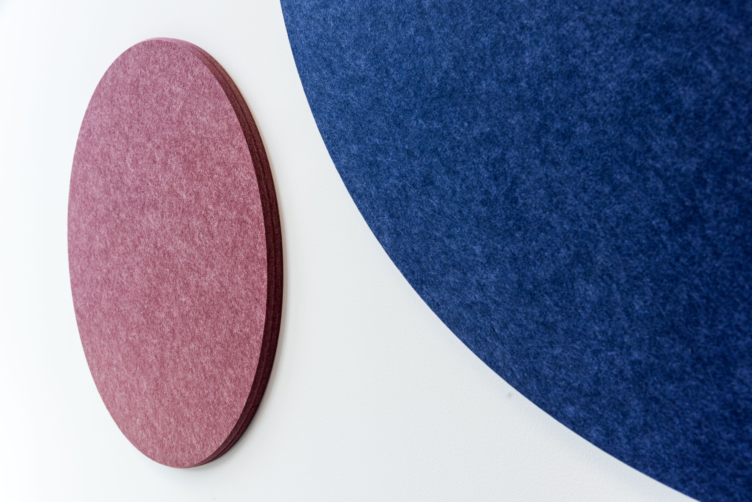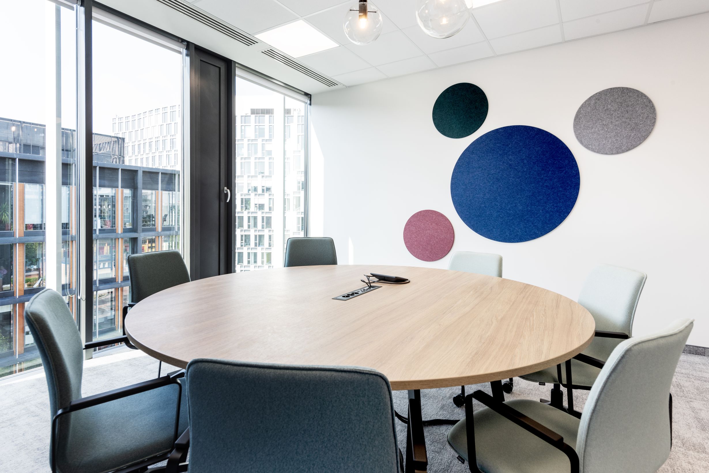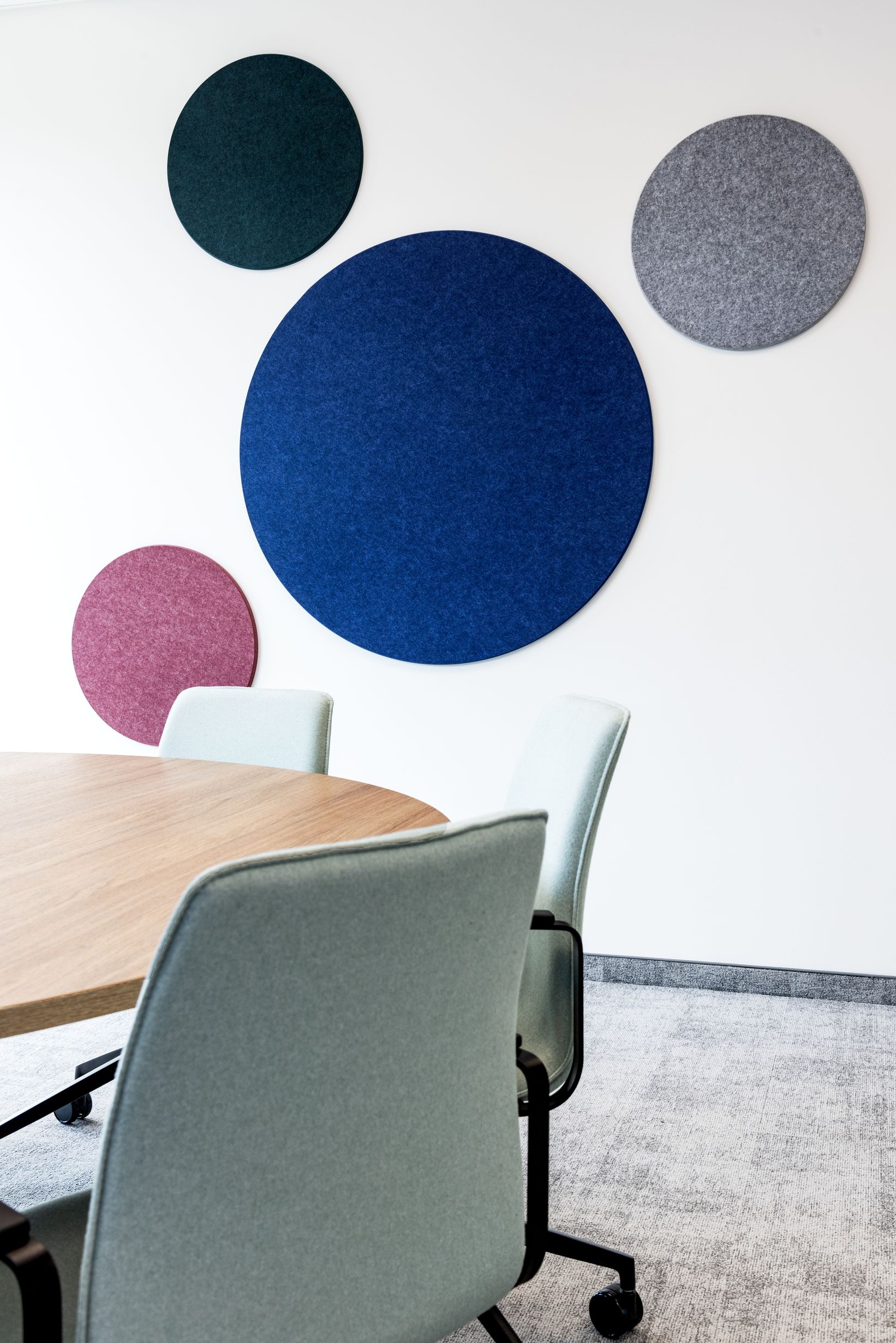 W mniejszej sali konferencyjnej pojawiła się kompozycja złożona z okrągłych paneli EcoTiles. Akustyczne właściwości materiału z którego zostały wykonane, ograniczają niepożądane odbicia dźwięku i poprawiają komfort rozmów. Zróżnicowana średnica i kolory tworzą wspólnie lekką, graficzną kompozycję. Całość ożywia minimalistyczne wnętrze oraz doskonale koresponduje z okrągłym stołem, przełamując surowość białych ścian i dużych przeszkleń.