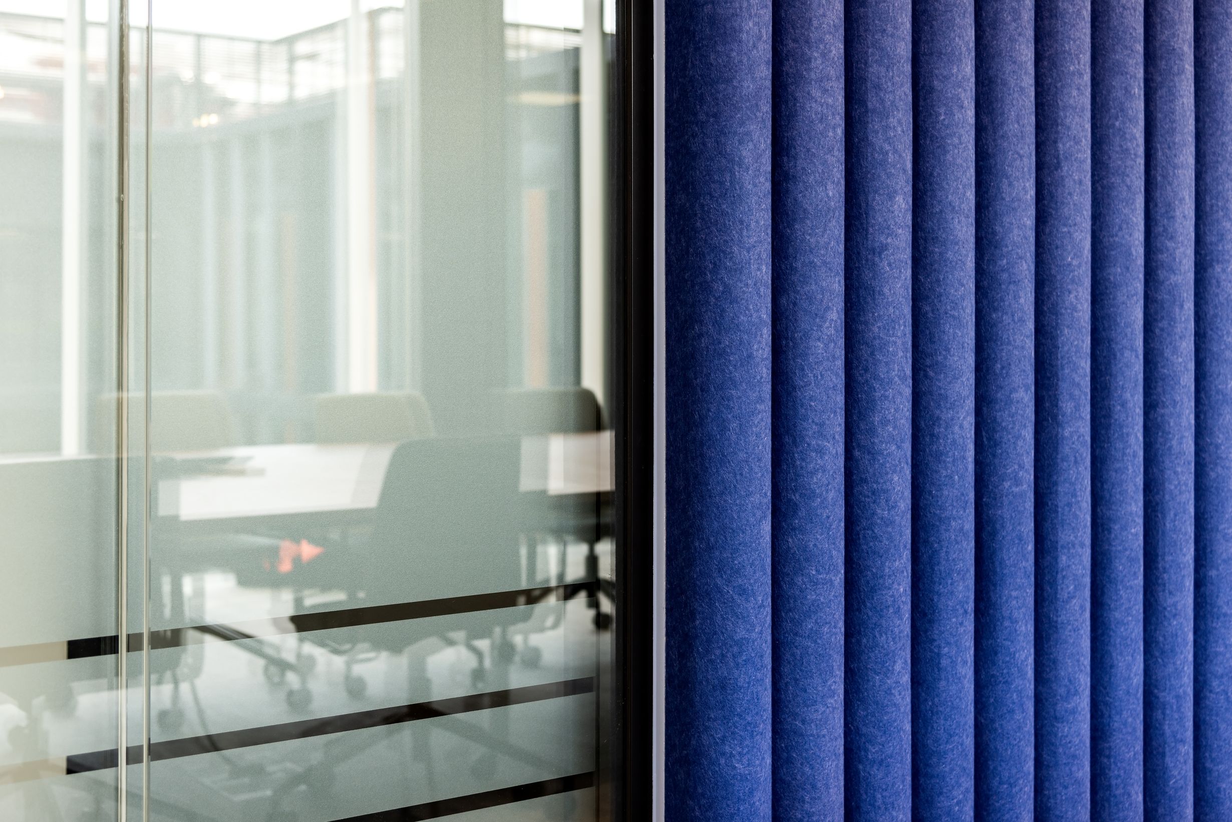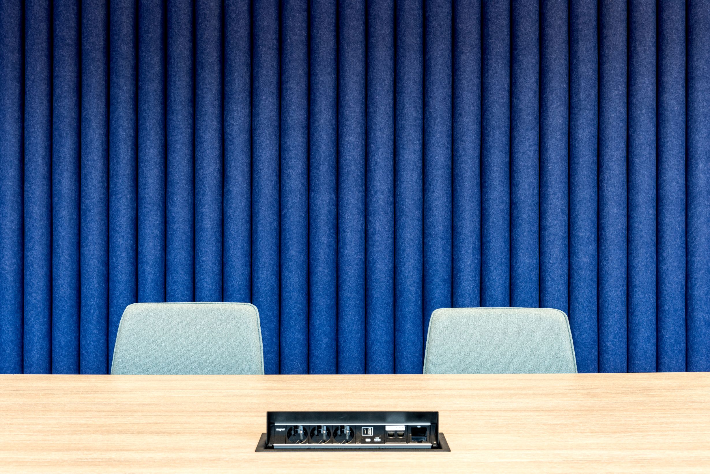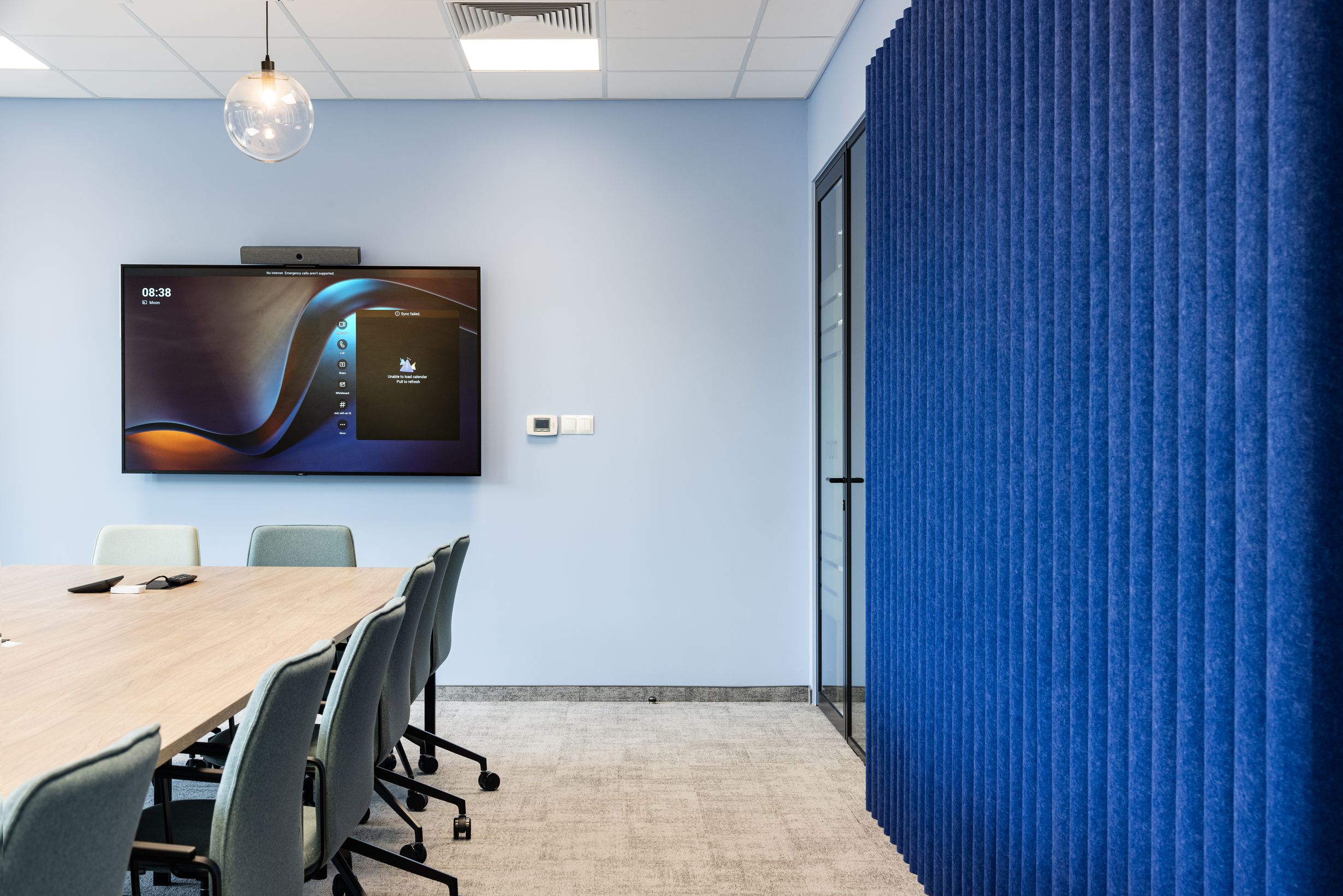 Większa przestrzeń konferencyjna wyposażona w rozwiązanie EcoWall Roll. Charakterystyczna niebieska ściana zbudowana z półokrągłych wałków, subtelnie wprowadza trójwymiarowy efekt. Nasze akustyczne instalacje tworzymy przy użyciu ekologicznego filcu PET. To materiał pozyskiwany z w wyniku recyklingu plastikowych butelek, jest estetyczny i odporny na użytkowanie dzięki czemu zachowuje doskonały wygląd przez lata. W efekcie przestrzeń zachowuje swoją otwartość i nowoczesny charakter, a rozmowy prowadzone przy stole konferencyjnym pozostają komfortowe jak nigdy wcześniej.