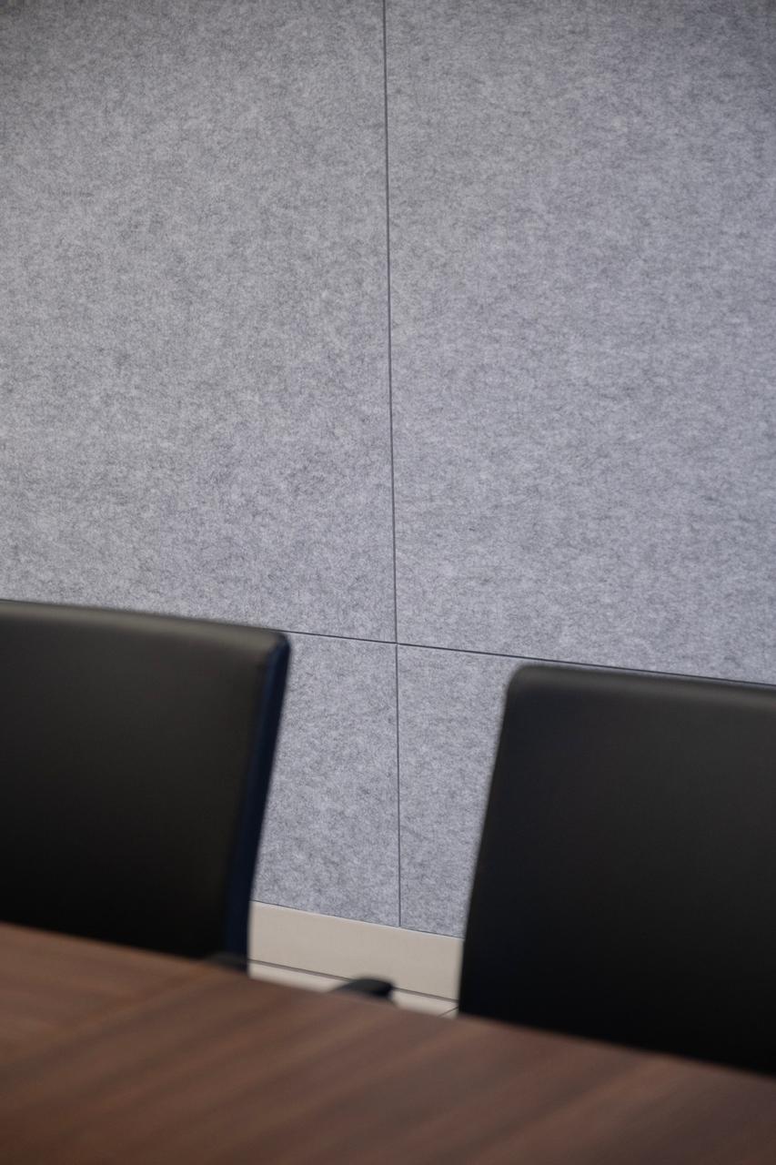 Do wykończenia ścian wykorzystaliśmy system EcoWall oraz EcoStripes. Panele skutecznie stabilizują warunki akustyczne niezależnie od liczby uczestników. Delikatne fazowania nadają wnętrzu elegancji, a ich ponadczasowy wzór będzie aktualny przez wiele kolejnych lat.