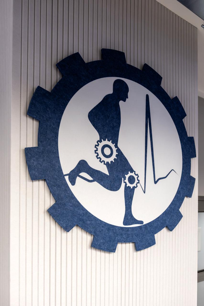 Ciekawym punktem jest logo wydziału, które podobnie jak ściany wykonaliśmy z materiału PET, tego samego, z którego powstają rozwiązania z serii EcoLine. Struktura materiału wspiera pochłanianie dźwięku, a sam znak wpisuje się naturalnie w układ ściany. Ten detal pokazuje wszechstronność i dopracowanie estetyczne przygotowywanych przez Nas projektów.