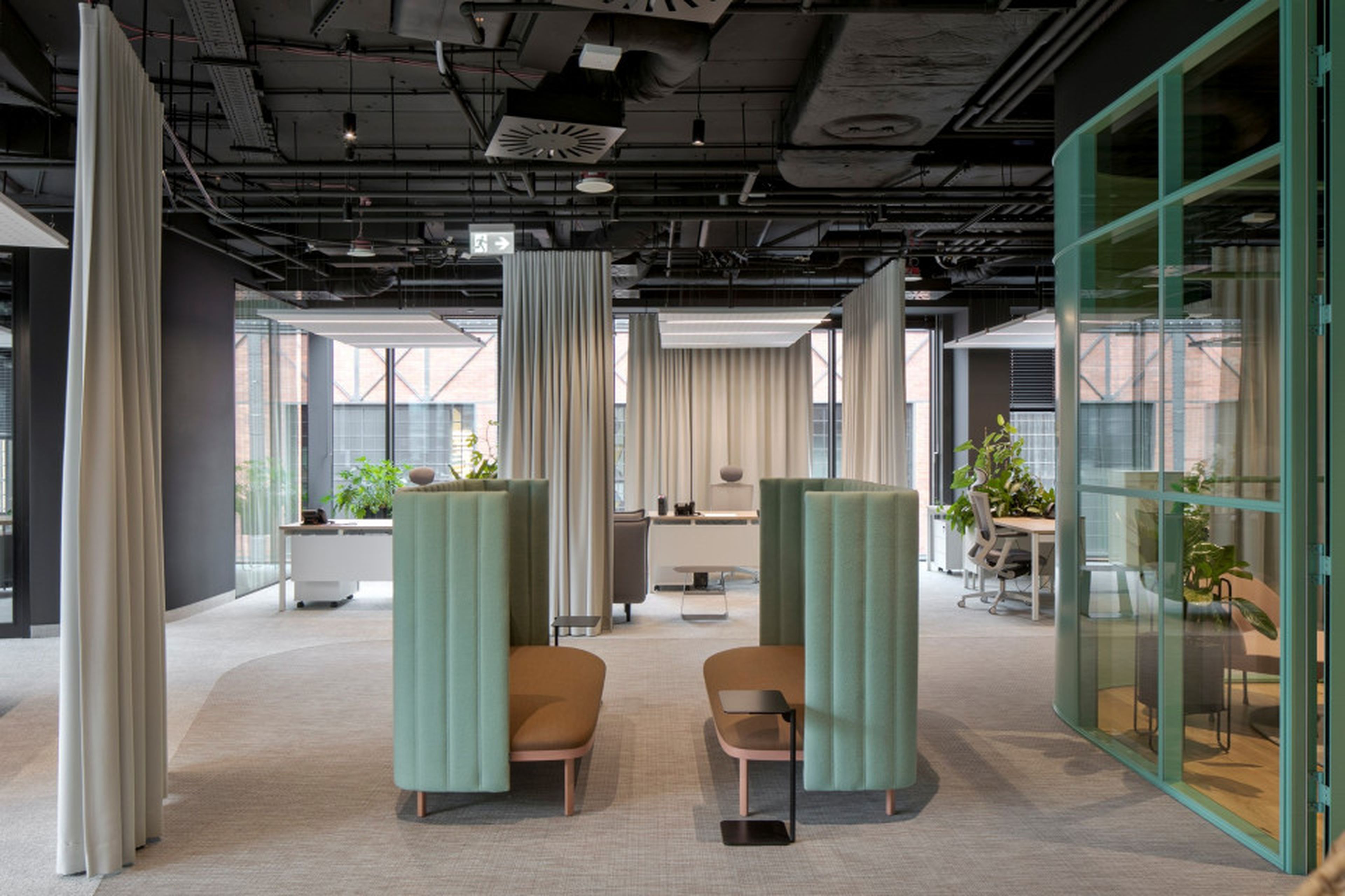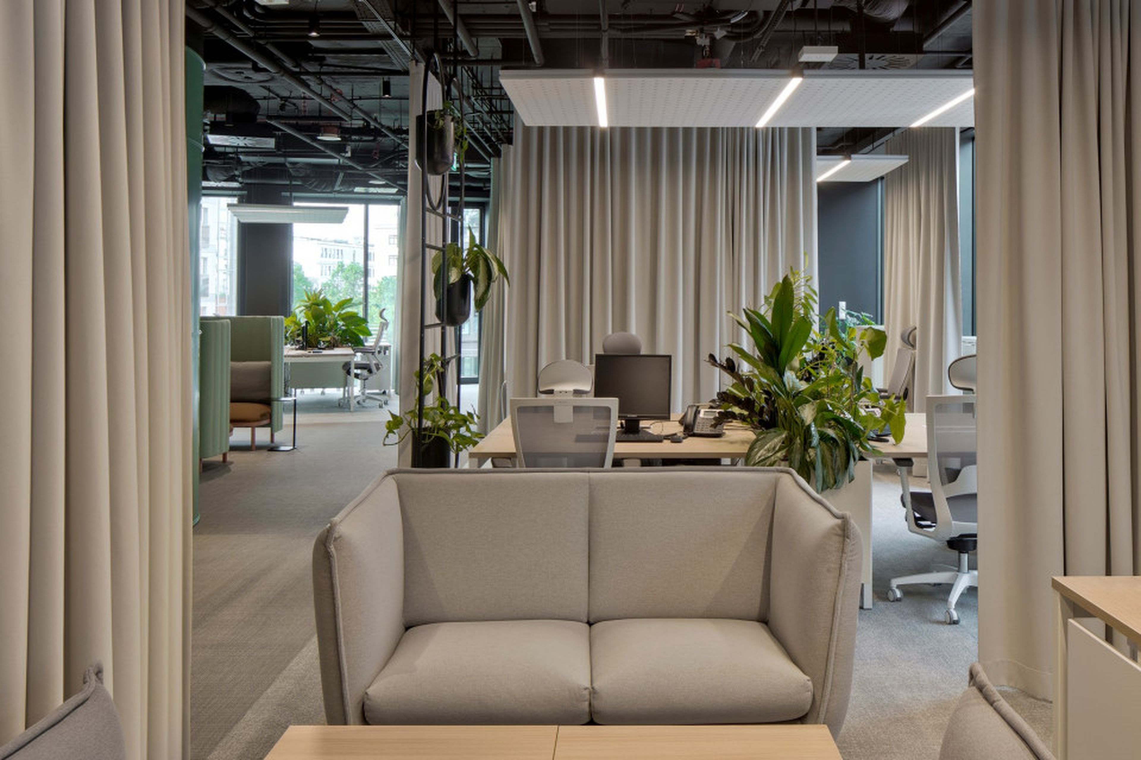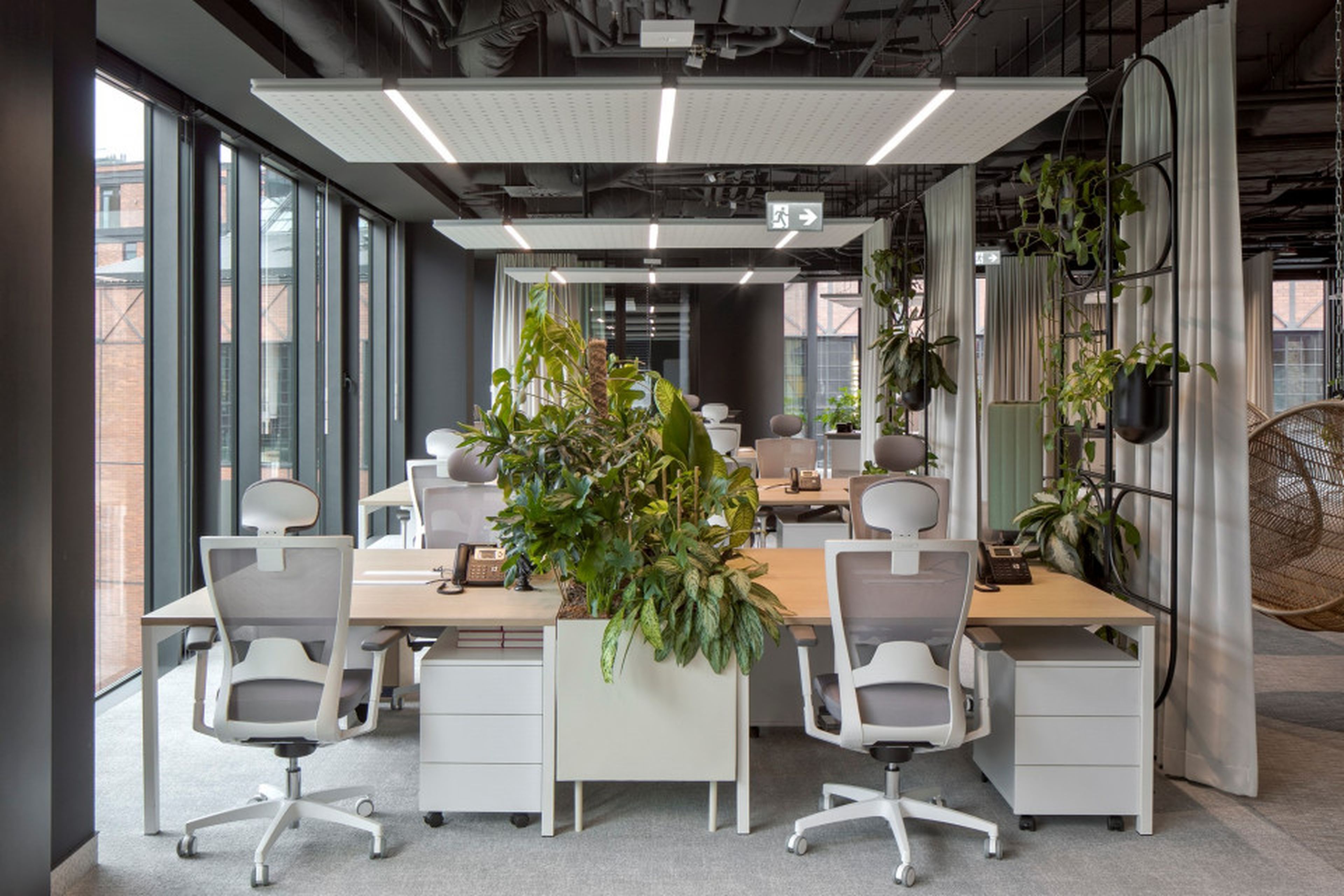 Szczególne znaczenie w akustycznym kształtowaniu przestrzeni odgrywa sufit. Tutaj zastosowanie znalazły nasze charakterystyczne wyspy sufitowe EcoCloud. Geometryczna forma, jasny kolor i zintegrowane oświetlenie. Rozmieszczone strategicznie nad stanowiskami oraz stołami konferencyjnymi. Wysokie właściwości pochłaniania dźwięku poprawiają komfort pracy w otwartych strefach, ograniczając pogłos i wspierając skupienie.