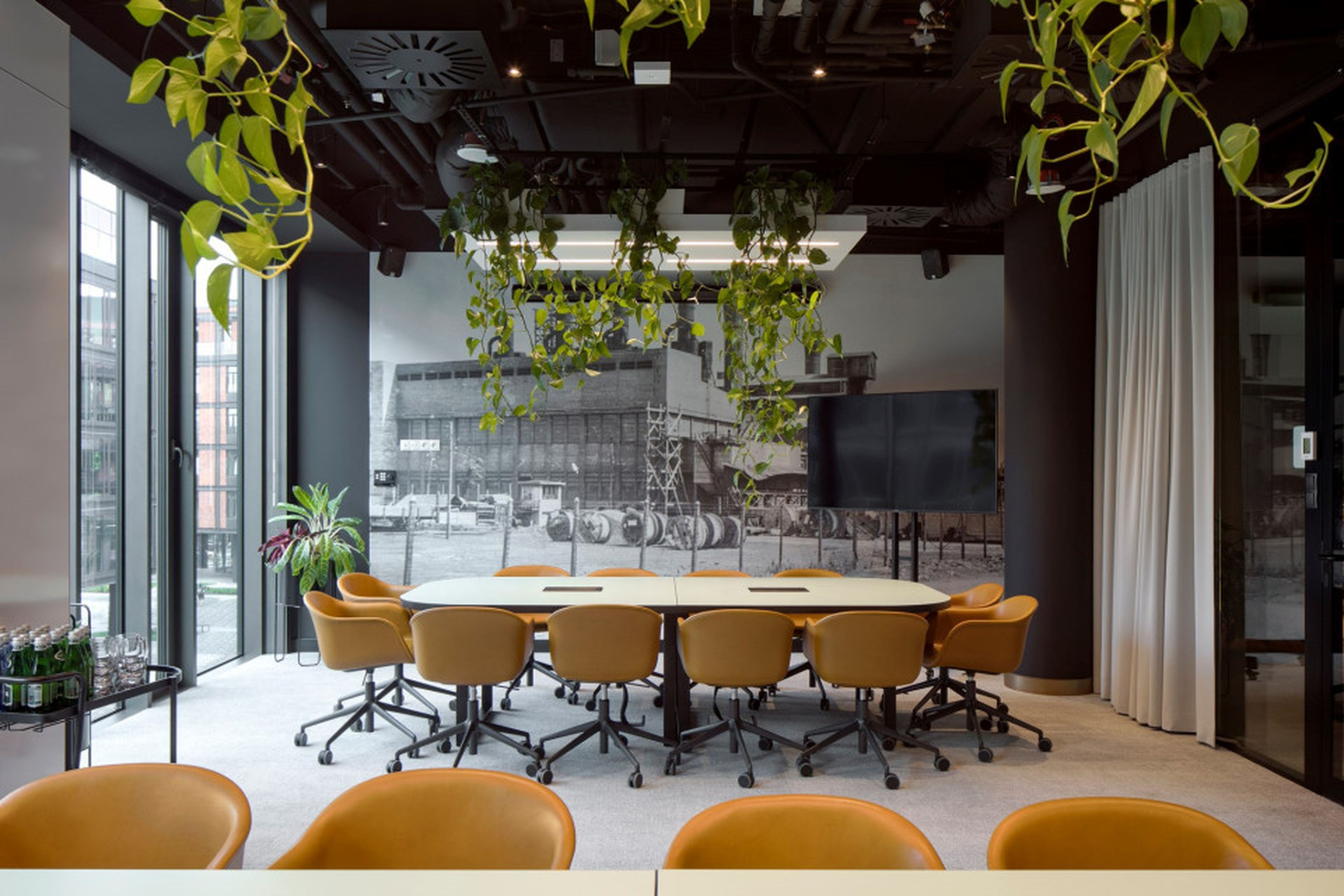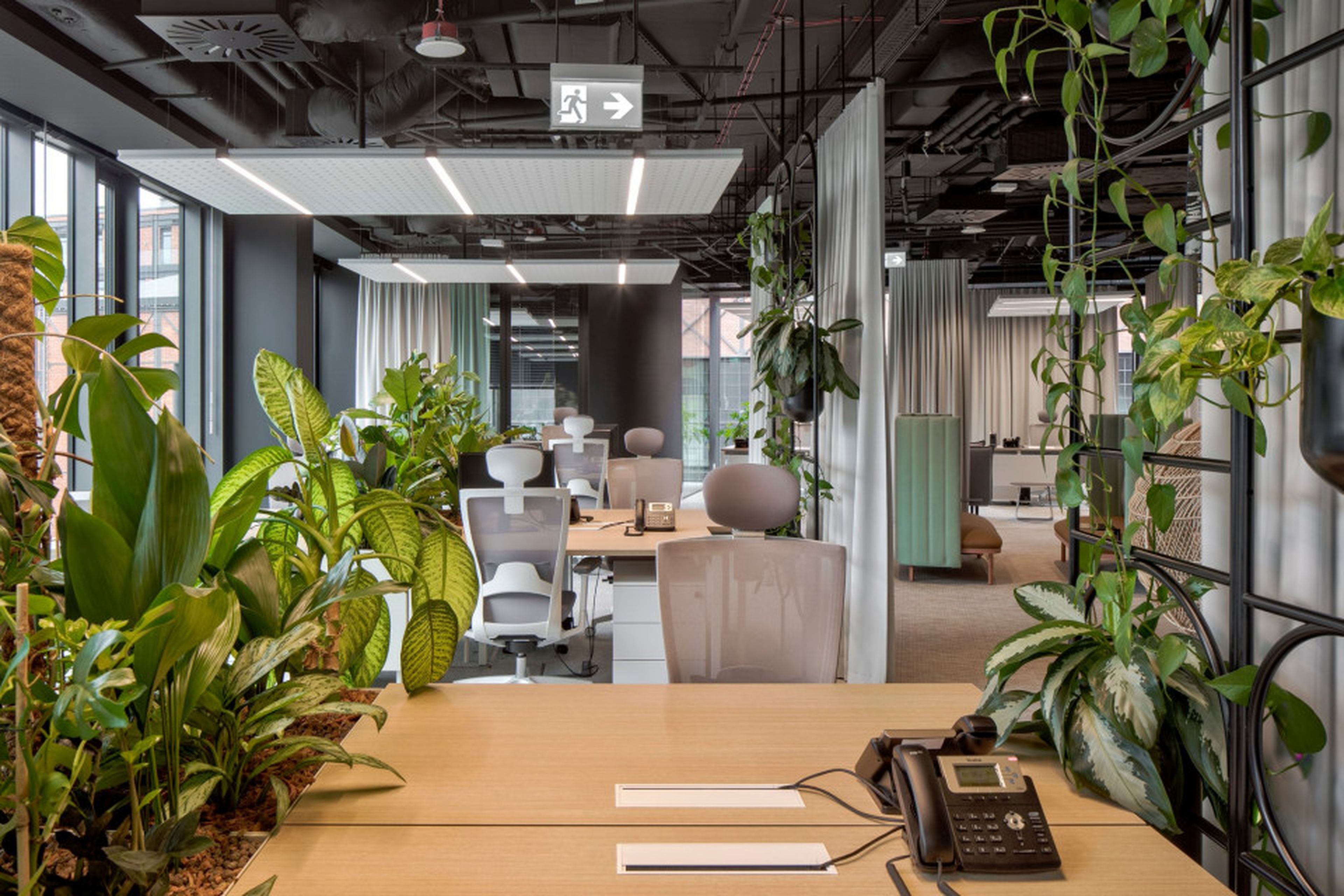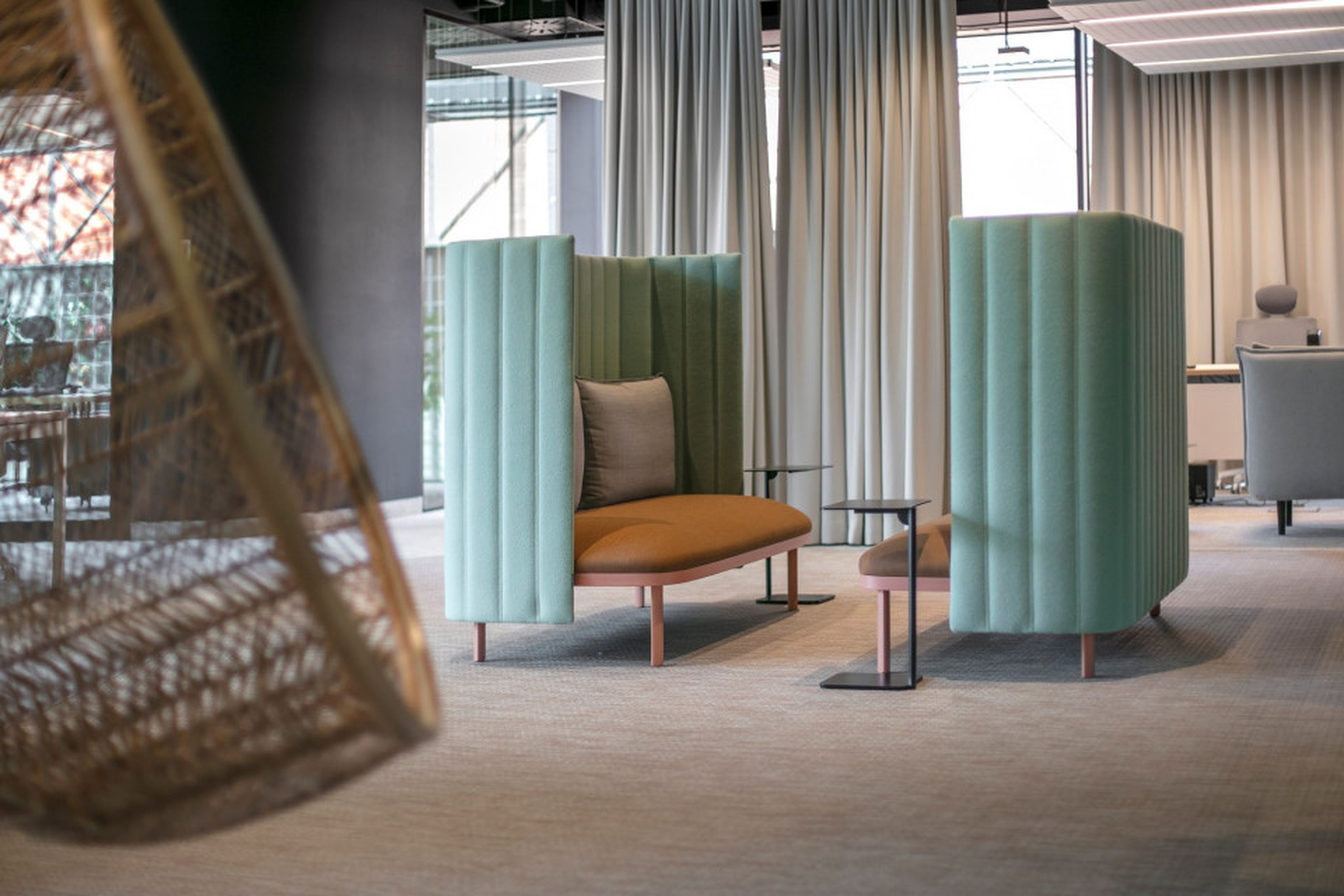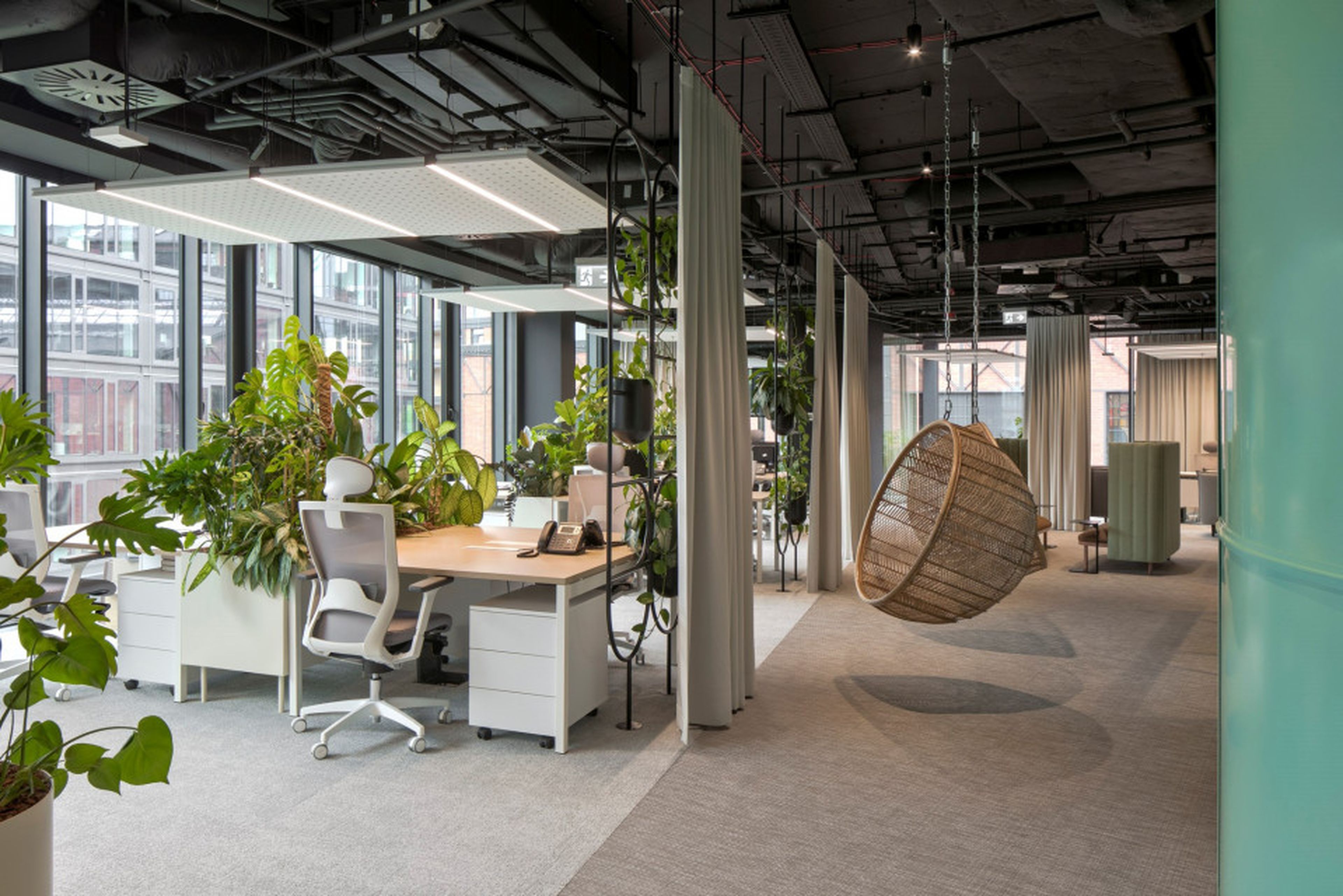 Szczególne znaczenie w akustycznym kształtowaniu przestrzeni odgrywa sufit. Tutaj zastosowanie znalazły nasze charakterystyczne wyspy sufitowe EcoCloud. Geometryczna forma, jasny kolor i zintegrowane oświetlenie. Rozmieszczone strategicznie nad stanowiskami oraz stołami konferencyjnymi. Wysokie właściwości pochłaniania dźwięku poprawiają komfort pracy w otwartych strefach, ograniczając pogłos i wspierając skupienie.