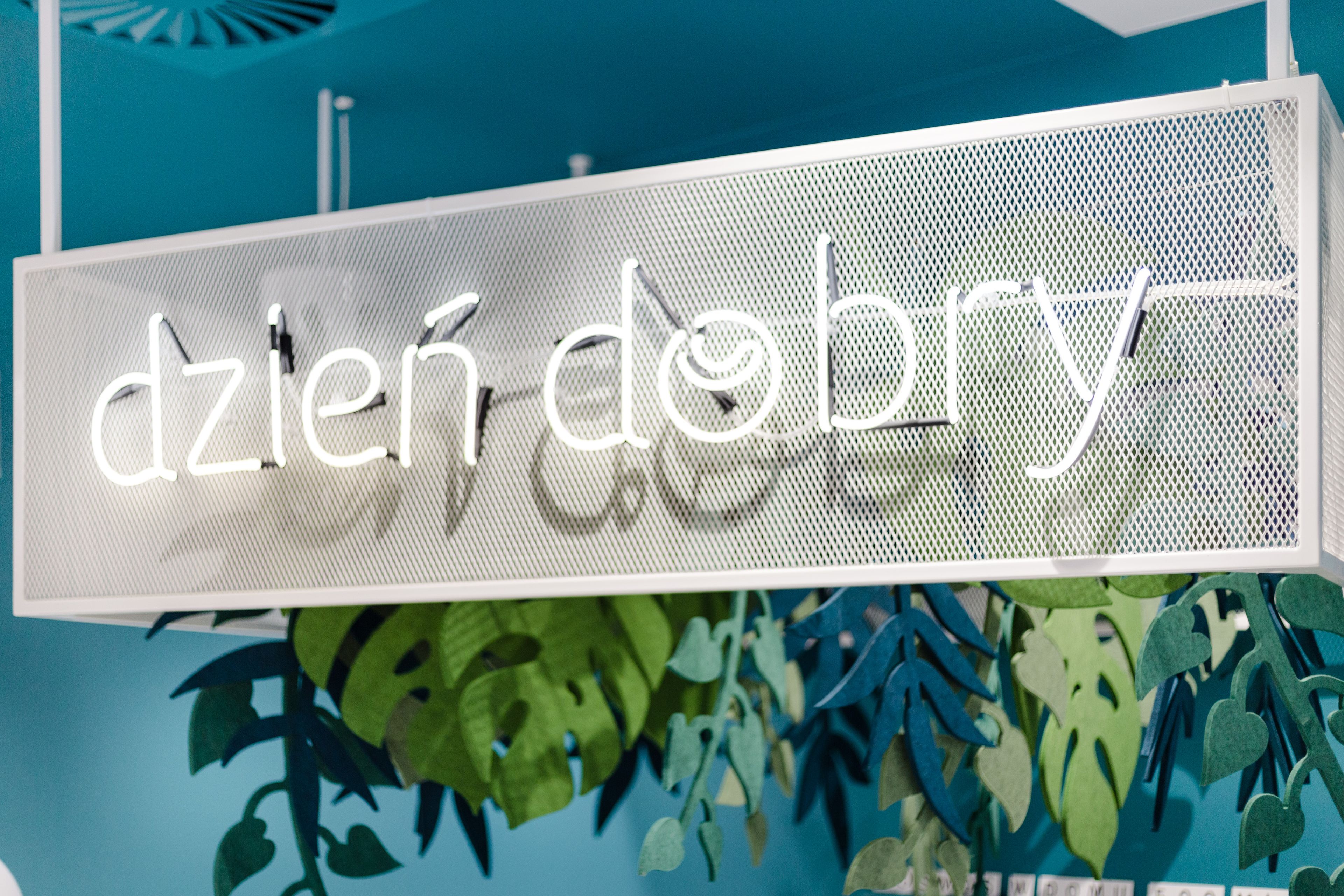 Zastosowane dekoracyjne liście z PET, poza ciekawym designem, wspierają ograniczenie pogłosu, co jest szczególnie istotne w dynamicznym wnętrzu. Całość tworzy spójną, lekką kompozycję, która sprzyja swobodnej komunikacji i pozytywnemu odbiorowi miejsca przez użytkowników.
