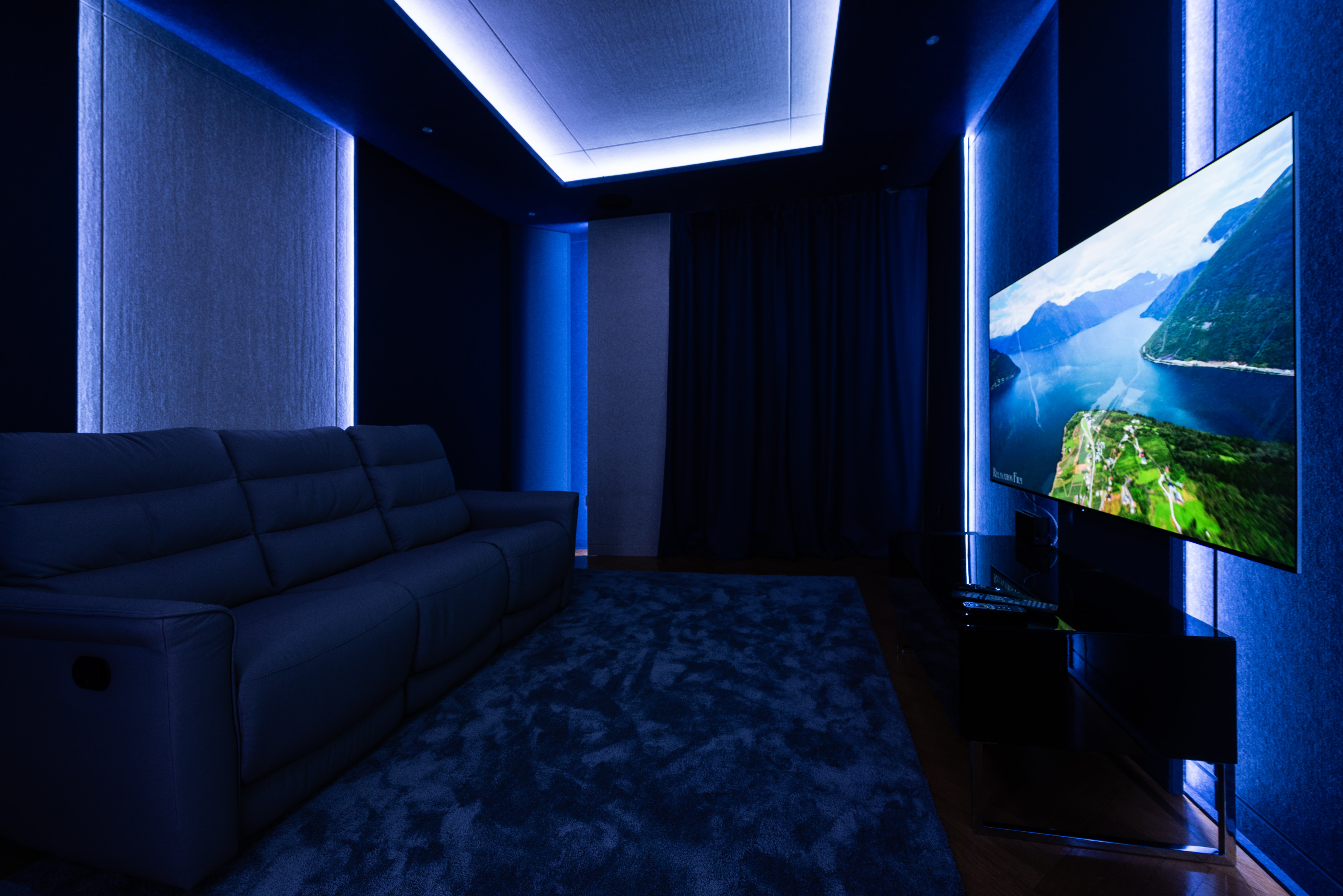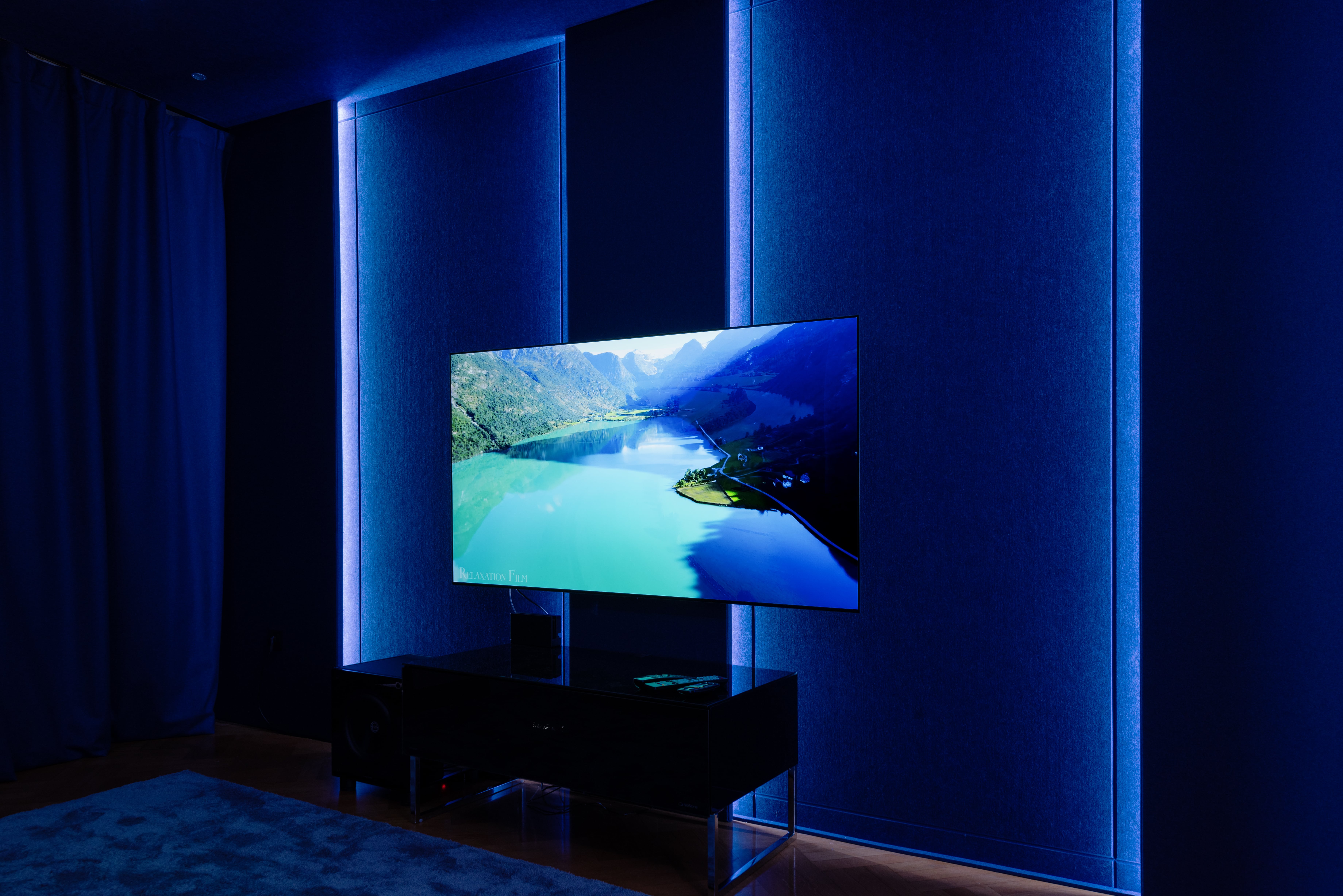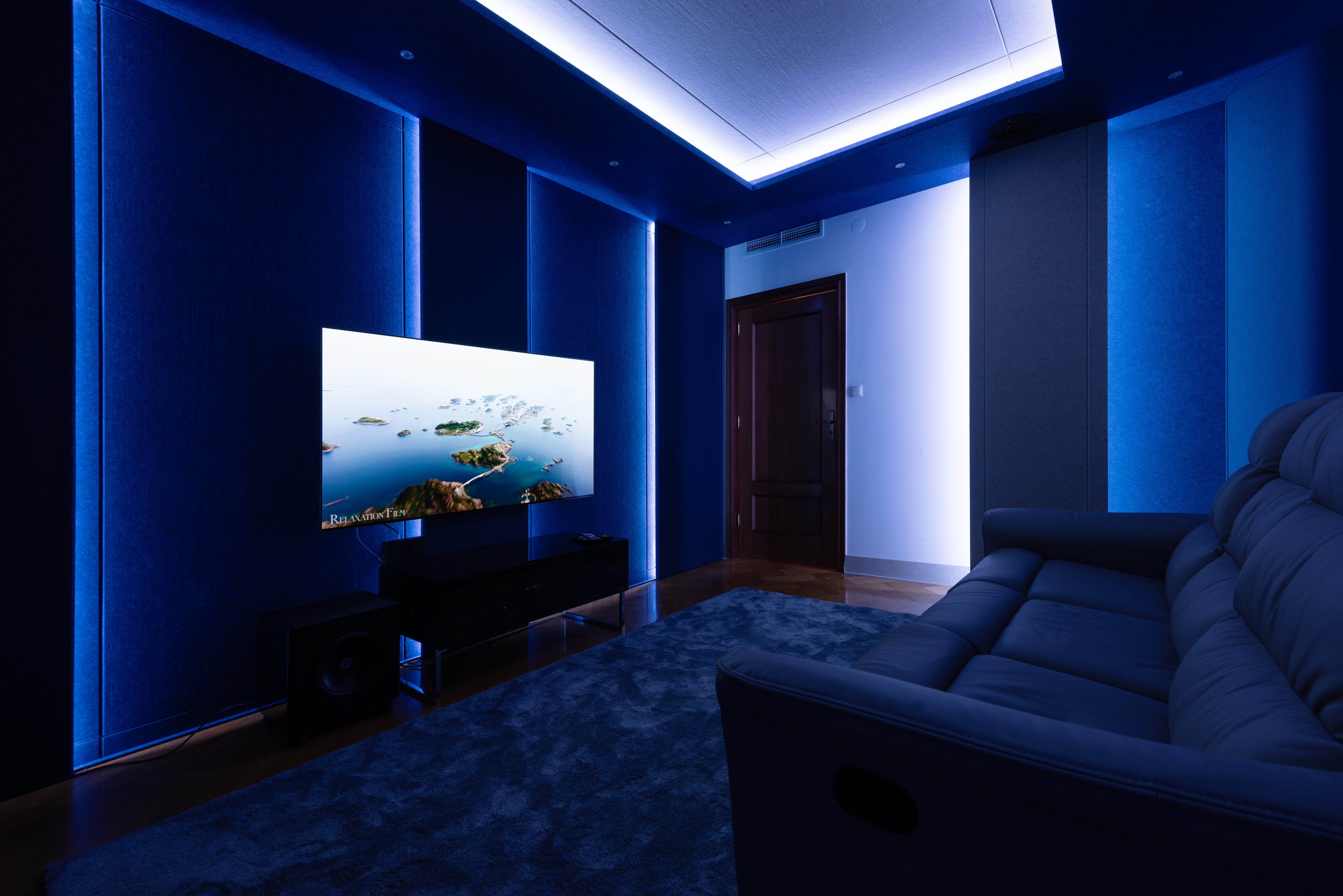 Całość tworzy przestrzeń dopracowaną w każdym detalu. Od pierwszych sekund seansu: scena jest stabilna, dialog czytelny, bas kontrolowany, a obraz i dźwięk funkcjonują dokładnie tak, jak zostały zaplanowane przez twórców. Stonowana kolorystyka paneli, miękkie faktury materiałów oraz zintegrowane podświetlenie LED wzmacniają ogólny kinowy klimat. Oświetlenie prowadzone wzdłuż paneli dyskretnie maskuje elementy techniczne.