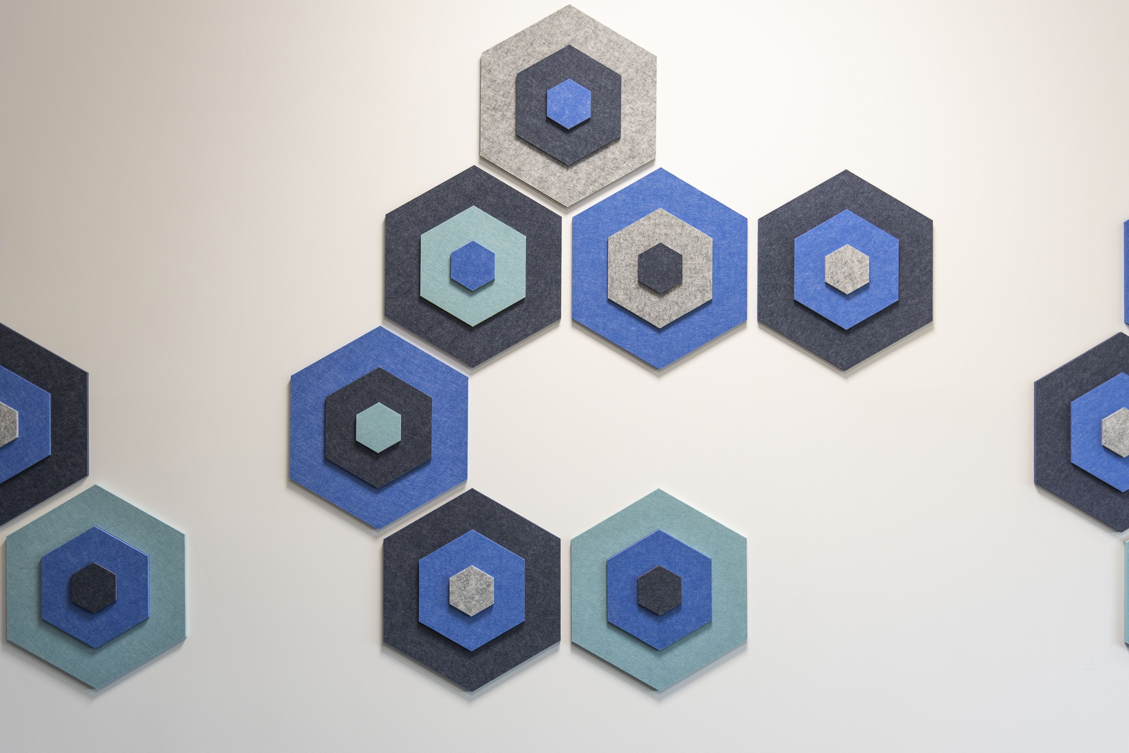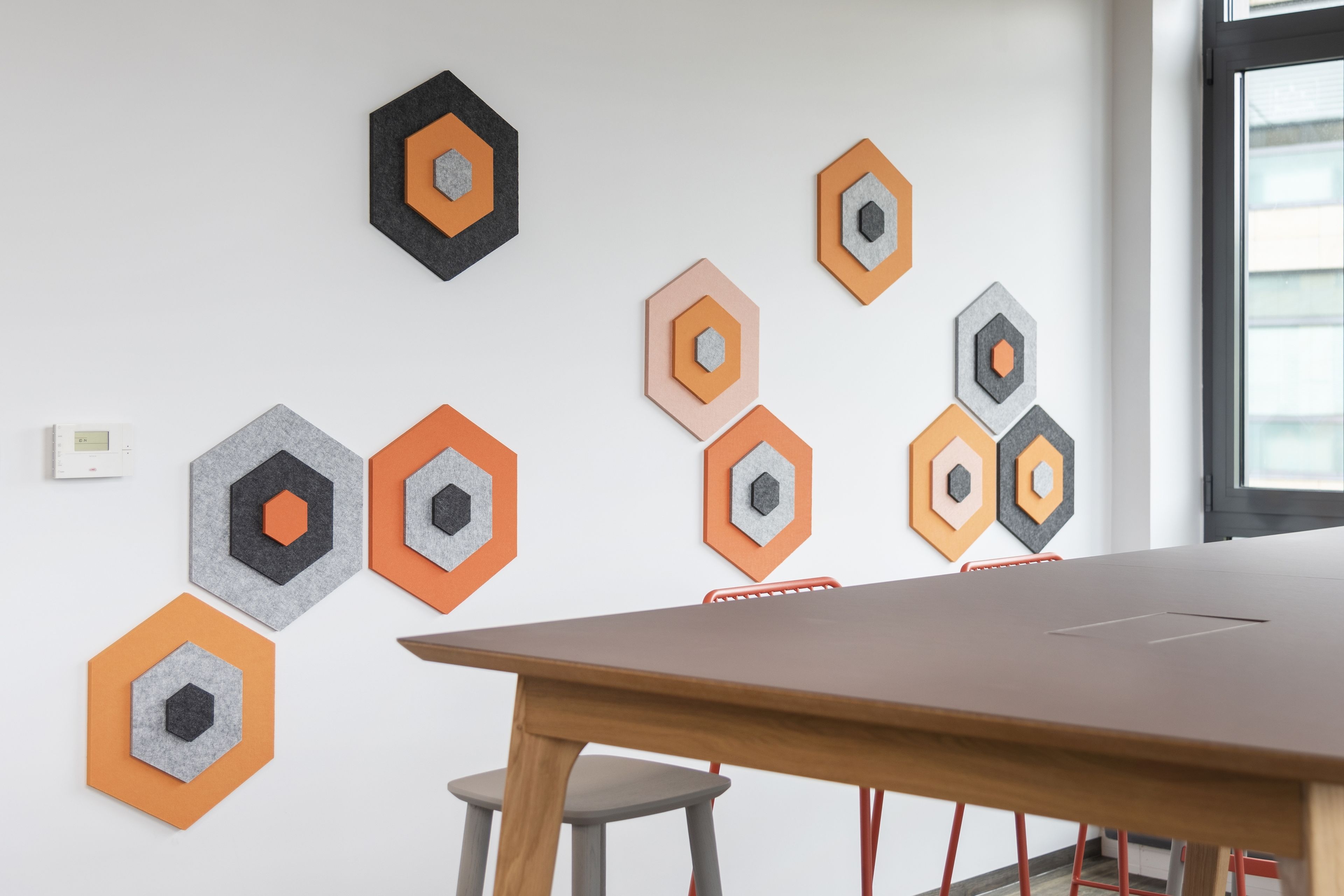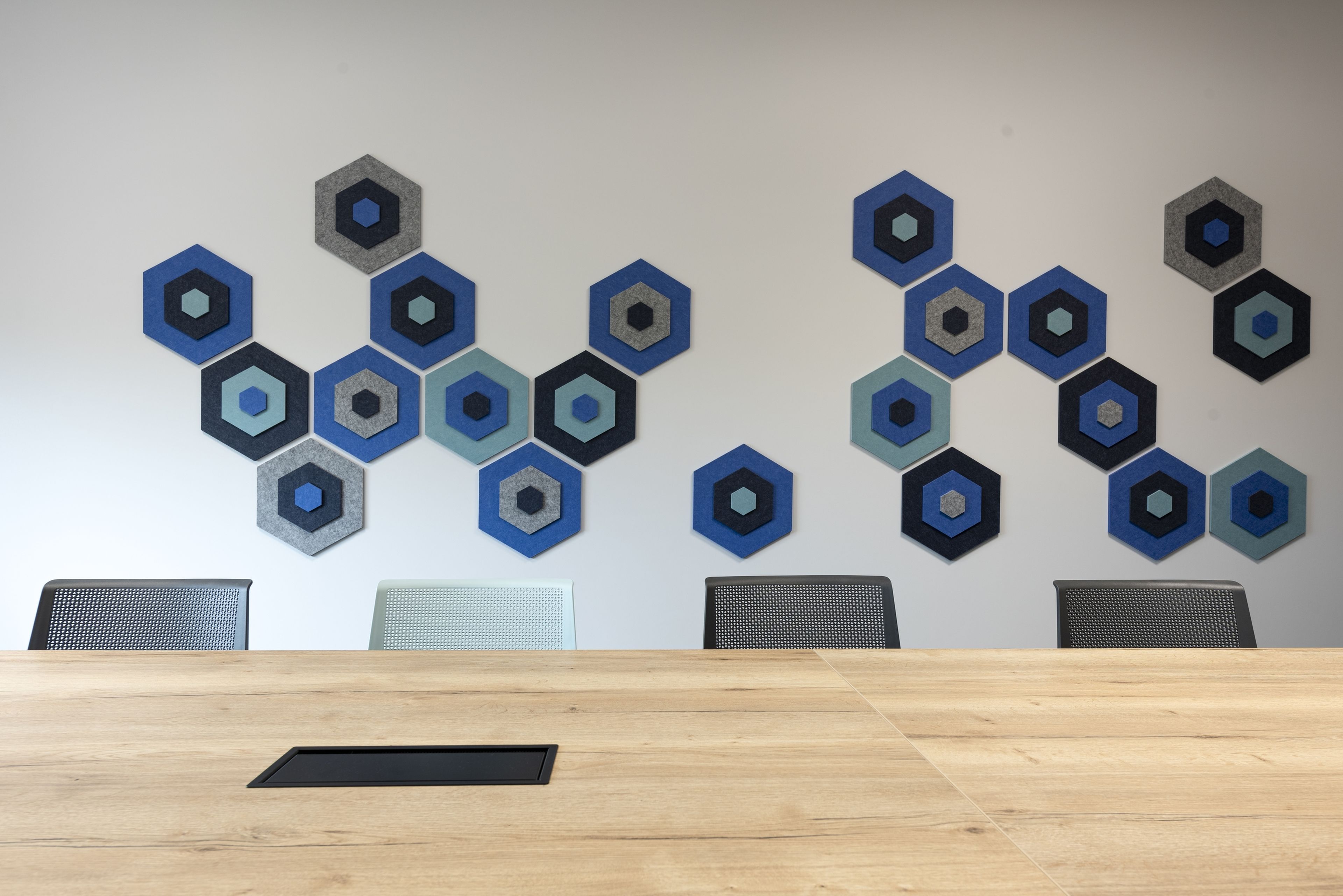 Geometryczne heksagny stały się motywem przewodnim adaptacji biura Waters. W salach konferencyjnych pojawiają się na ścianach jako panele EcoTiles. Designerska kompozycja przypominająca pawie oko jest jednocześnie lekka w formie i wyrazista w charakterze. Wykonane ze sprasowanej wełny poliestrowej odzyskiwanej w procesie recyklingu butelek PET o wysokim współczynniku pochłaniania dźwięku. Są przyjazne dla środowiska i zdrowia, a także odporne na uszkodzenia mechaniczne i kurz.