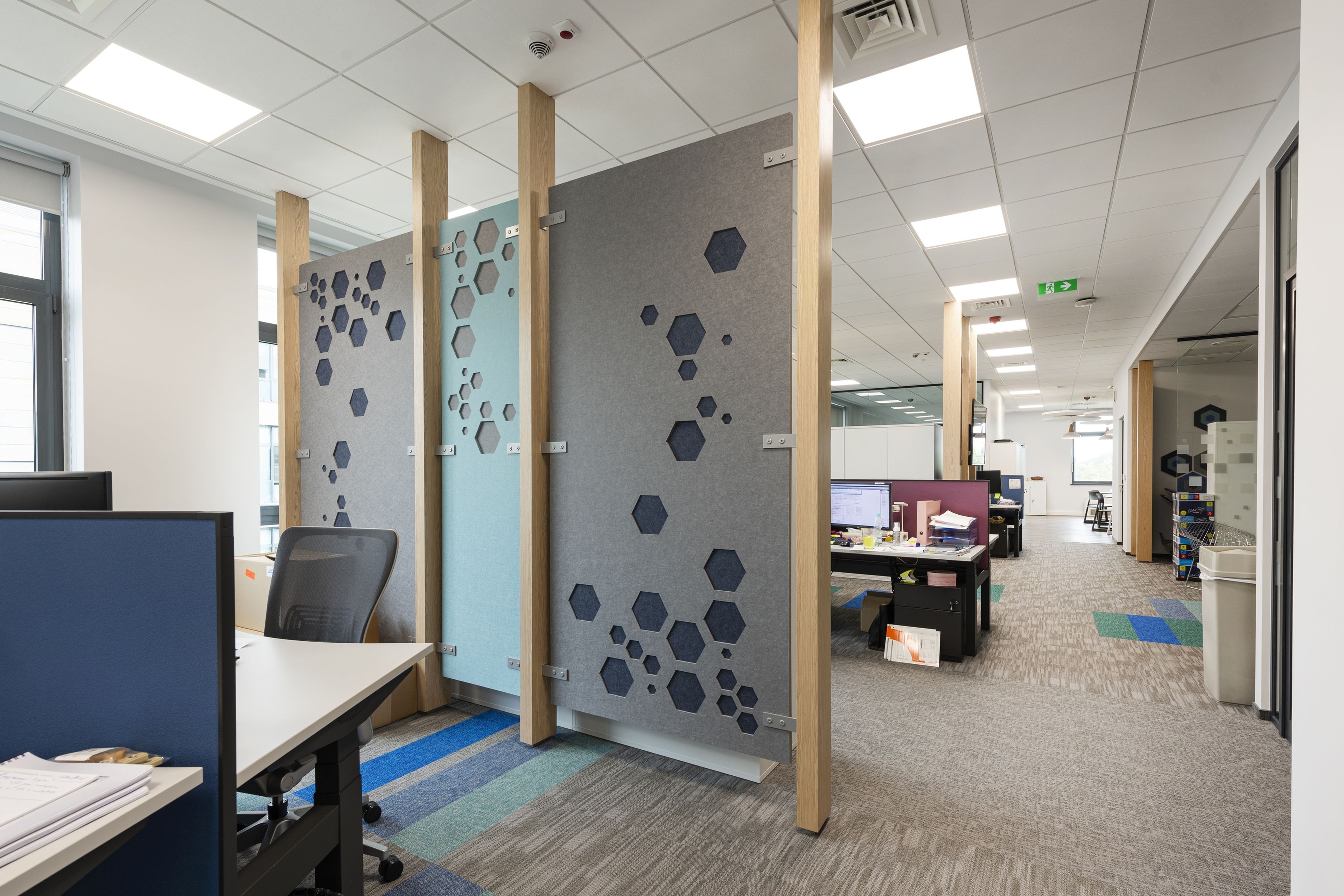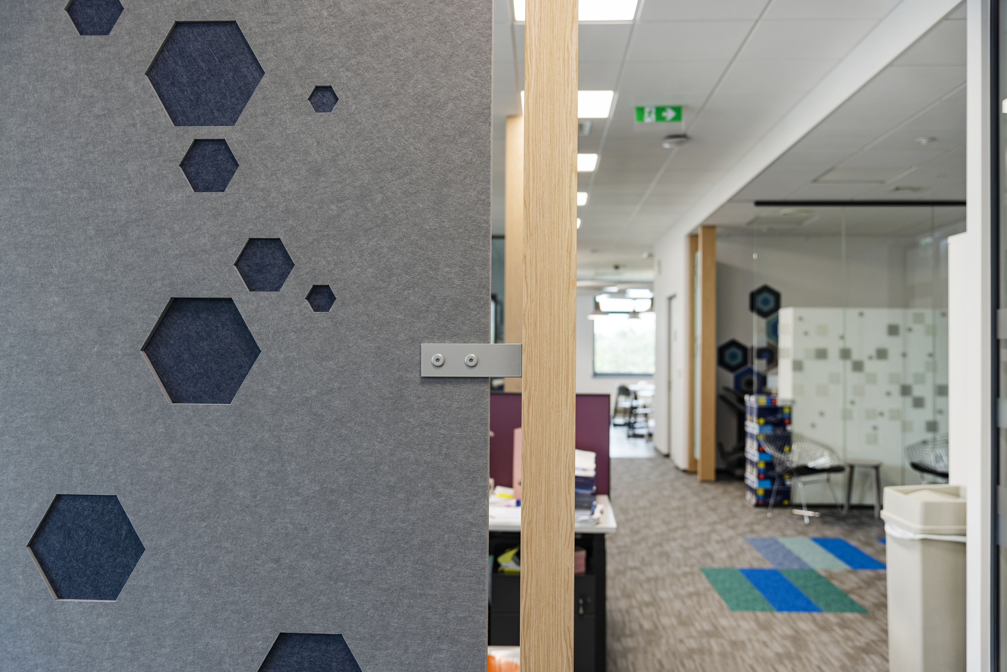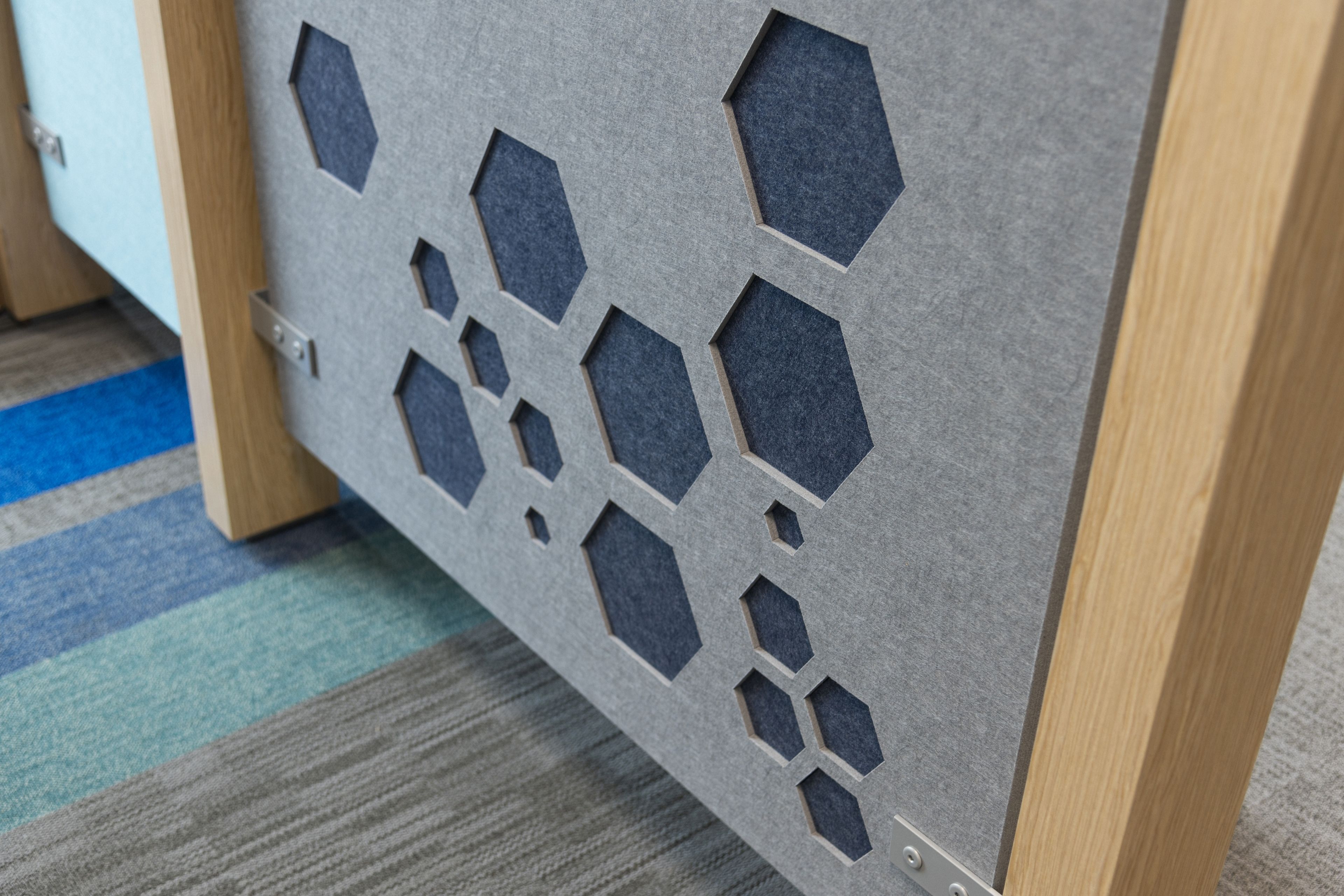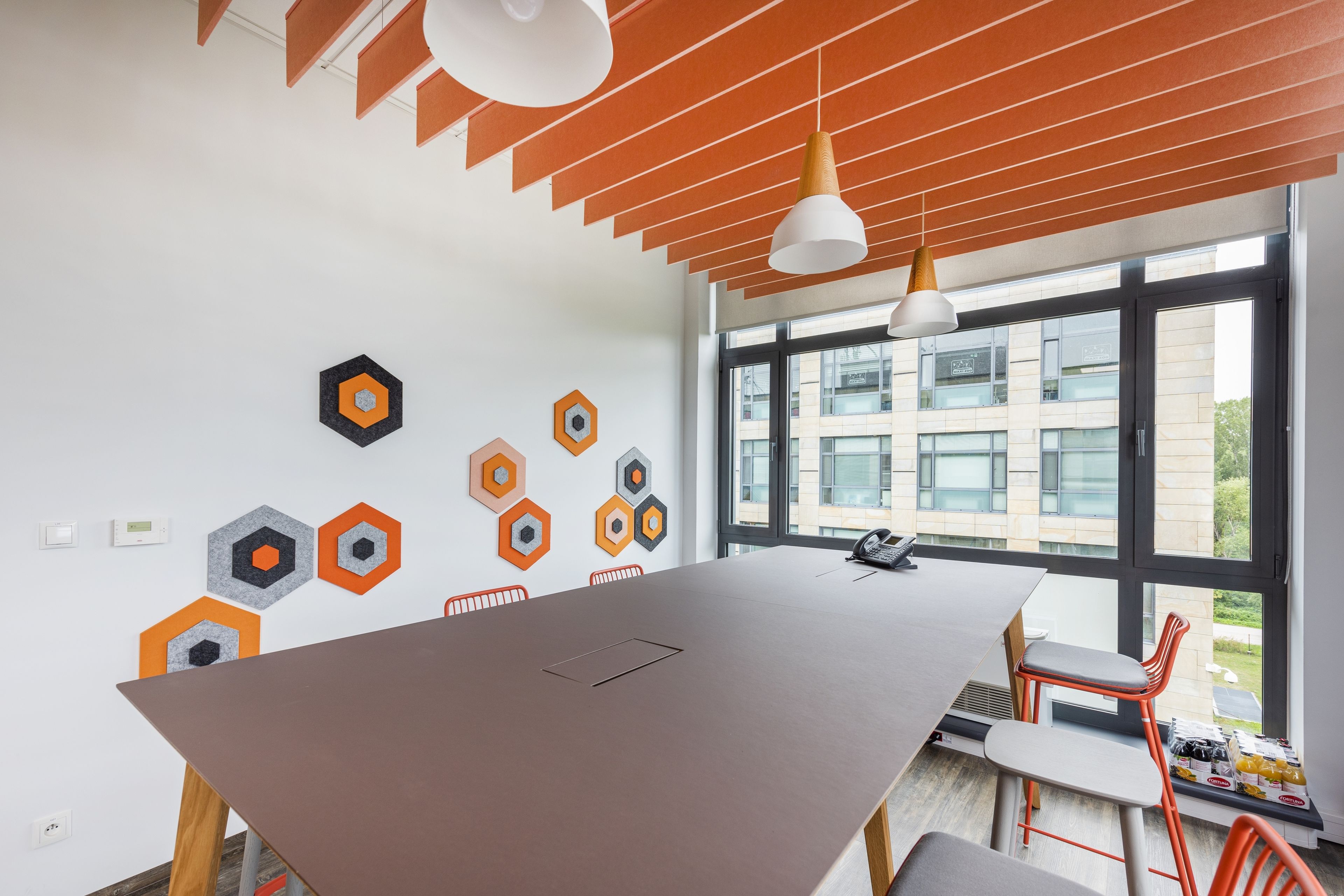 Geometryczne heksagny stały się motywem przewodnim adaptacji biura Waters. W salach konferencyjnych pojawiają się na ścianach jako panele EcoTiles. Designerska kompozycja przypominająca pawie oko jest jednocześnie lekka w formie i wyrazista w charakterze. Wykonane ze sprasowanej wełny poliestrowej odzyskiwanej w procesie recyklingu butelek PET o wysokim współczynniku pochłaniania dźwięku. Są przyjazne dla środowiska i zdrowia, a także odporne na uszkodzenia mechaniczne i kurz.